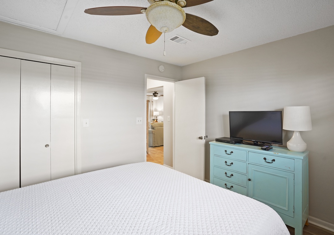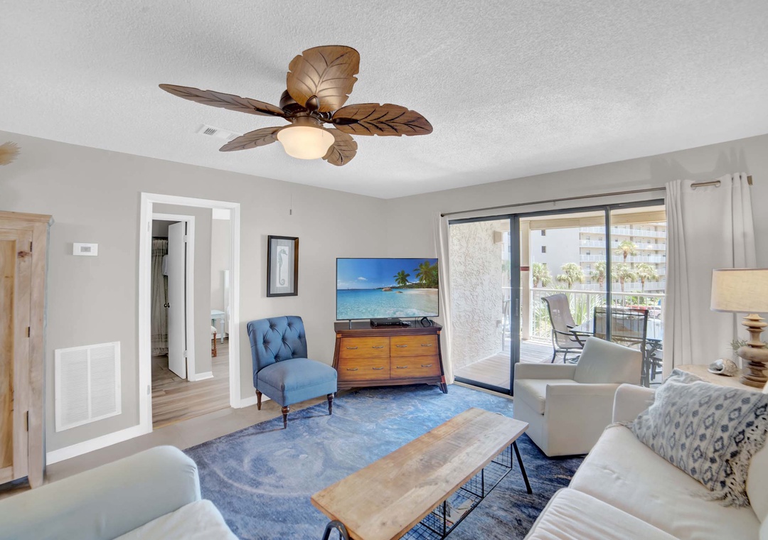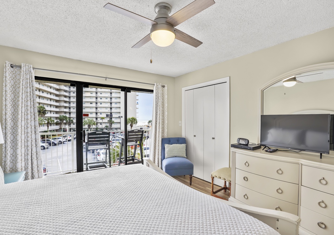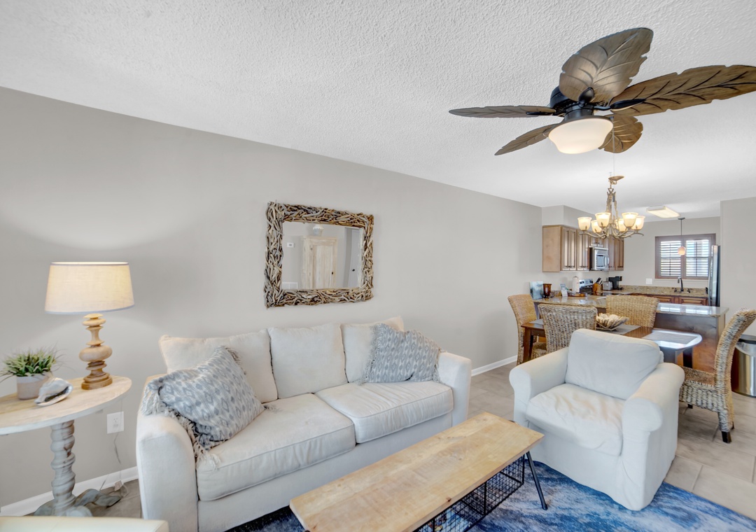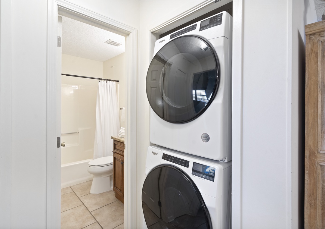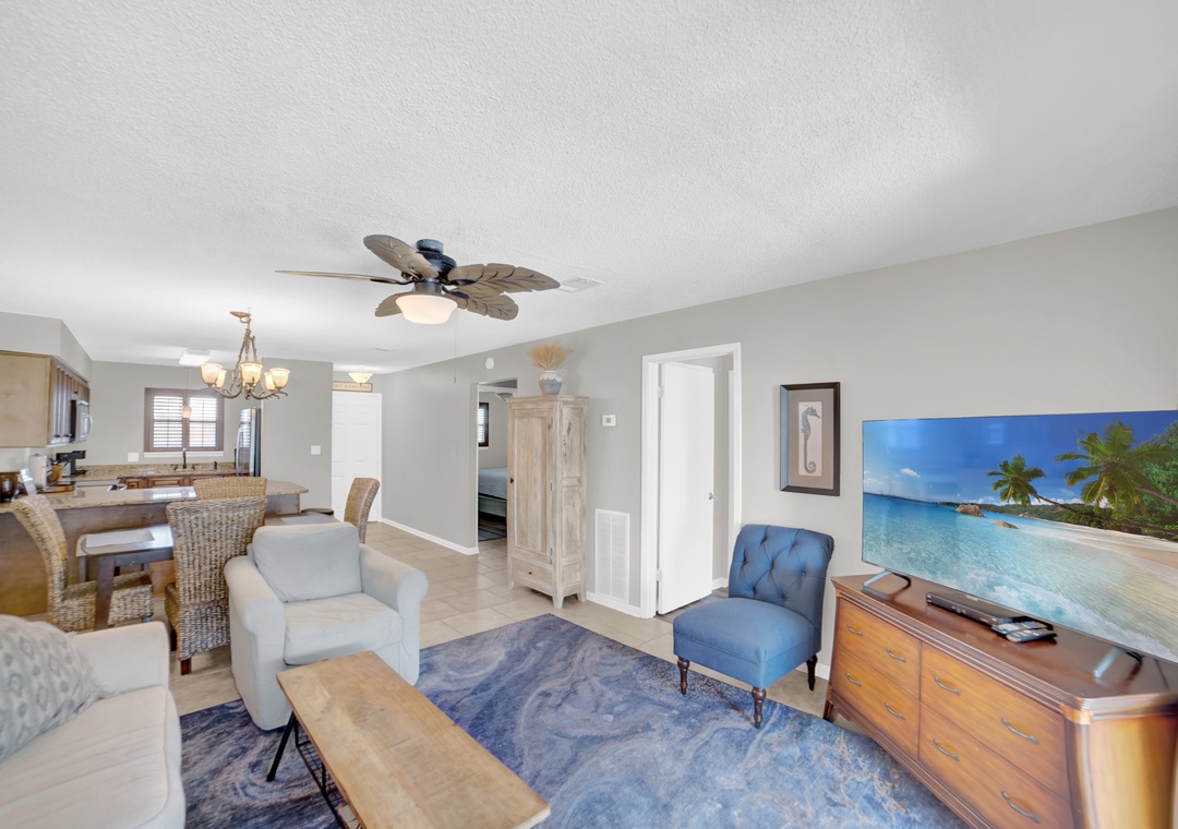 The guest room is equally comfortable, appointed with a cozy Queen bed and a flat-screen TV, perfect for a peaceful night’s rest. The living area centers around comfort, with a sofa sleeper for additional guests and a flat-screen TV for shared entertainment. From here, step out onto the private balcony to bask in the coastal ambiance that makes this unit so special. For those who love to cook, the fully equipped kitchen has all the essentials for quick breakfasts or gourmet meals. The in-unit washer and dryer add convenience to your stay, keeping your beachwear fresh.