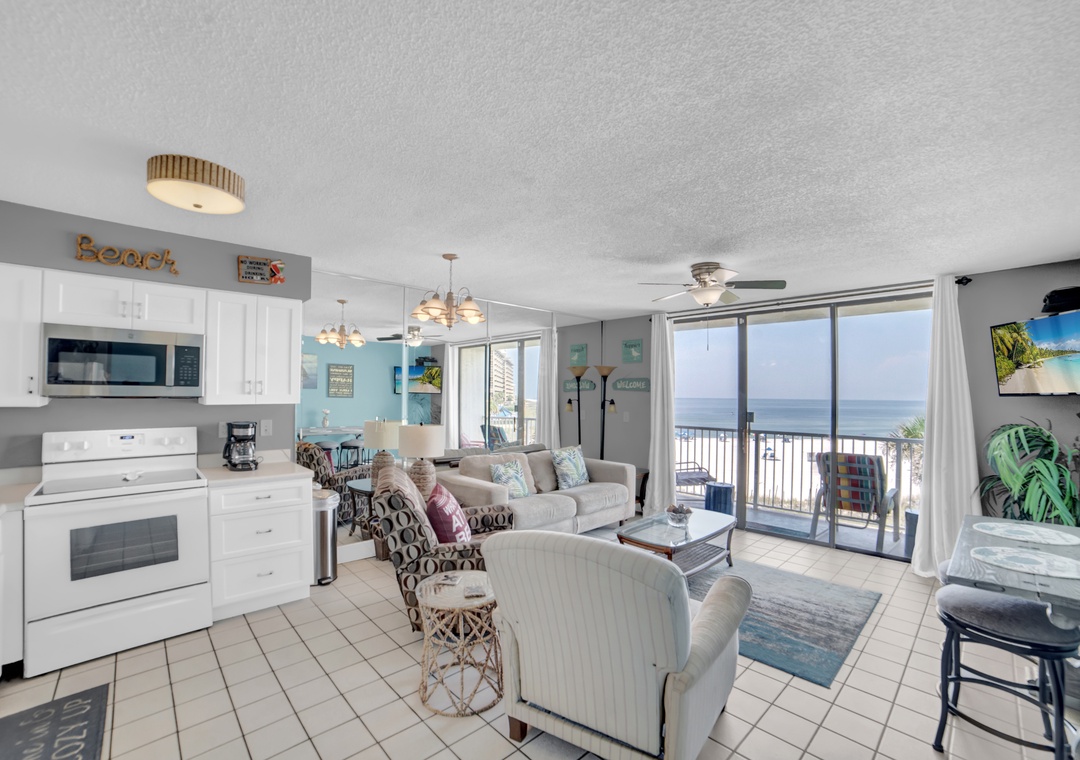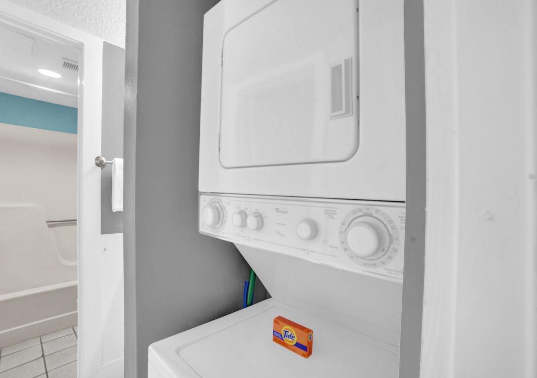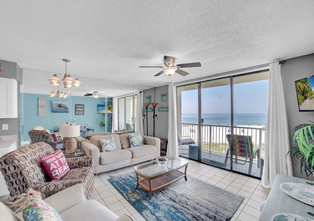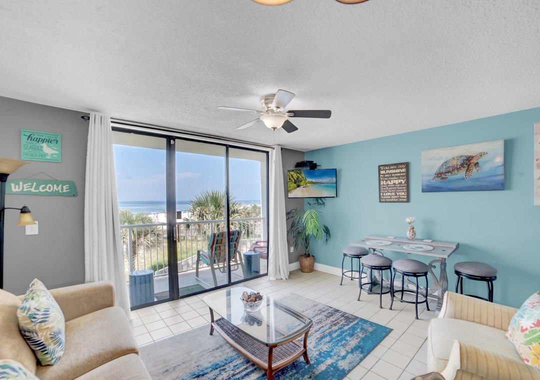 The Primary suite is a cozy haven with a comfortable Queen bed and a flat-screen TV—perfect for unwinding after a day of beach fun. The room’s inviting ambiance ensures restful nights and sweet dreams. In the heart of the condo is a fully equipped kitchen with all the essentials for meal preparation. Whether you’re brewing morning coffee or cooking dinner, it’s all right at your fingertips. The living room is designed for comfort and convenience, featuring a sofa sleeper with a 4-inch memory foam mattress—ideal for extra guests. Watch your favorite shows on the flat-screen TV or step out onto the private balcony to soak in the stunning Gulf views. An in-unit washer and dryer adds even more convenience, making it easy to keep your beachwear fresh for your next adventure.