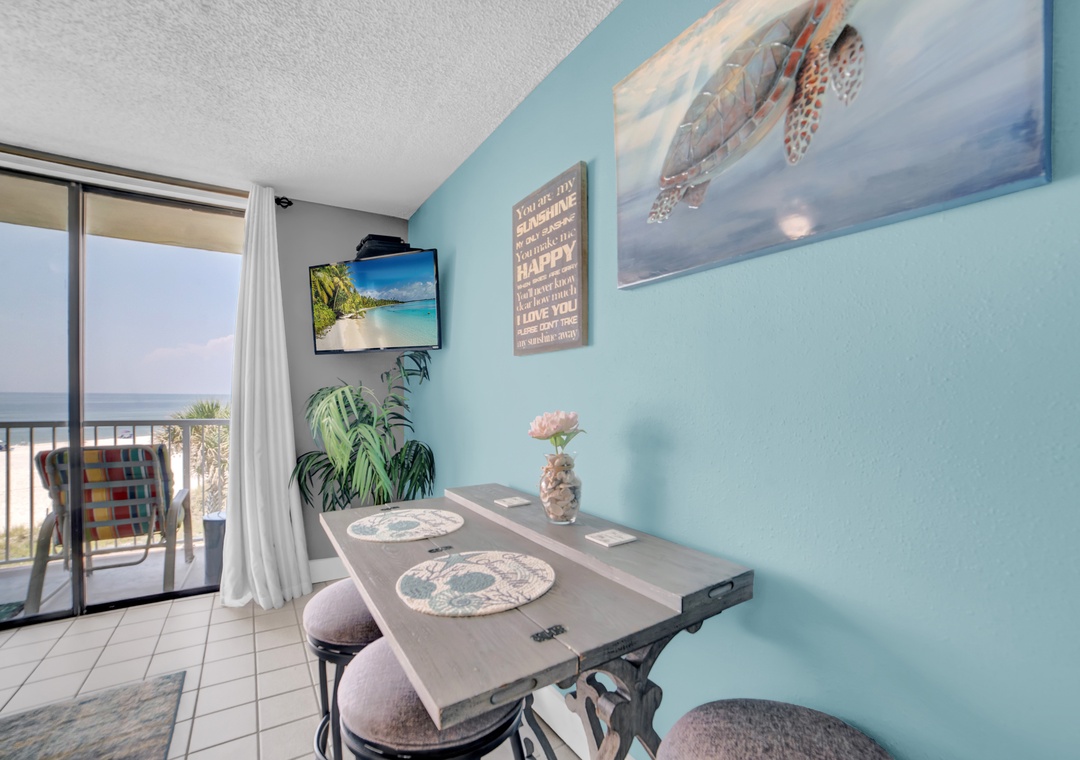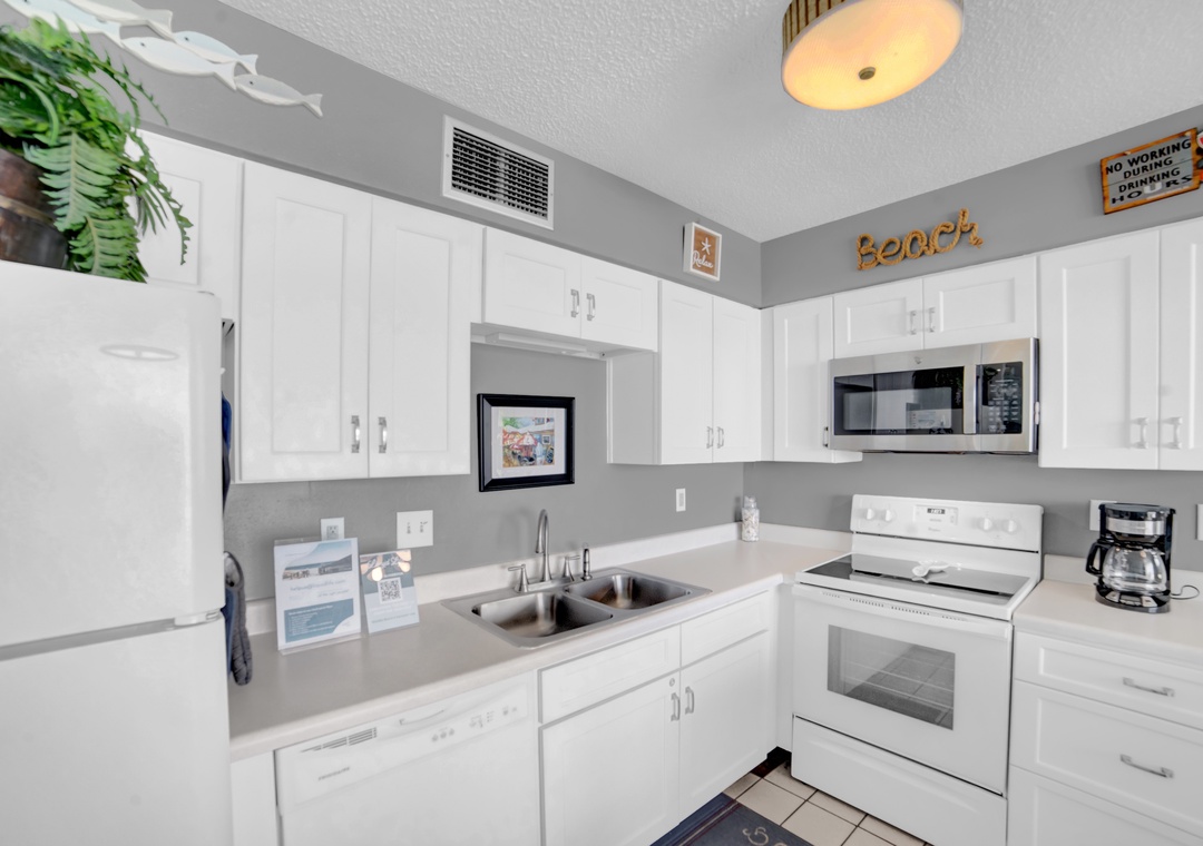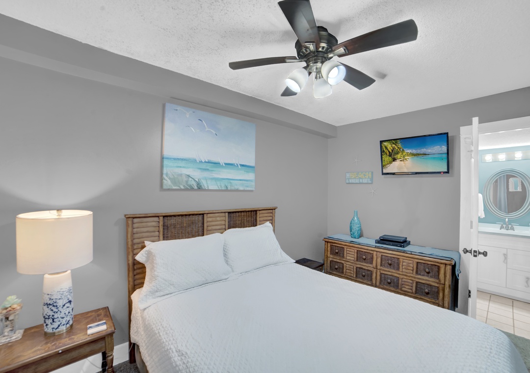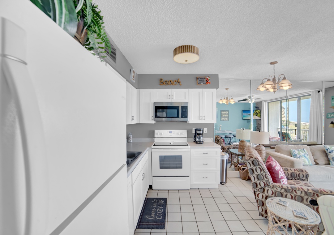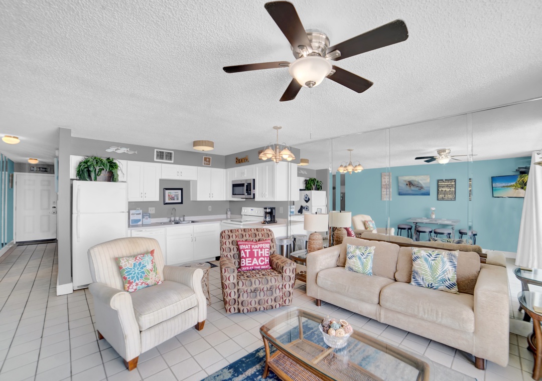 The Primary suite is a cozy haven with a comfortable Queen bed and a flat-screen TV—perfect for unwinding after a day of beach fun. The room’s inviting ambiance ensures restful nights and sweet dreams. In the heart of the condo is a fully equipped kitchen with all the essentials for meal preparation. Whether you’re brewing morning coffee or cooking dinner, it’s all right at your fingertips. The living room is designed for comfort and convenience, featuring a sofa sleeper with a 4-inch memory foam mattress—ideal for extra guests. Watch your favorite shows on the flat-screen TV or step out onto the private balcony to soak in the stunning Gulf views. An in-unit washer and dryer adds even more convenience, making it easy to keep your beachwear fresh for your next adventure.