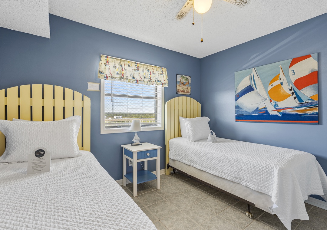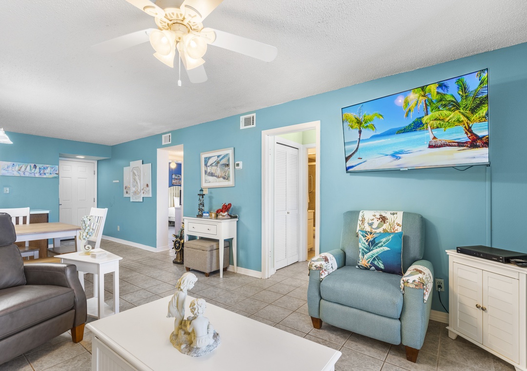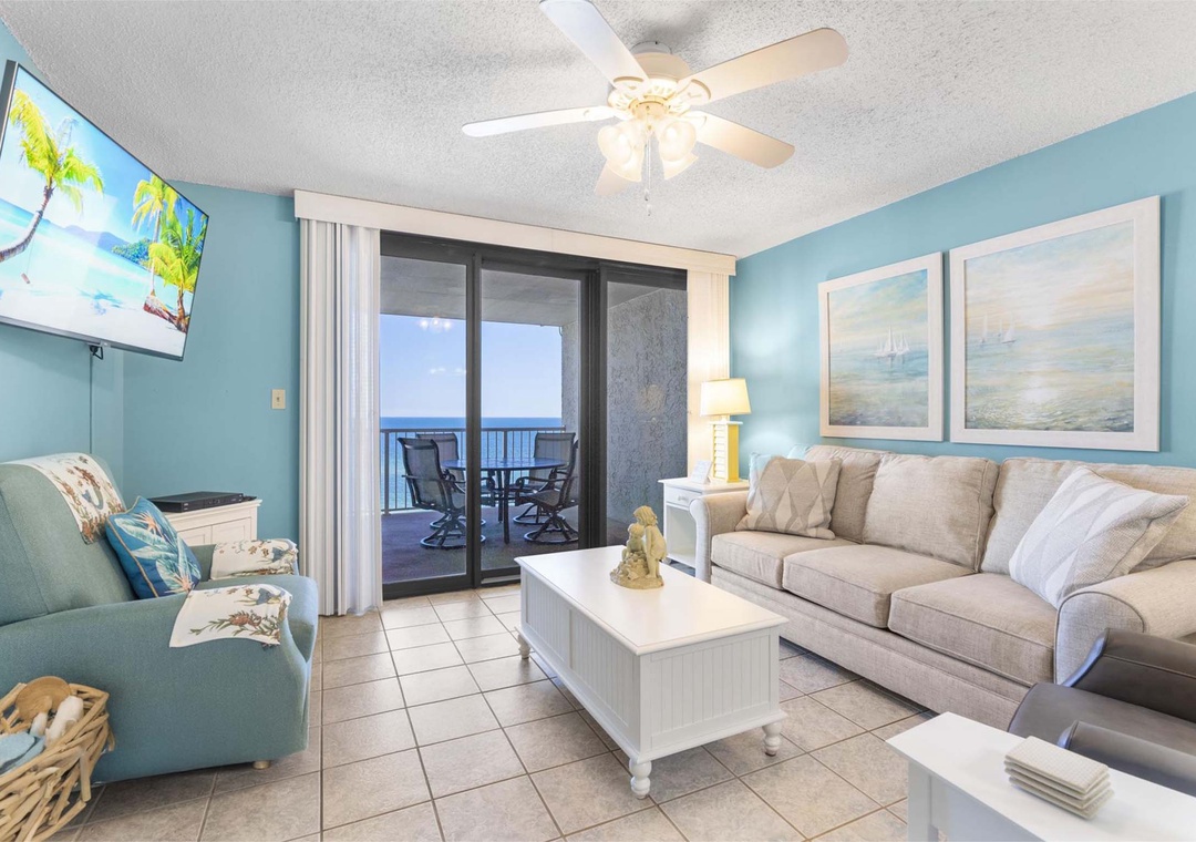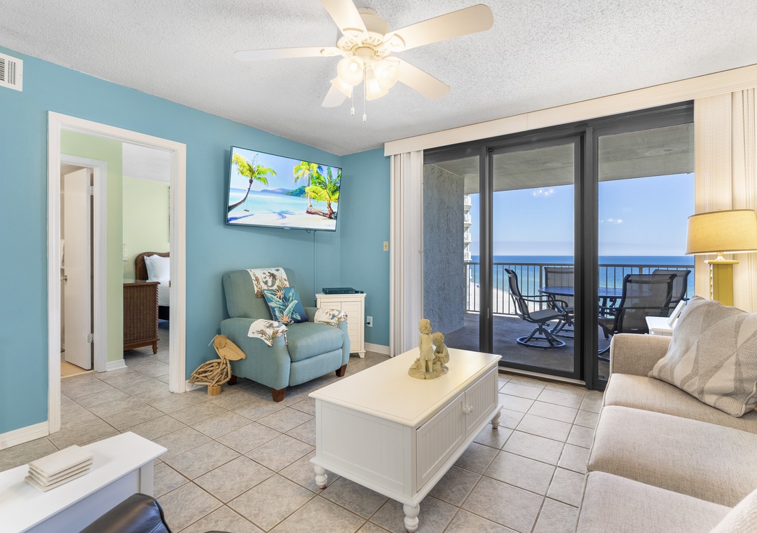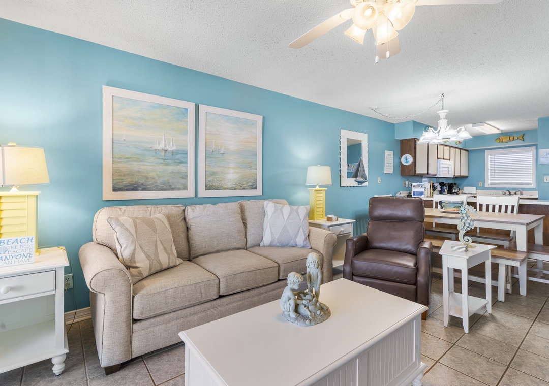 The Primary suite features a plush King bed, private bath, and direct balcony access, while the second bedroom offers two Twin beds, perfect for friends or family. A Queen sofa sleeper in the living room expands sleeping arrangements for up to 6 guests. The living space is thoughtfully arranged for comfort and connection, making it an inviting spot to relax after a day in the sun.