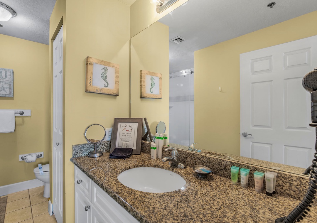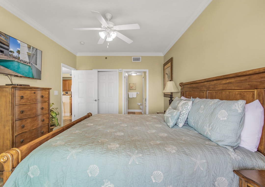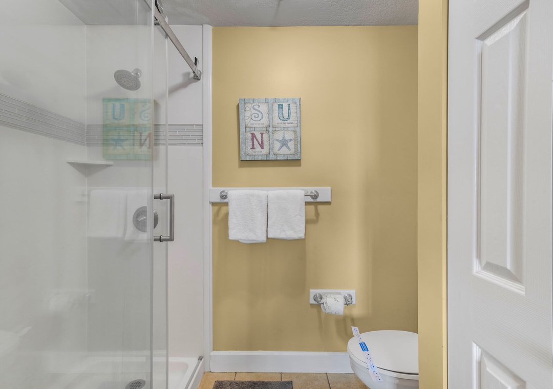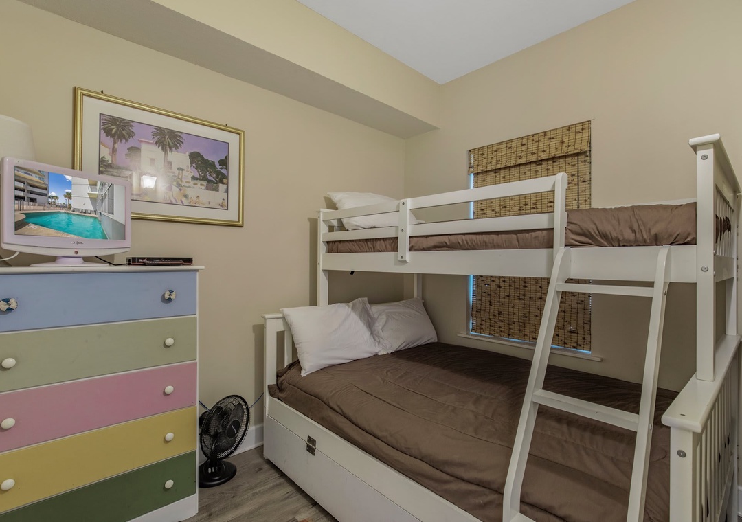 The peaceful main bedroom features a king-size bed with large flat screen TV. The main bedroom has incredible views coming in from the balcony. The en-suite main bathroom features a walk-in shower. The second bedroom features a queen-size bed. The second bathroom has a shower/tub combo. The "bunkroom" features a double-size bed on bottom and twin-size bed on top, the perfect place for the kiddos.