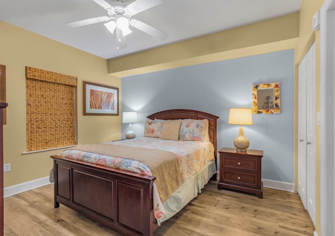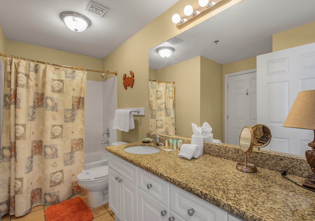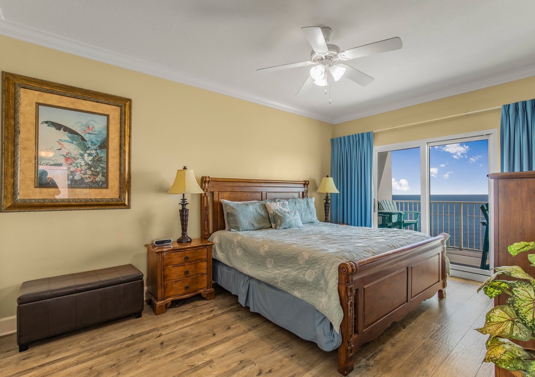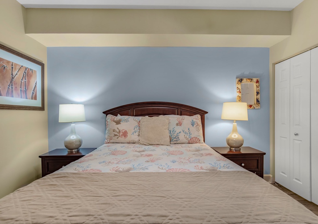 The peaceful main bedroom features a king-size bed with large flat screen TV. The main bedroom has incredible views coming in from the balcony. The en-suite main bathroom features a walk-in shower. The second bedroom features a queen-size bed. The second bathroom has a shower/tub combo. The "bunkroom" features a double-size bed on bottom and twin-size bed on top, the perfect place for the kiddos.