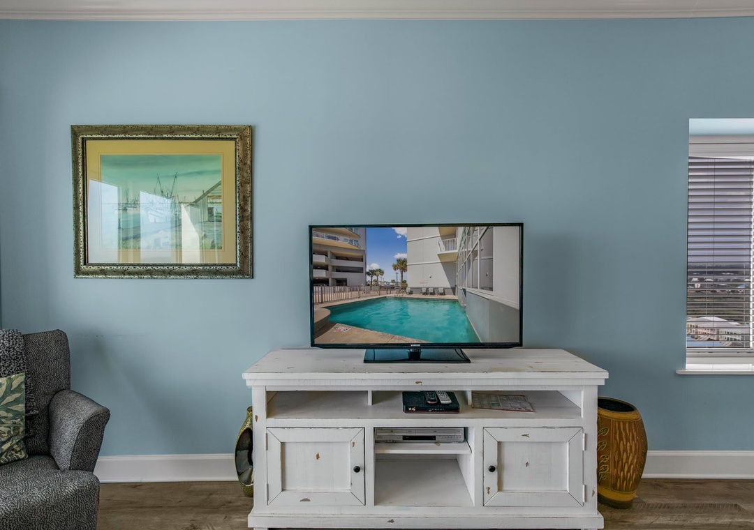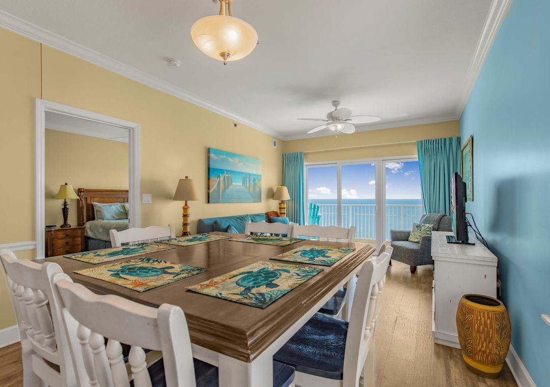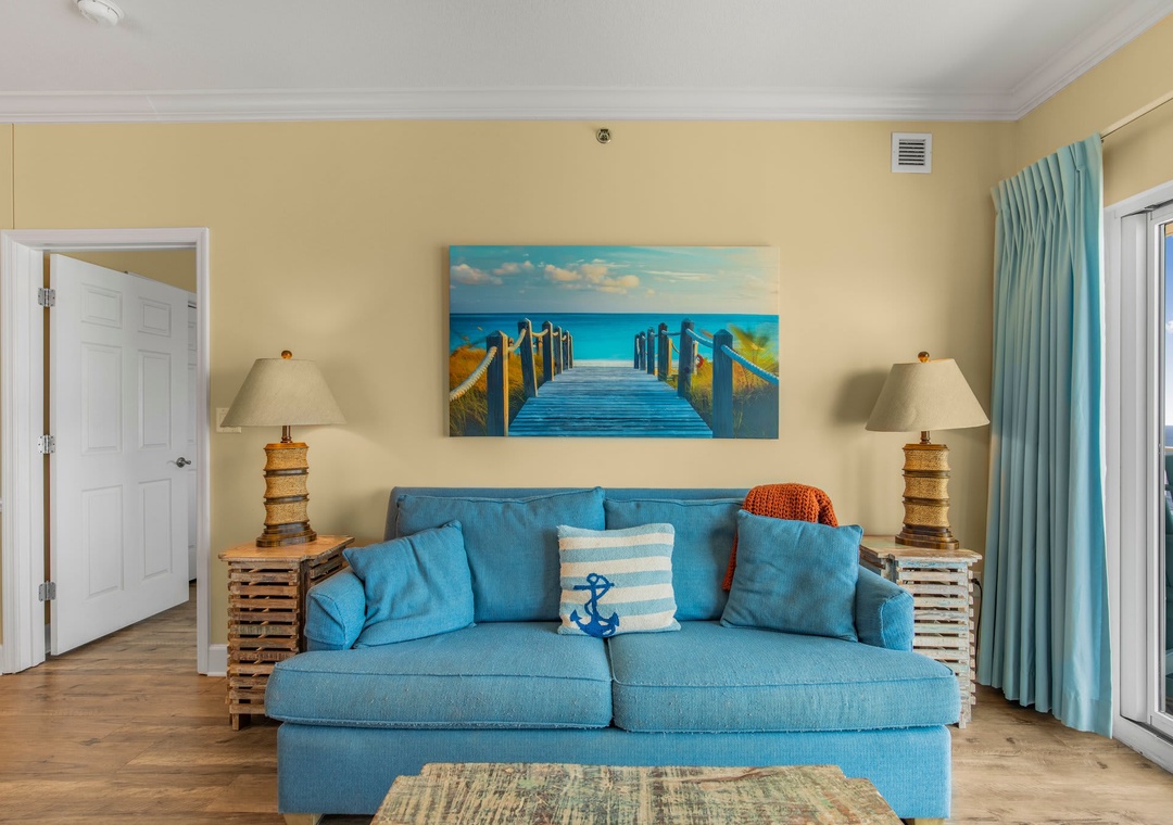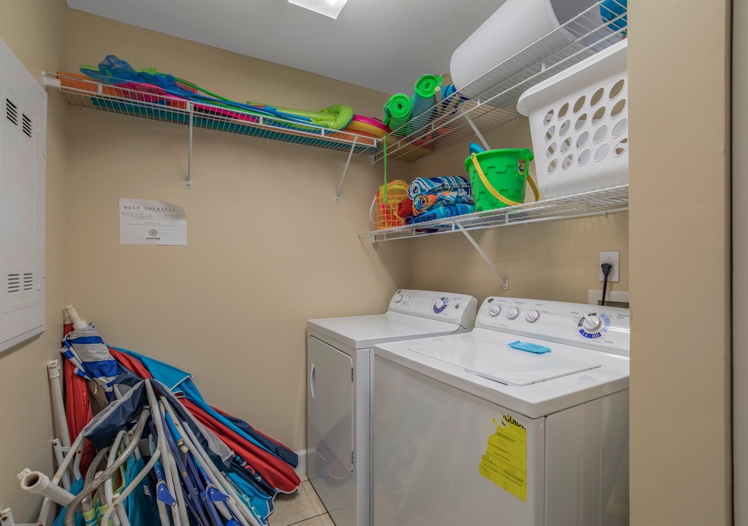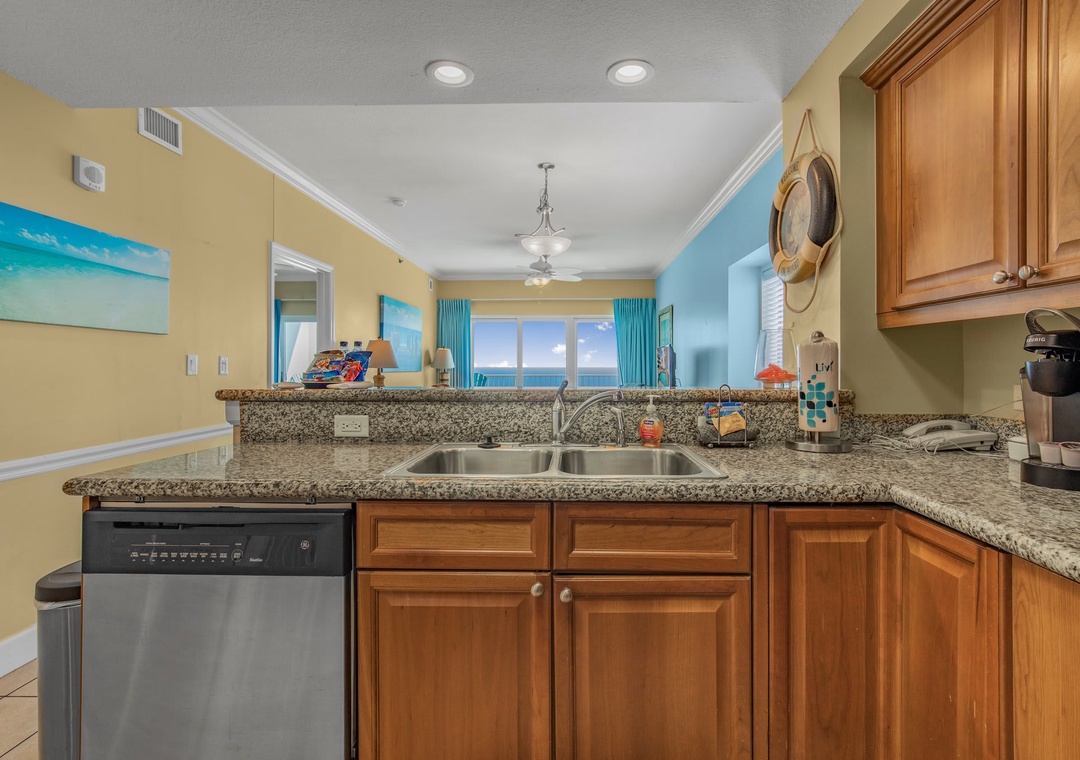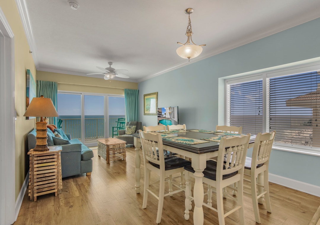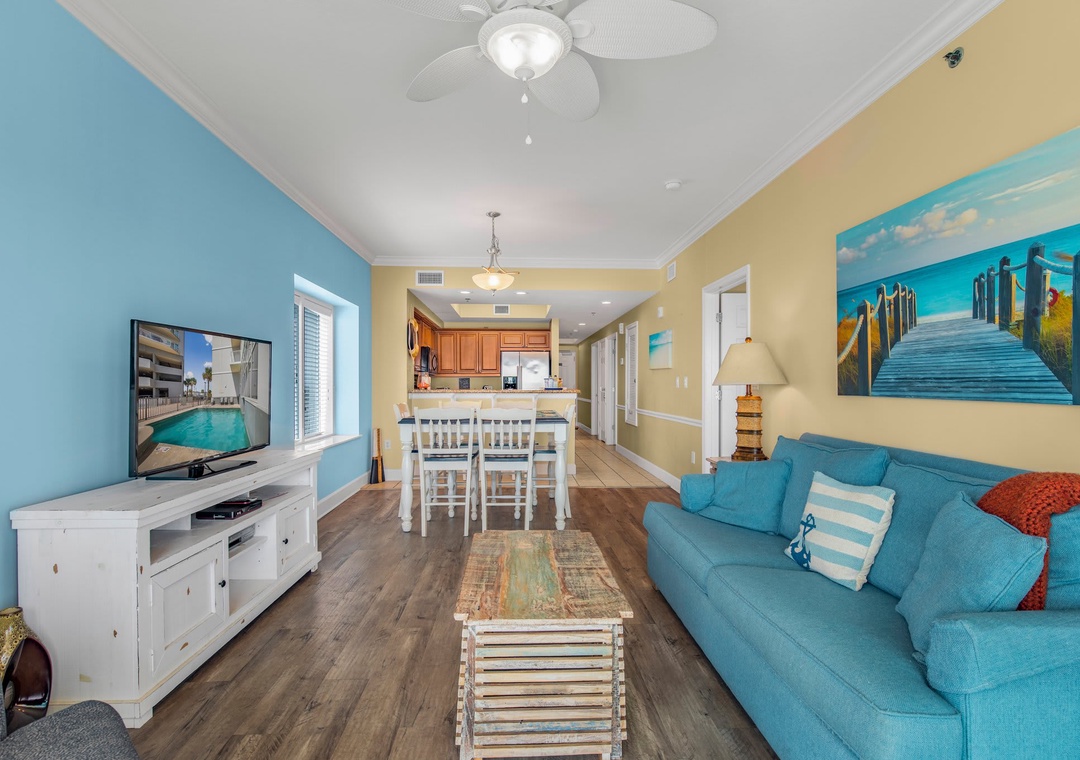 Wonderful views sweeping into this beautiful open concept living space. The well-equipped kitchen is stocked with pots/pans/utensils to make a homecooked meal on your next vacation. The dining table comfortably seats six with additional seating for three at kitchen bar. Relax in the comfortable living area with large flat screen TV. Off the living space, enjoy your own private balcony with seating to take in the dazzling views of the Gulf of Mexico. There is a washer and dryer in the unit for your convenience.