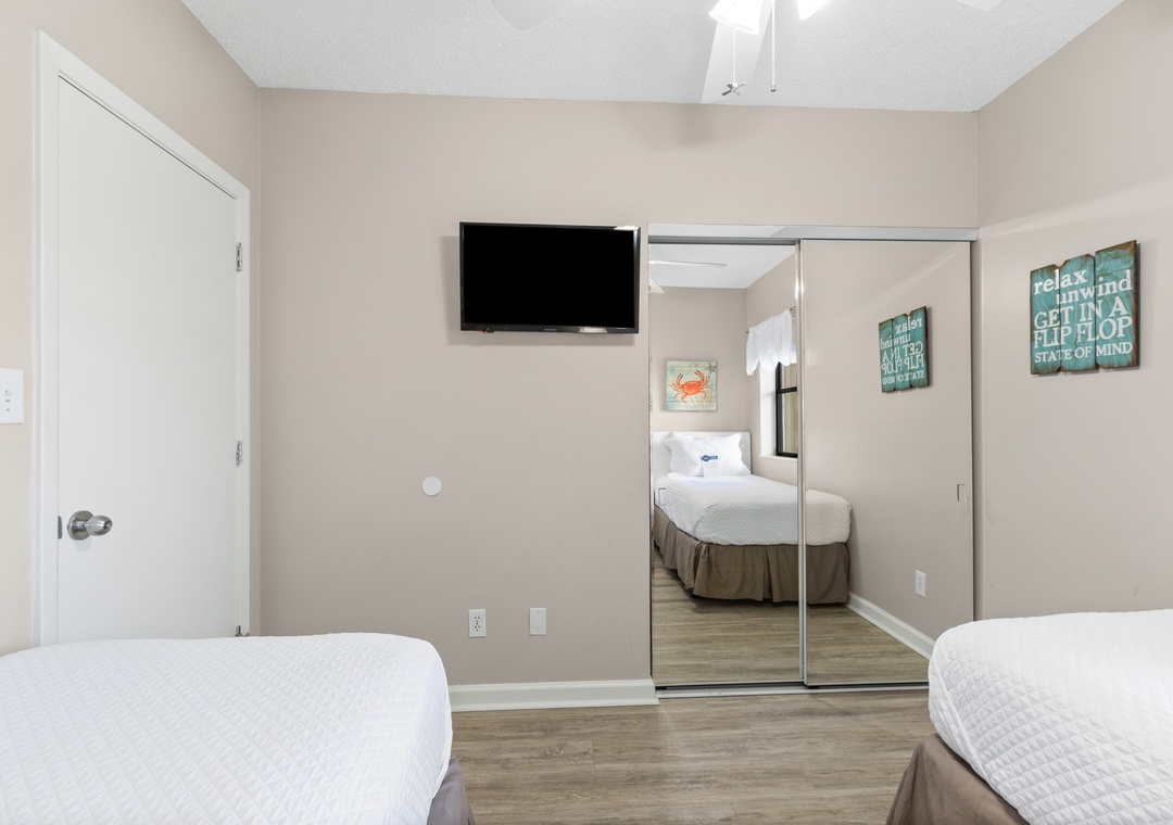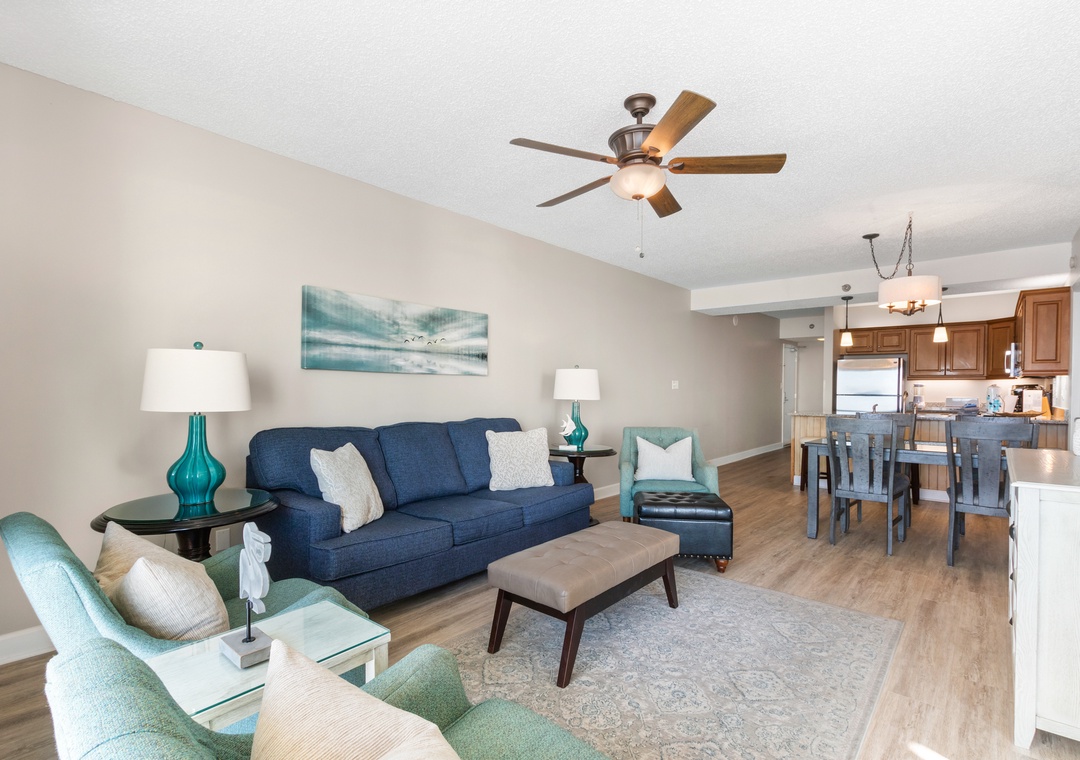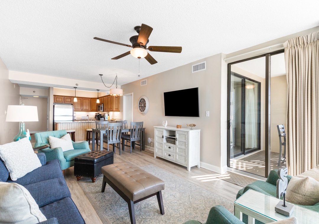 The Primary suite features a plush King bed, private bath with a tile walk-in shower, flat-screen TV, and balcony access for taking in the gorgeous beachfront scenery. The second bedroom offers a cozy Queen bed, while the third bedroom is great for families with its two Twin beds, both with flat-screen TVs. A sleeper sofa in the living room brings the total sleeping capacity to 8 guests.