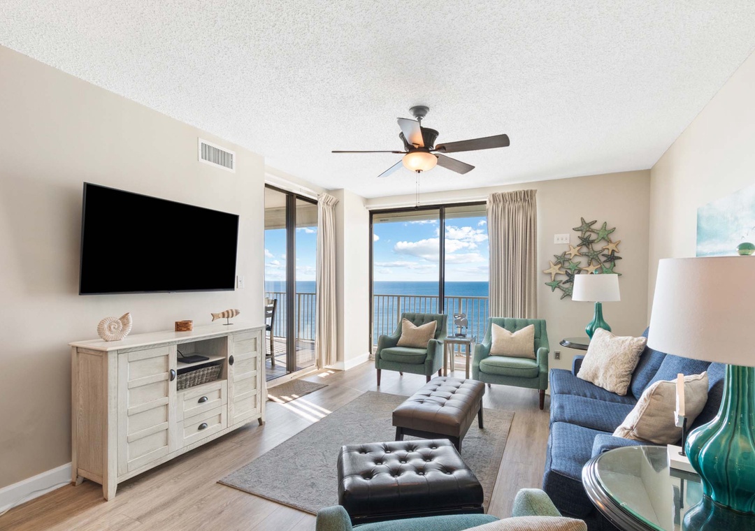 Welcome to Shoalwater 1202, a luxurious 3-bedroom, 2-bath Gulf-front condo located in Orange Beach. Situated on the 12th floor, this stunning retreat offers breathtaking Gulf views from a spacious private balcony. The living area is thoughtfully designed with comfortable seating, a large flat-screen TV, and direct balcony access, making it the perfect spot to unwind. The fully equipped kitchen boasts granite countertops, stainless steel appliances, and a breakfast bar, ideal for preparing and enjoying delicious meals together.