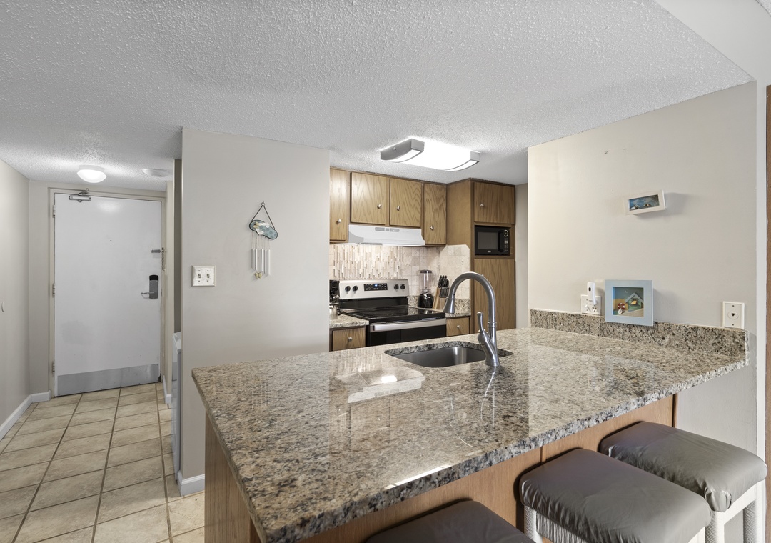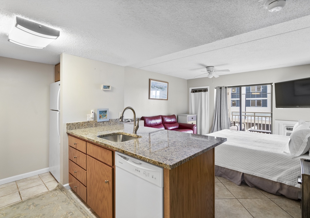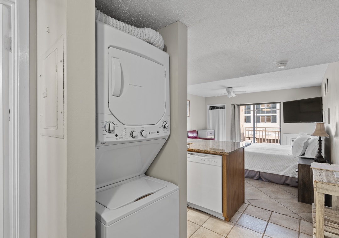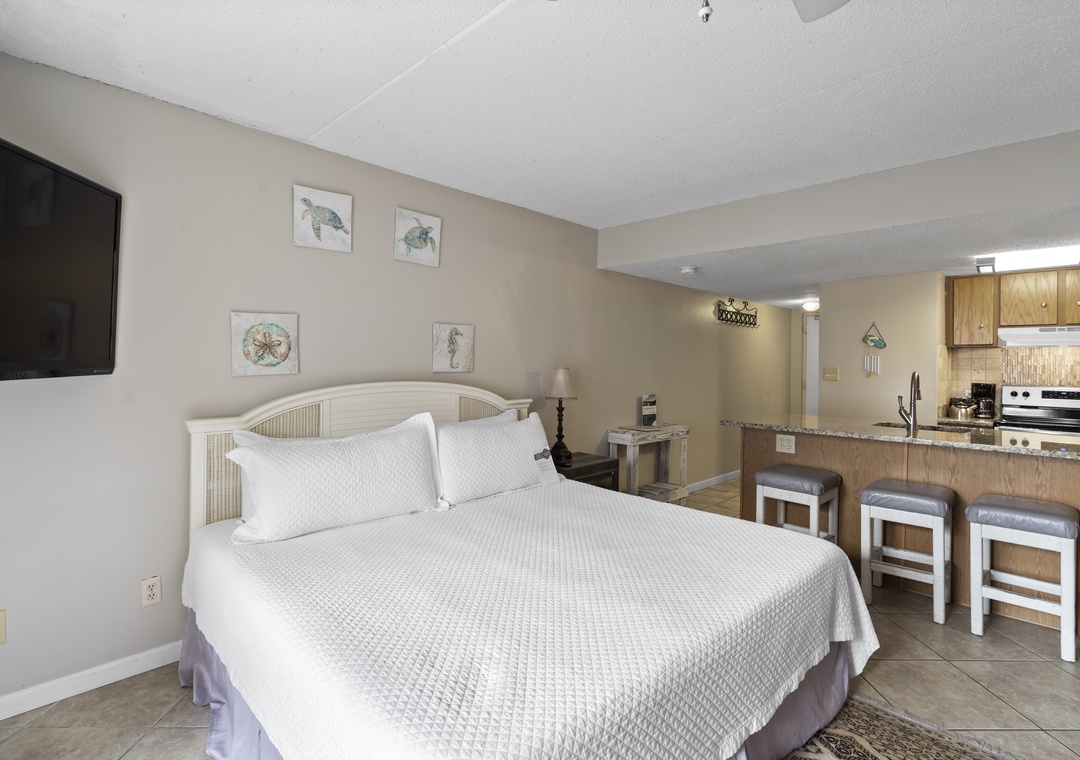 Inside, you’ll find a spacious living and sleeping area with a comfortable King-sized bed and a flat-screen TV for evening relaxation. The fully equipped kitchen features granite countertops and all the essentials for whipping up anything from a quick breakfast to a beachside picnic. Tile floors run throughout the space, adding a touch of style and easy maintenance. For your convenience, the condo also includes a full-sized washer and dryer to keep your beachwear fresh.