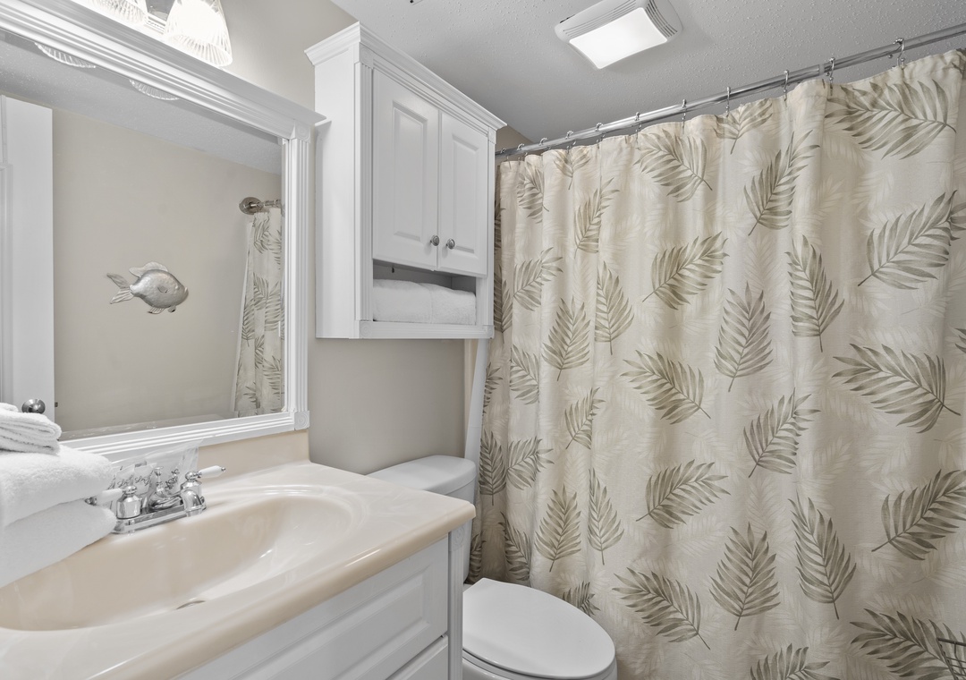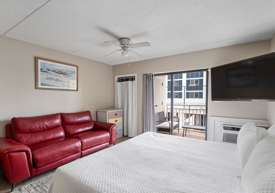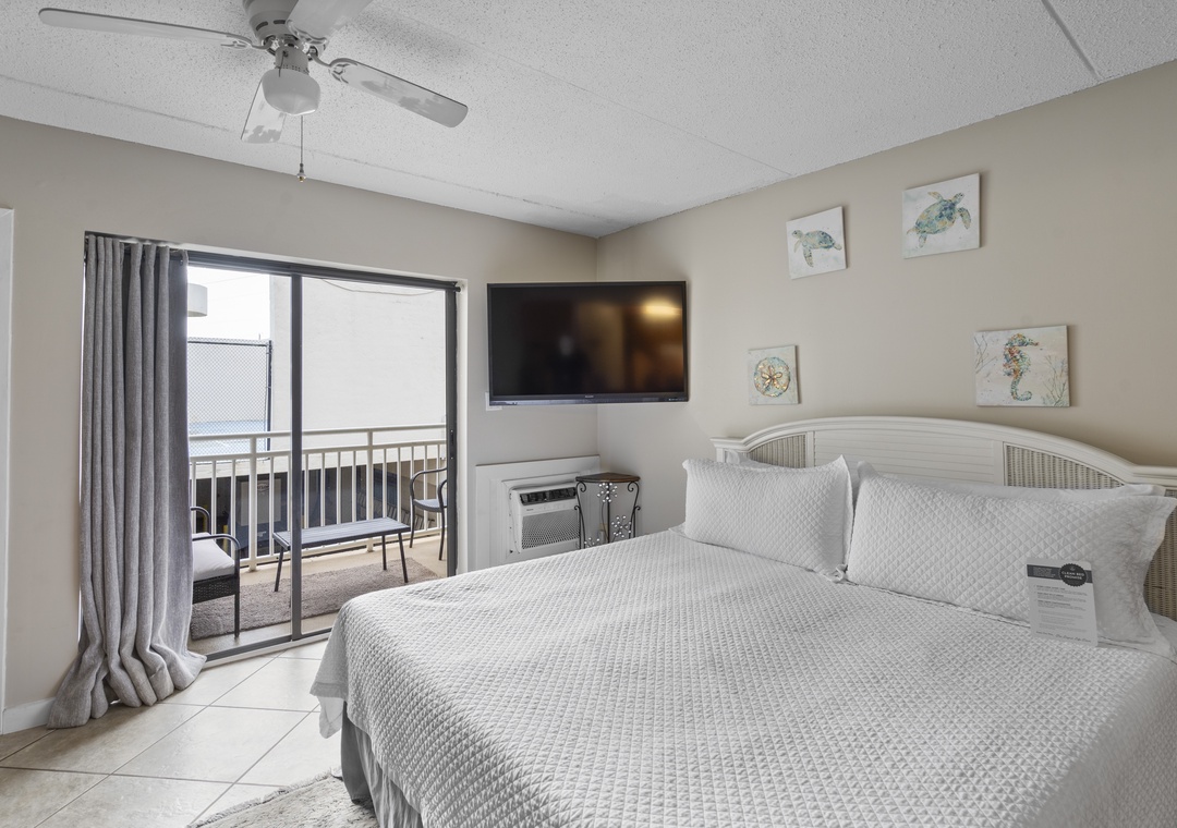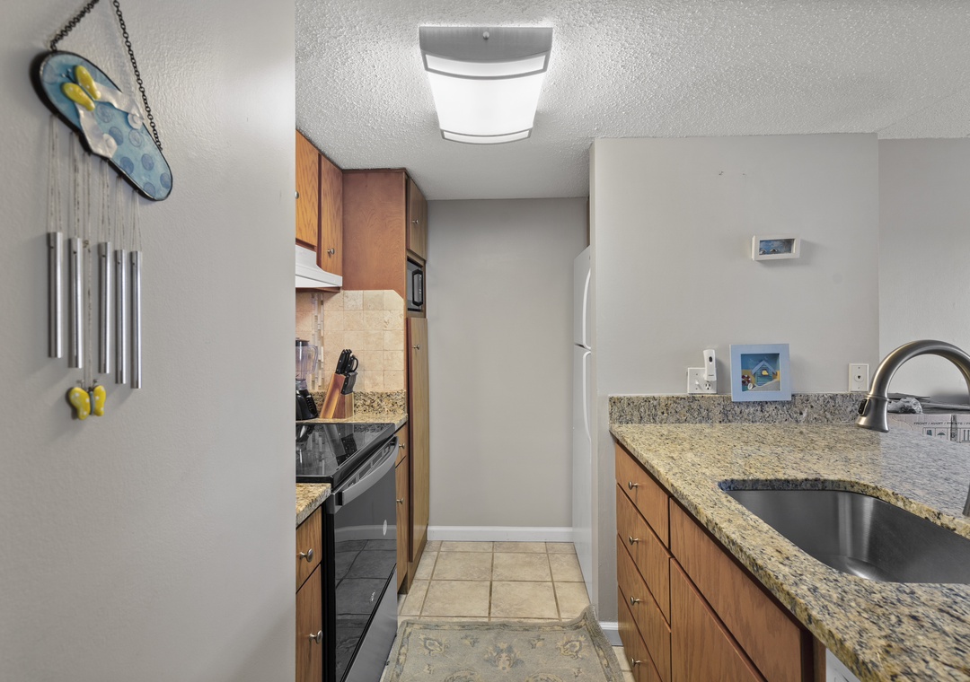 Inside, you’ll find a spacious living and sleeping area with a comfortable King-sized bed and a flat-screen TV for evening relaxation. The fully equipped kitchen features granite countertops and all the essentials for whipping up anything from a quick breakfast to a beachside picnic. Tile floors run throughout the space, adding a touch of style and easy maintenance. For your convenience, the condo also includes a full-sized washer and dryer to keep your beachwear fresh.