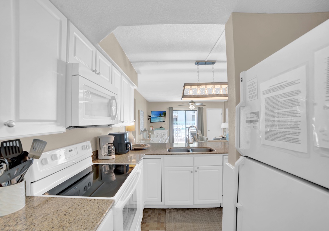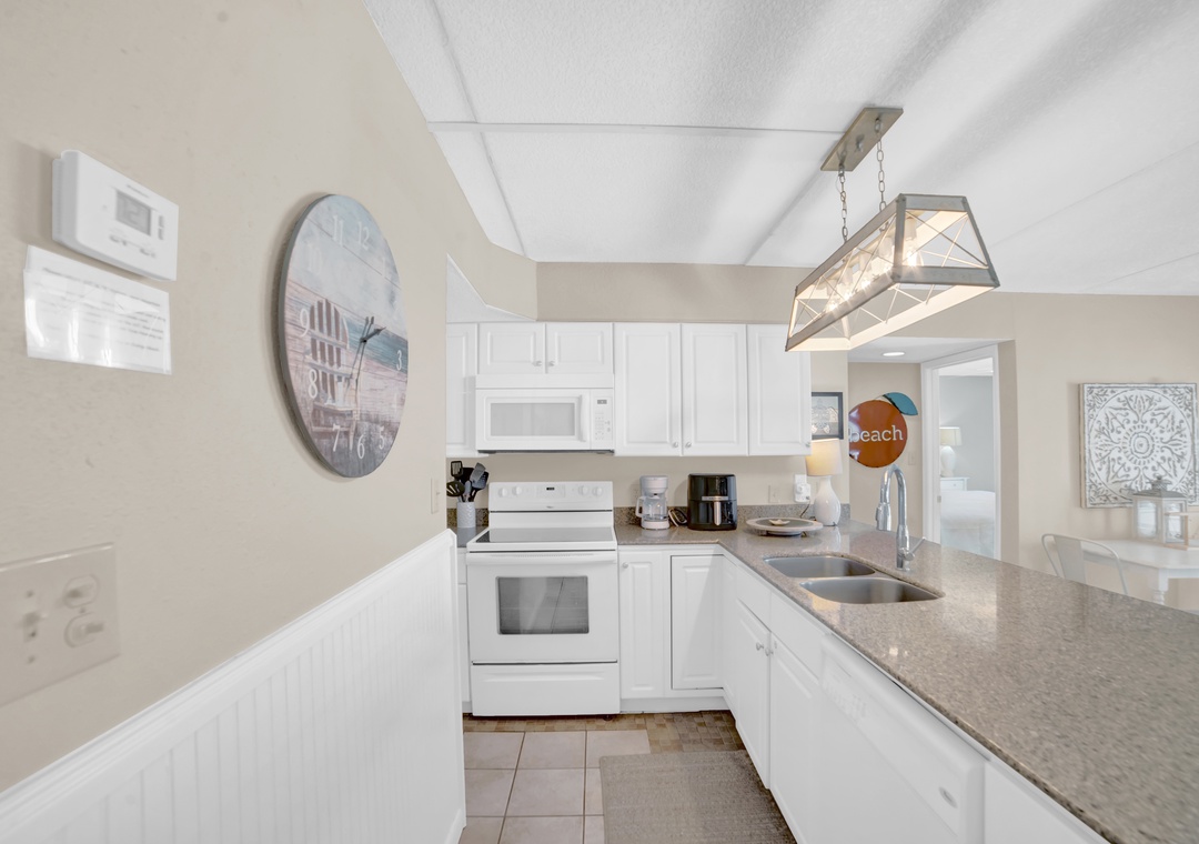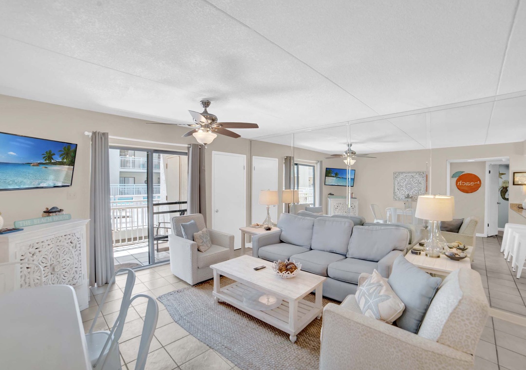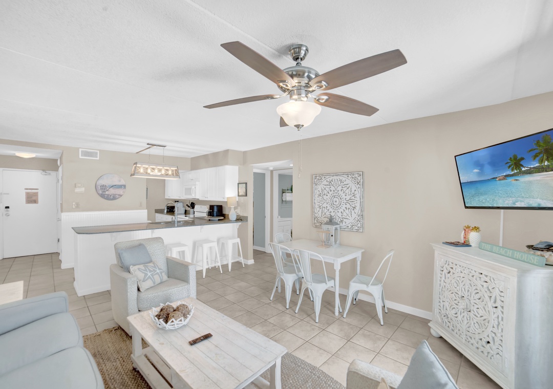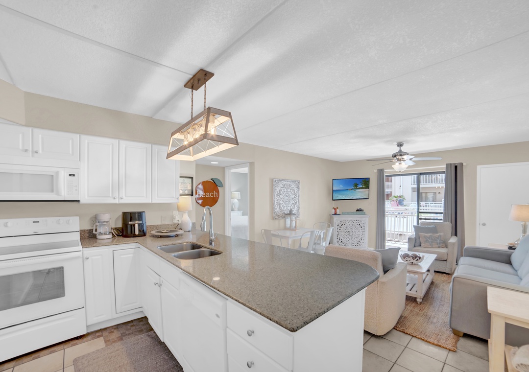 Tastefully updated with granite countertops and tile floors throughout, this condo offers a touch of elegance and plenty of comfort. The Primary bedroom features a King-sized bed, while the guest bedroom is furnished with a Full/Twin bunk bed—perfect for kids or extra guests. The spacious living area includes a Queen sleeper sofa and a flat-screen TV, ideal for relaxing after a day at the beach.