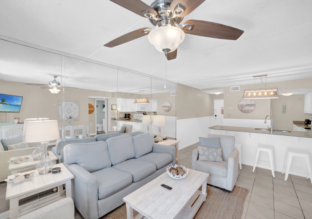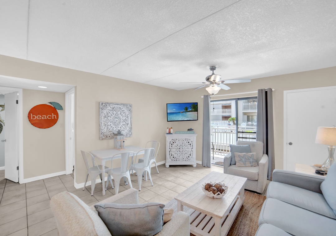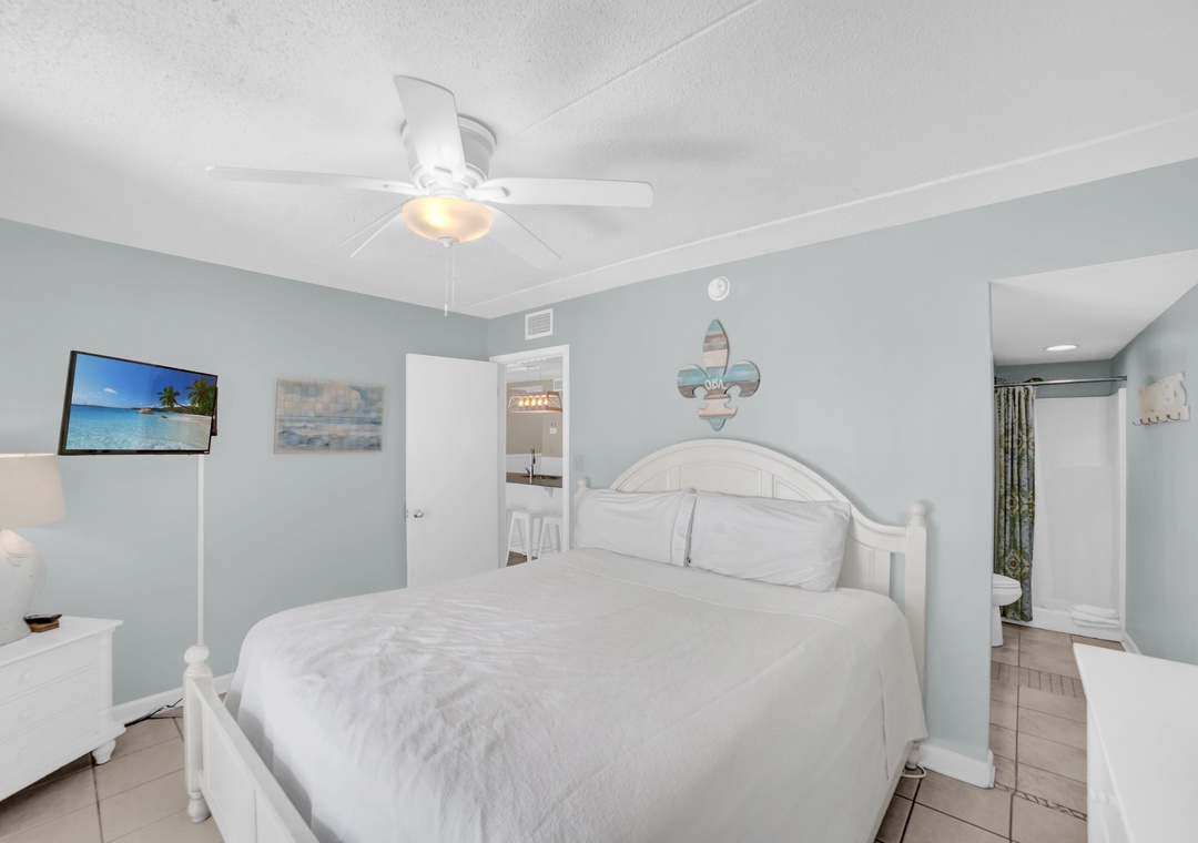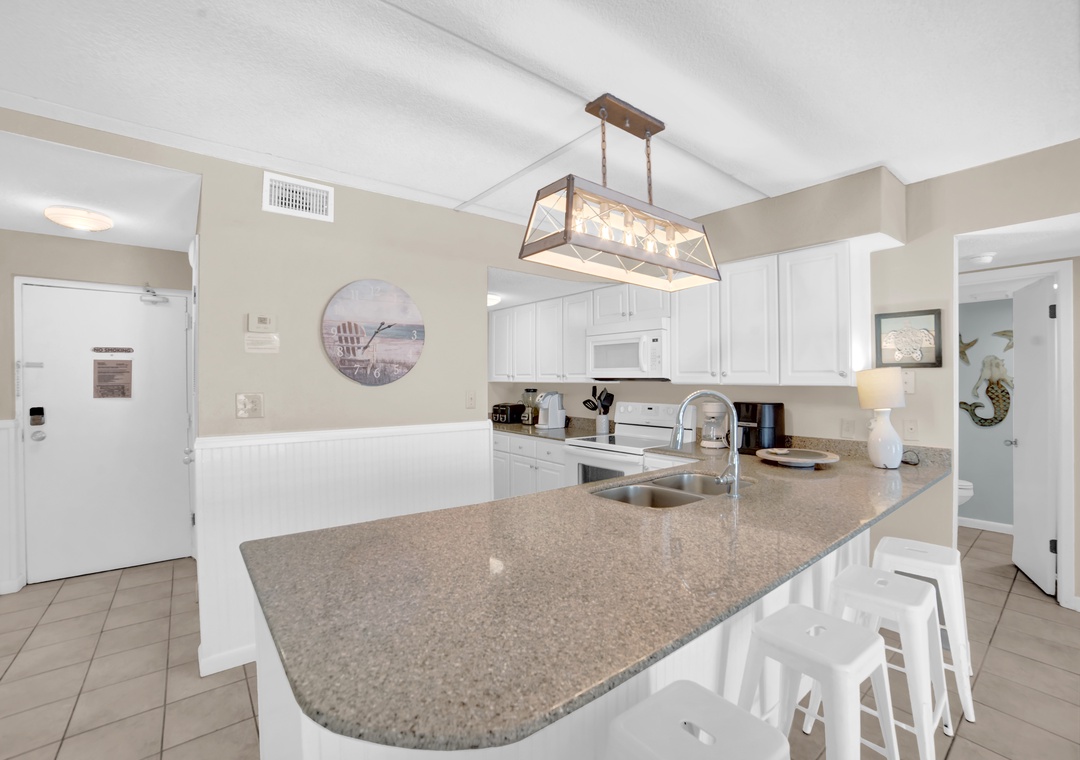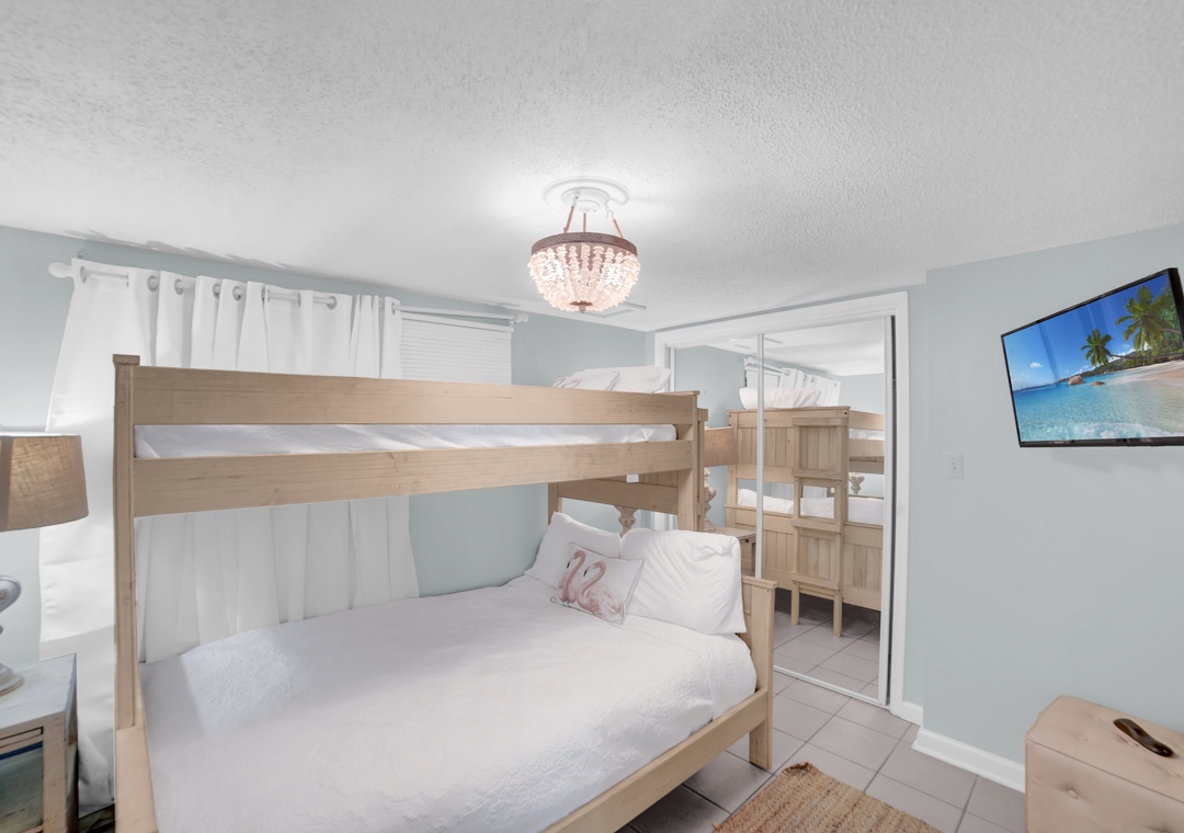 Tastefully updated with granite countertops and tile floors throughout, this condo offers a touch of elegance and plenty of comfort. The Primary bedroom features a King-sized bed, while the guest bedroom is furnished with a Full/Twin bunk bed—perfect for kids or extra guests. The spacious living area includes a Queen sleeper sofa and a flat-screen TV, ideal for relaxing after a day at the beach.