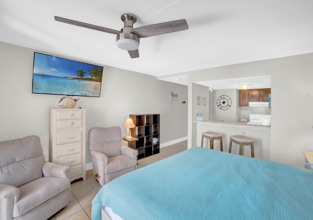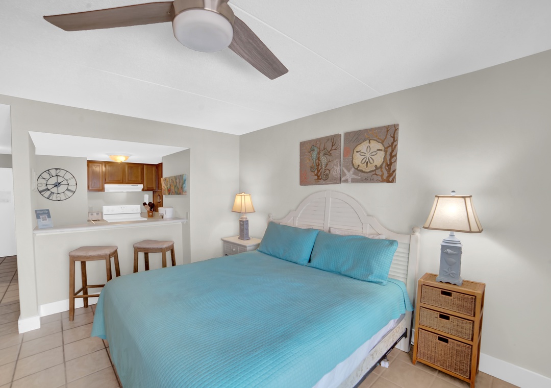 Welcome to Sugar Beach 238, your cozy retreat by the Gulf in Orange Beach. This charming studio condo with 1 bath offers a comfortable space to unwind and enjoy the soothing sounds of the waves. Situated directly behind the Gulf-front Sugar Beach units, it provides convenient access to the beach and a nearby elevator. Inside, you’ll find a spacious living area with a plush King-sized bed, a 50-inch Smart TV, and free WiFi for your entertainment and connectivity needs.
