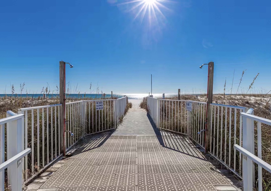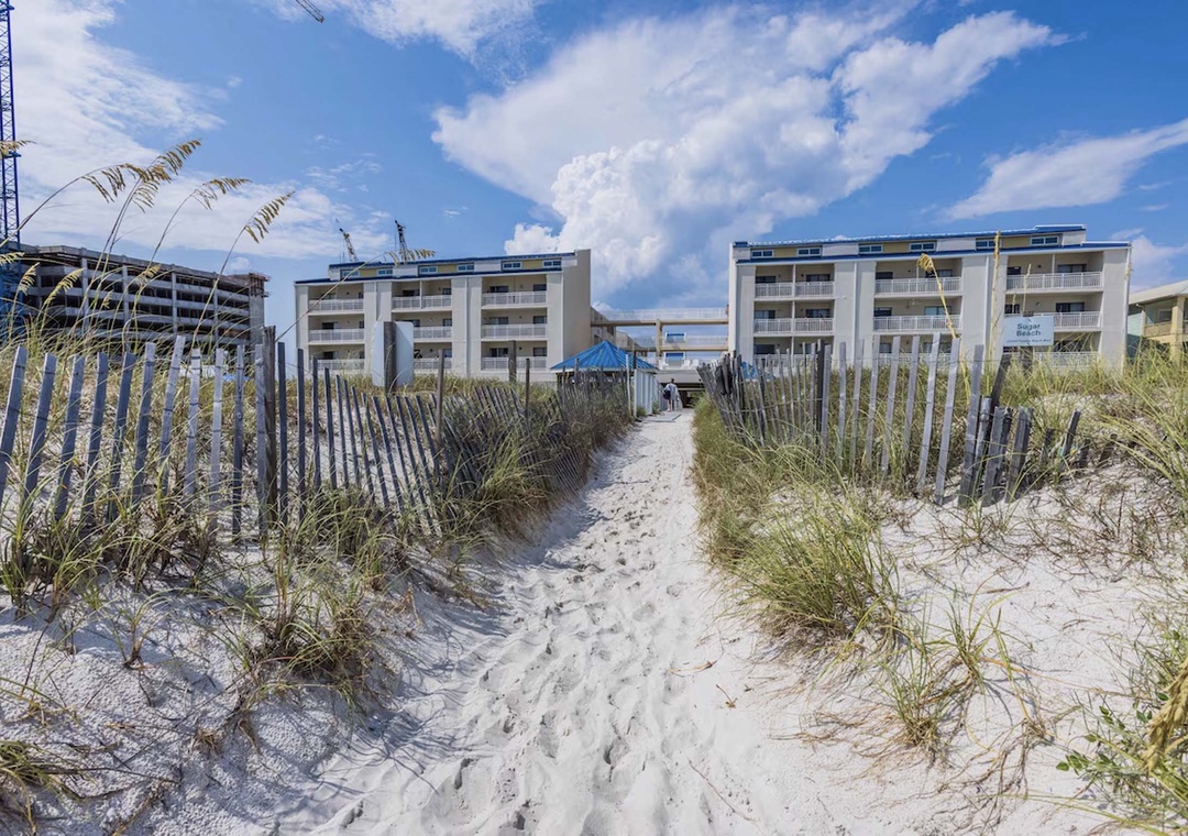 Sugar Beach offers direct Gulf beach access and an array of resort-style amenities including three swimming pools (one kiddie pool), a tennis court, the Sugar Shack snack bar, BBQ grills, picnic tables, and shaded gazebos. Free WiFi is available throughout the property, keeping you connected as you relax.