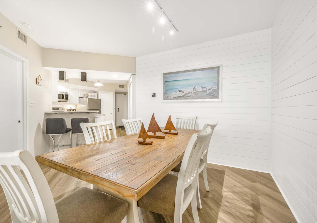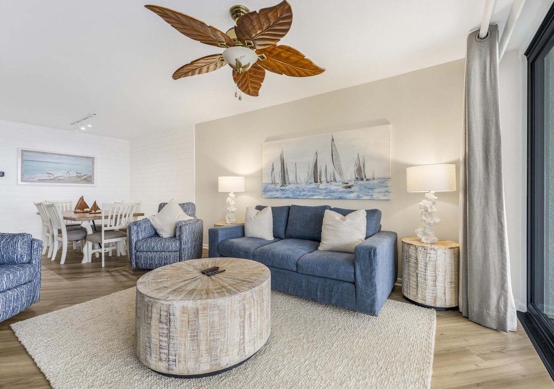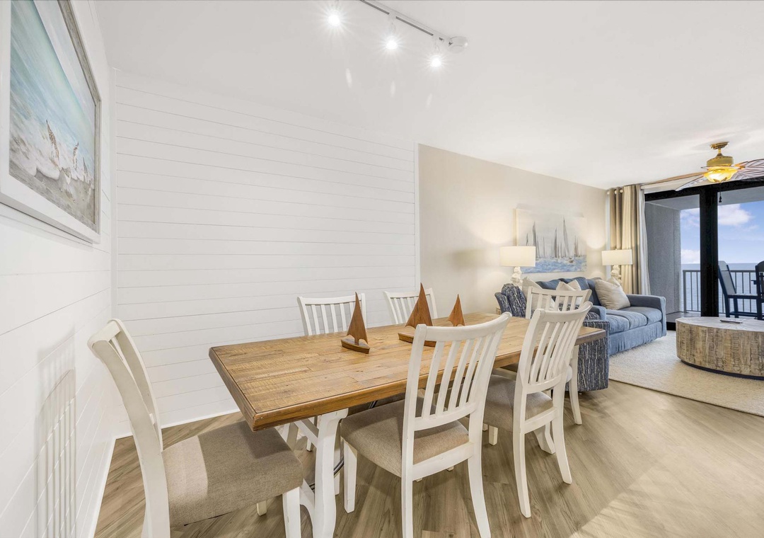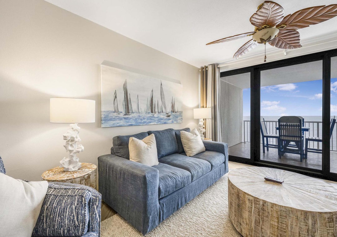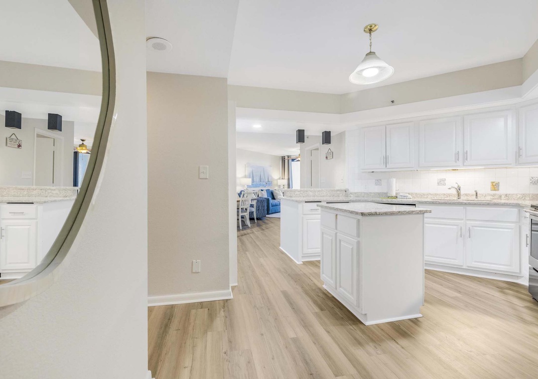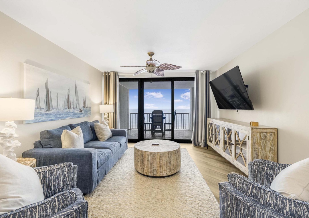 Inside this beautiful open concept three bedroom unit that sleeps 10, take in breathtaking views of the Gulf of America. Light flows in from the private balcony into the comfortable living space. Relax after a day on the beach in the cozy living space with mounted flat screen TV. The modern well-equipped kitchen has stainless steel appliances and is fully stocked to make meal time a breeze. The dining table comfortably seats six with additional seating for two at the kitchen bar. Enjoy your mornings and evenings out on the private balcony while taking in the view. There's plenty of seating on the balcony and it is accessible from the main living area and the main bedroom. Bring the whole family and experience a rejuvenating vacation at Summer House 1405.