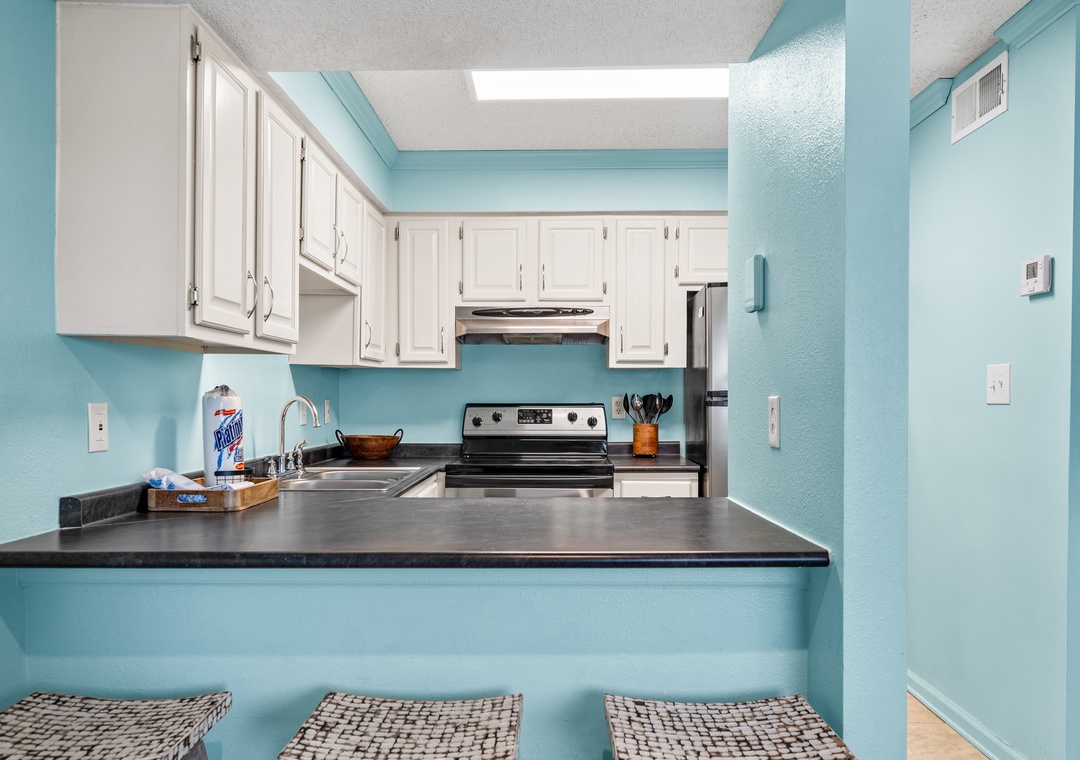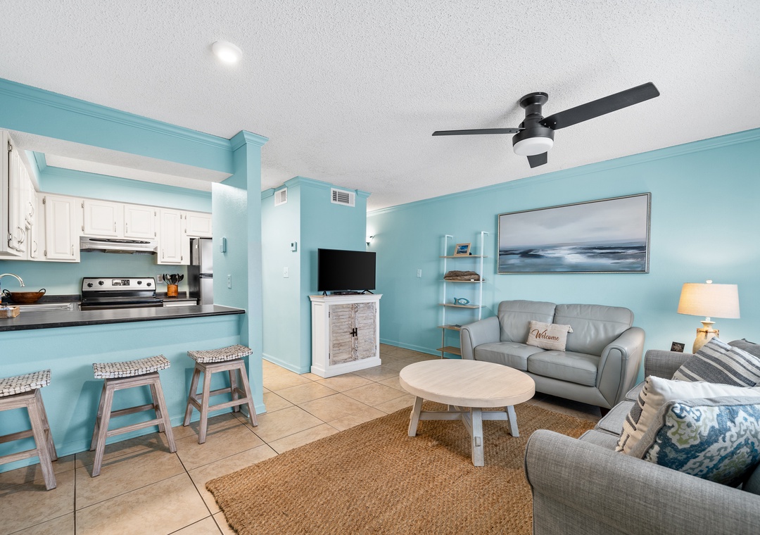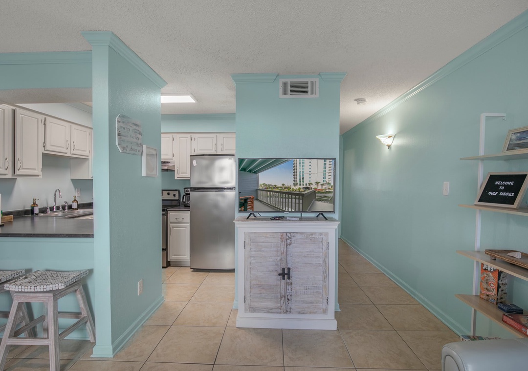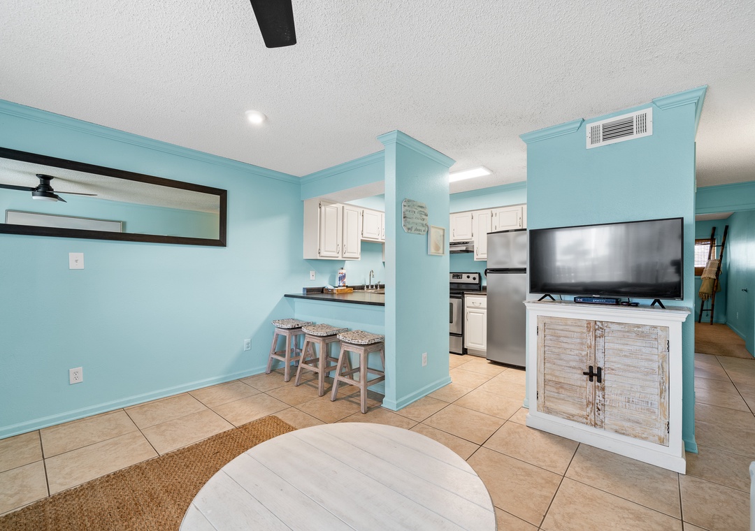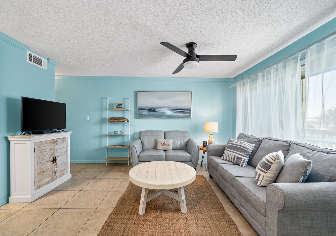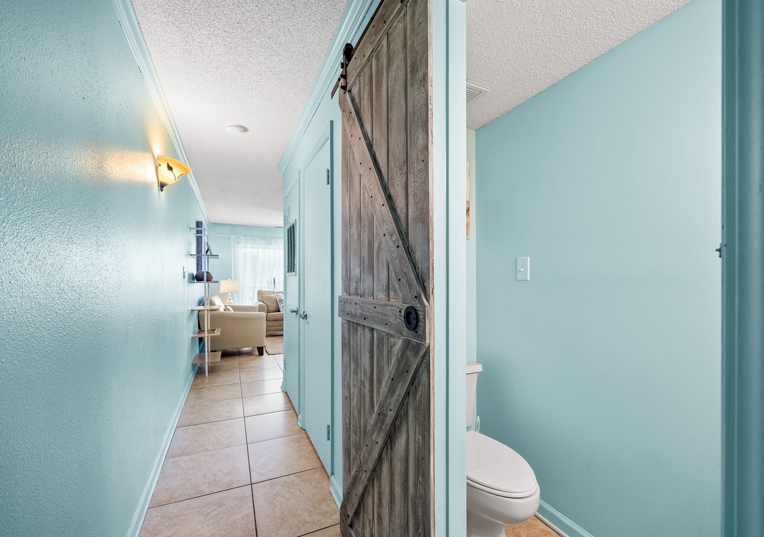 This thoughtfully designed condo features an open-concept living area with a sleeper sofa and flat-screen TV, perfect for unwinding after a day of adventure. The space includes one bedroom with a plush Queen bed and one and a half baths, complete with a tiled walk-in shower, modern barn doors, and stylish finishes. Step out onto the balcony or relax in the living room to enjoy scenic views of Little Lagoon and indirect glimpses of the Gulf of Mexico.