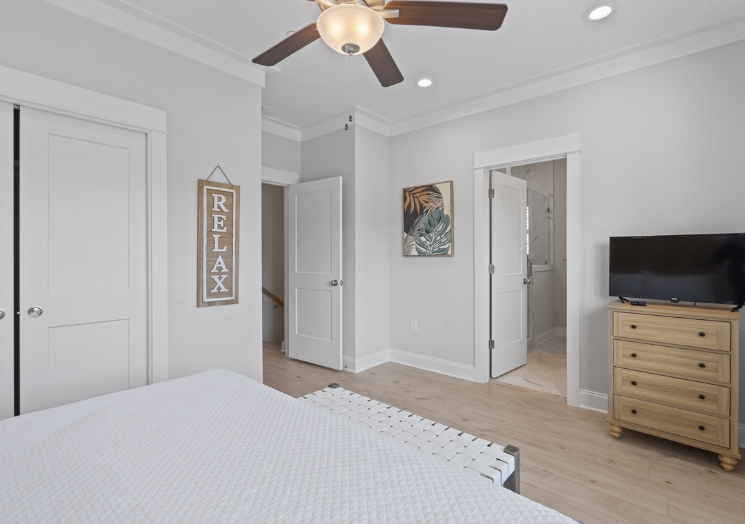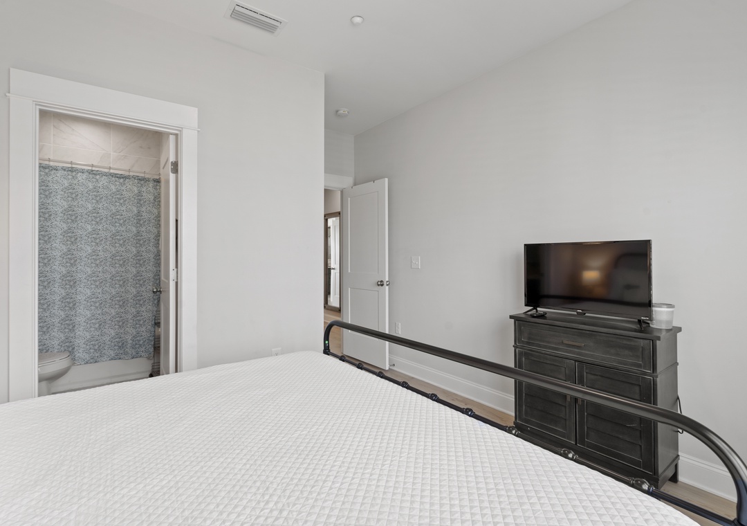 The home includes three comfortable bedrooms, each with its own ensuite bathroom and flat-screen TV. The first suite offers a King bed, the second suite also features a King bed, and the third suite provides two Full beds—perfect for families or larger groups.