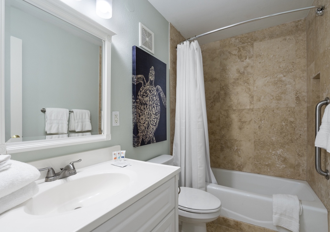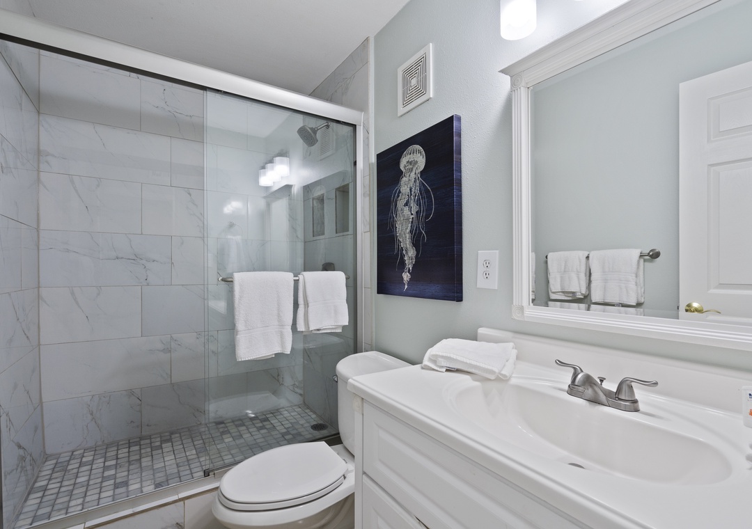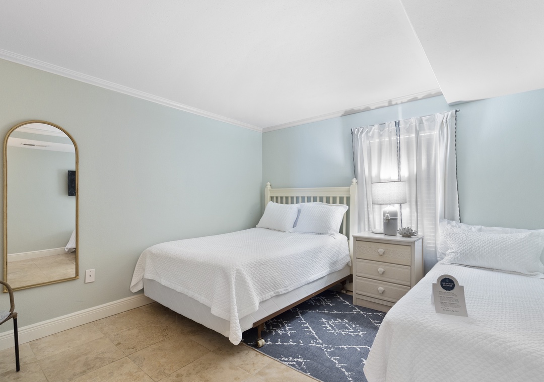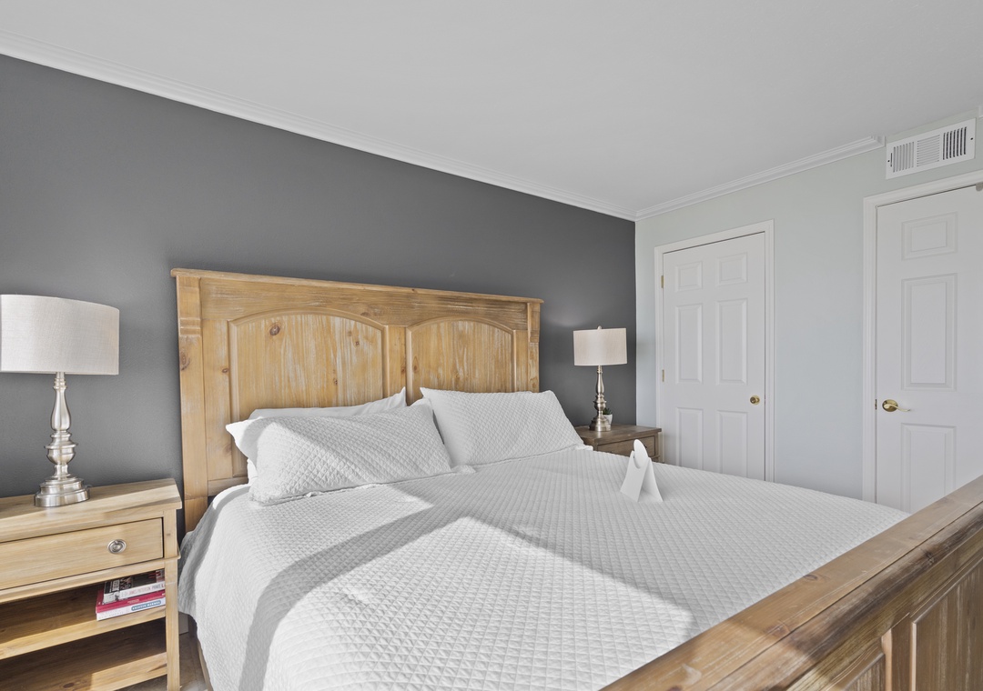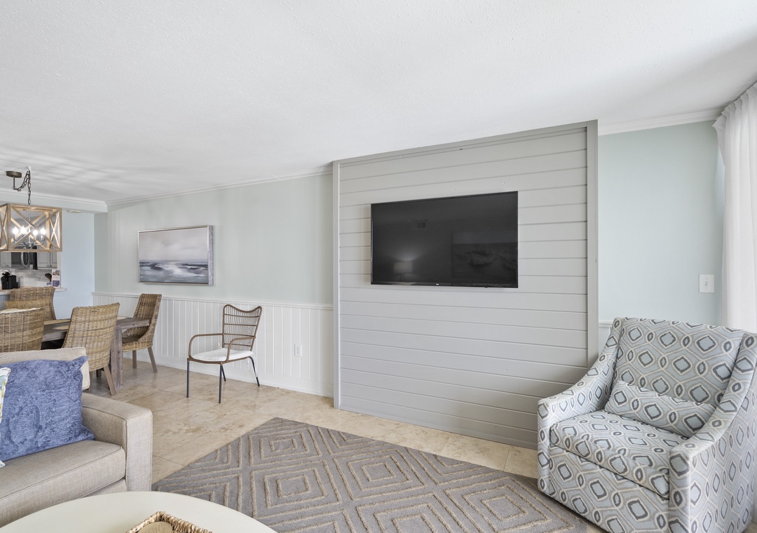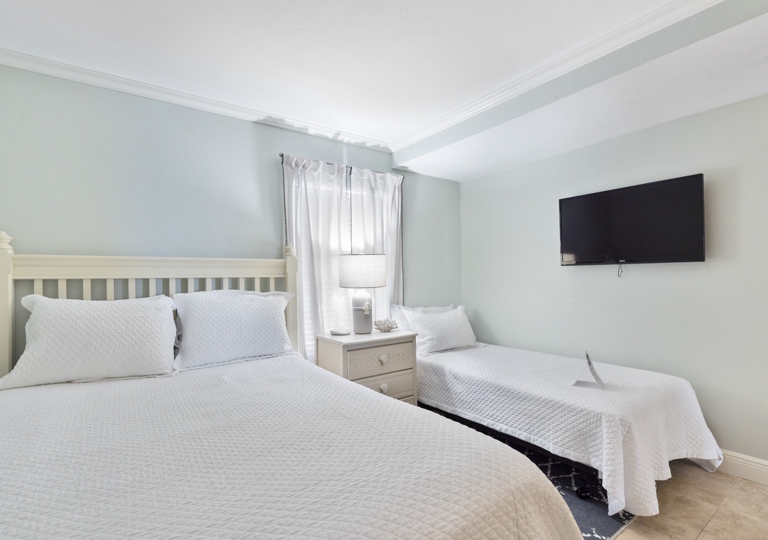 The Primary bedroom is designed for comfort, featuring a plush king bed and a flat-screen TV, creating a cozy and inviting atmosphere for relaxation. The second bedroom is equally accommodating, with a queen bed and a twin bed, along with a flat-screen TV, making it a versatile space for additional guests or children.