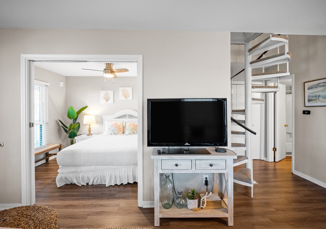 Our stay was wonderful! Very cozy! Our teen daughter loved the upstairs loft via spiral staircase. The bed was comfortable! Kitchen had everything we needed. All was clean! The location was perfect. Walkable to the public beaches. Just far away enough from the bustle, to be quiet and peaceful, yet close enough to be near the fun!