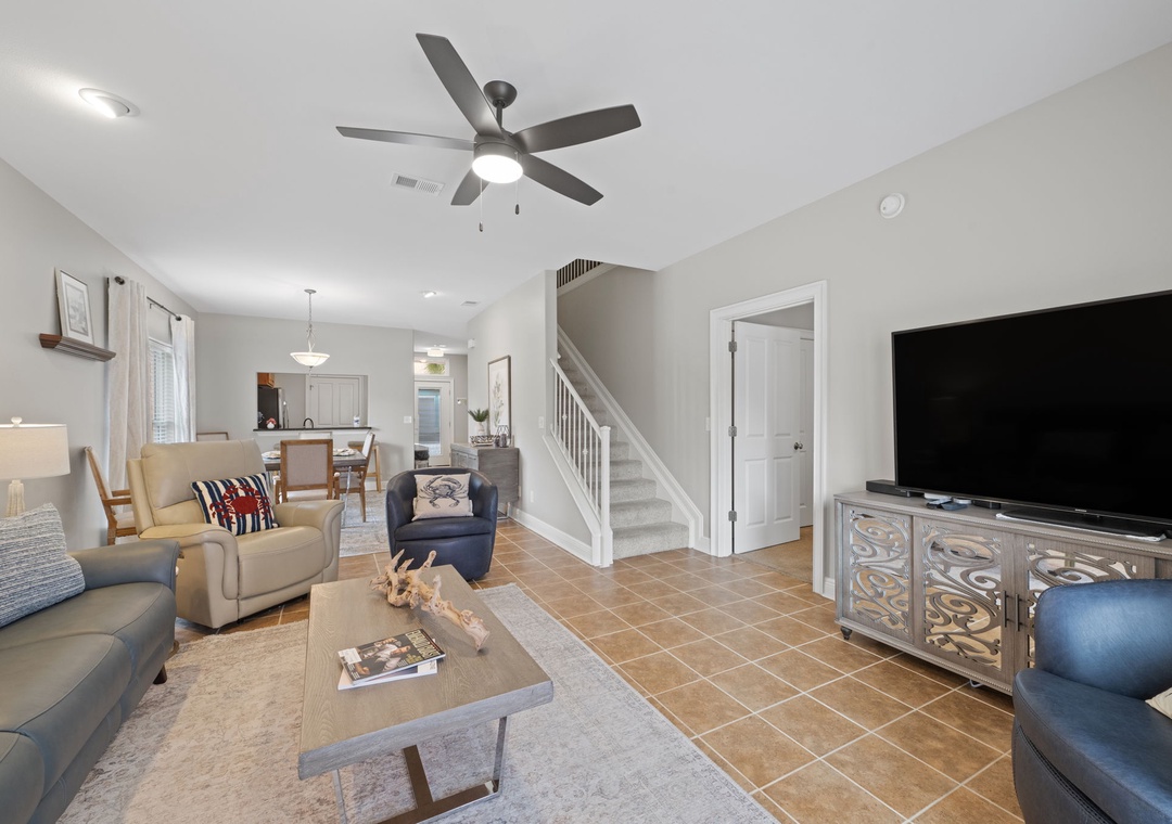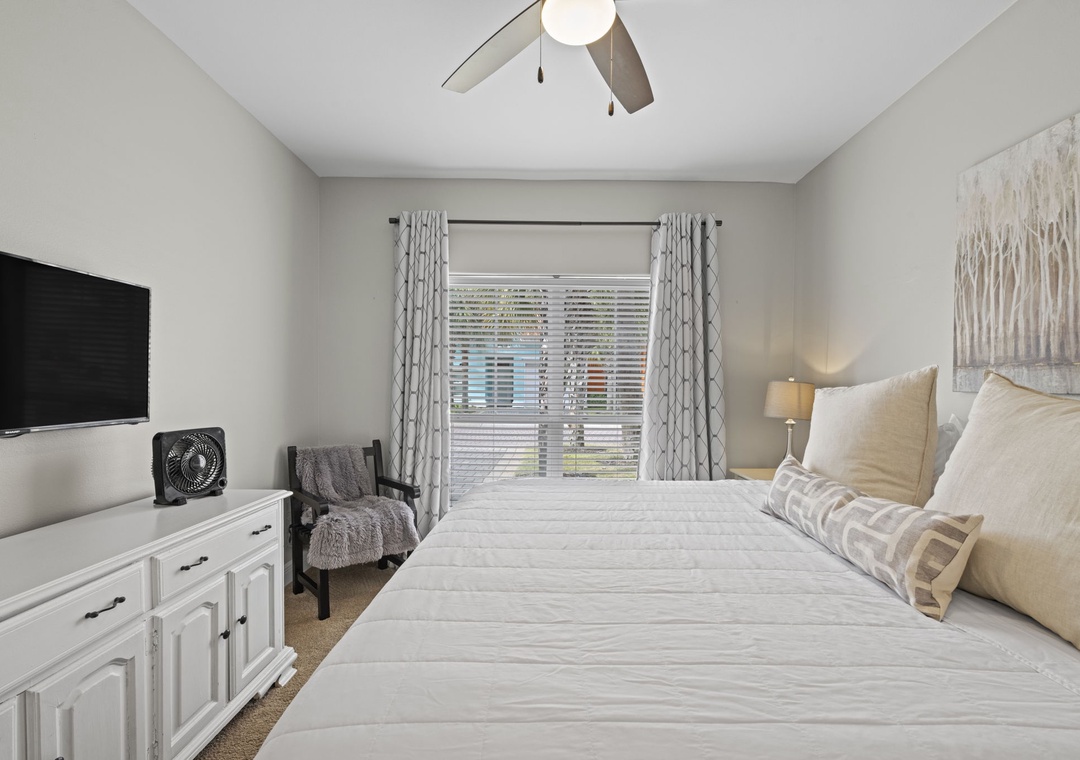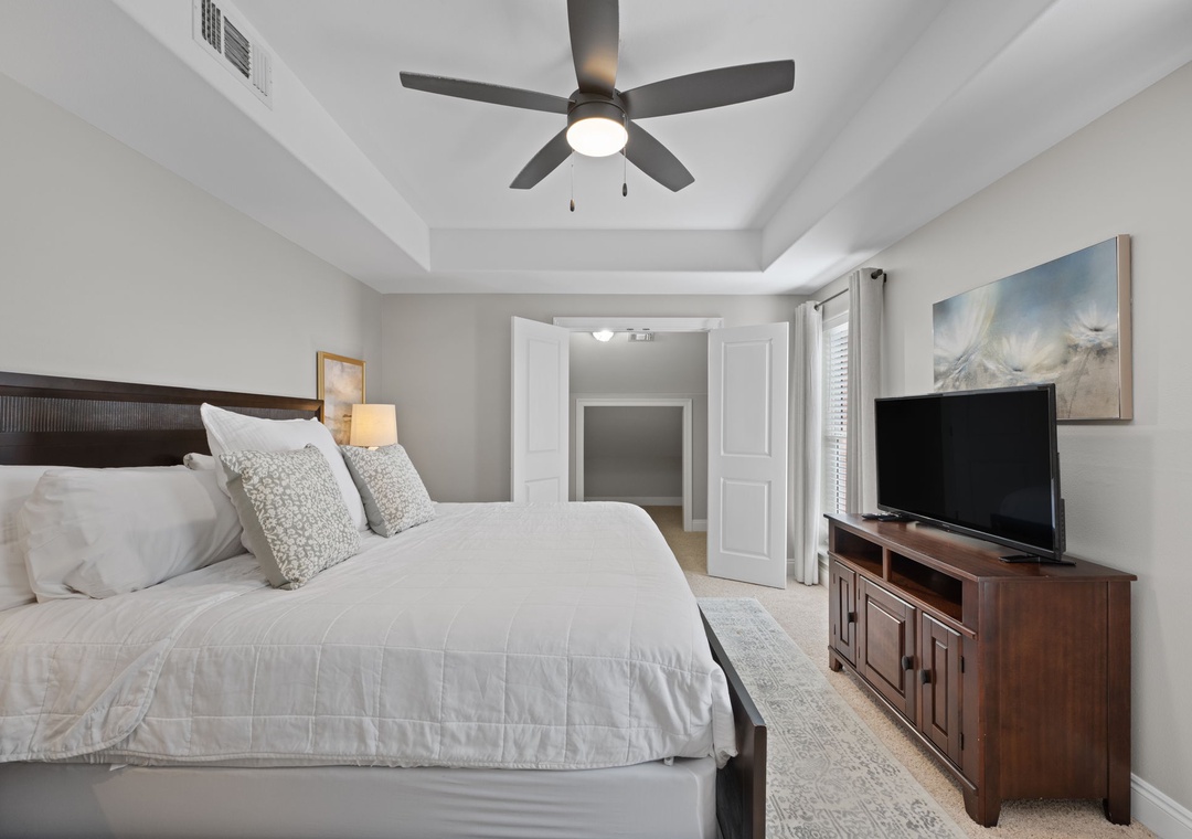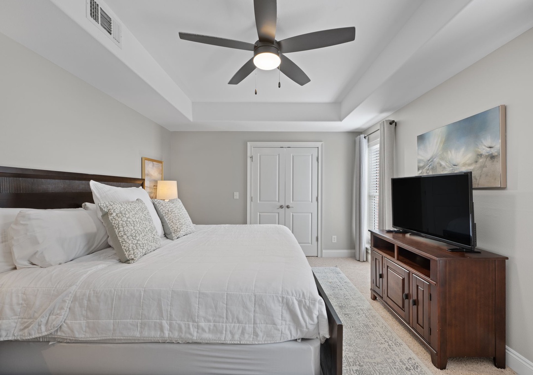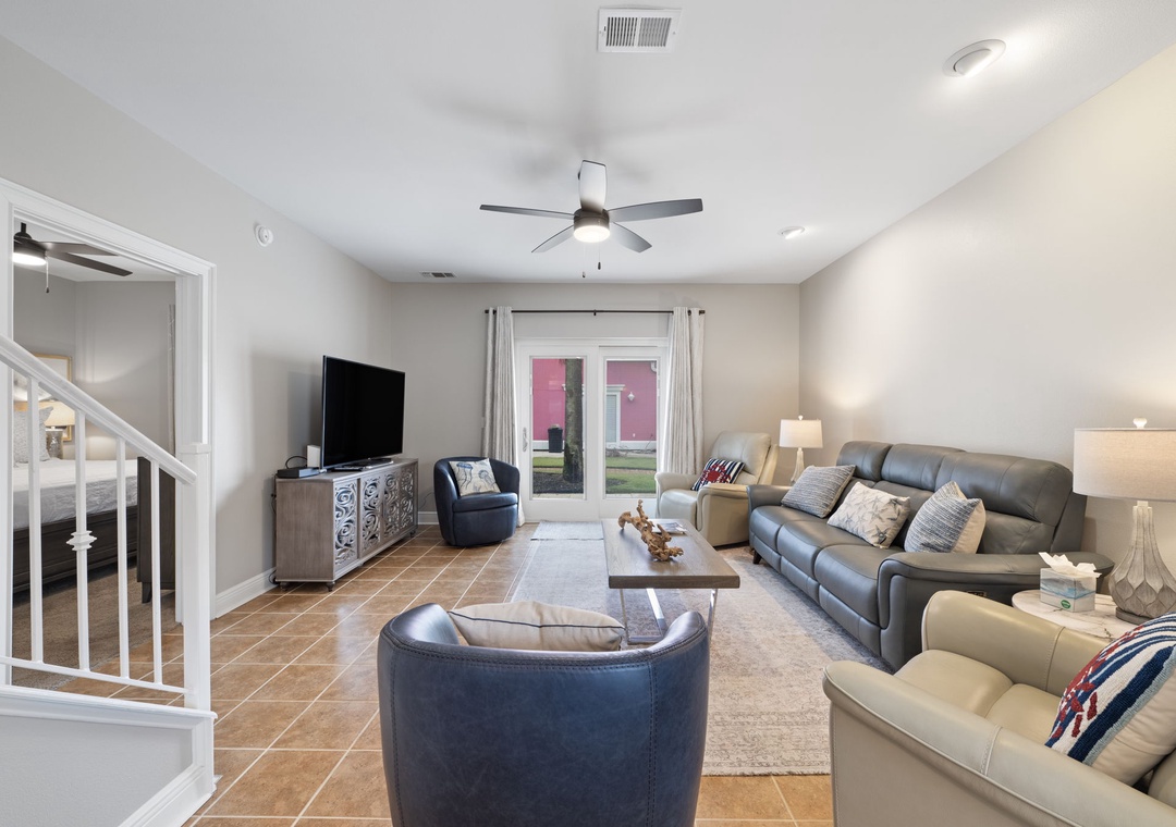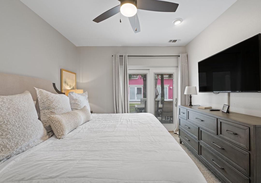 The first-floor main bedroom features a king bed, a flat-screen TV, and direct patio access, along with an en-suite bathroom boasting a large soaking tub and a walk-in shower. The second bedroom offers a cozy queen bed and a flat-screen TV, with a nearby bathroom featuring a shower/tub combo. Upstairs, a cozy loft area with a queen-size Murphy bed and a flat-screen TV provides additional relaxation space. The third bedroom includes a king bed, a flat-screen TV, and access to a third bathroom with a shower/tub combo. For added convenience, a washer and dryer are available, ensuring a comfortable and carefree stay.