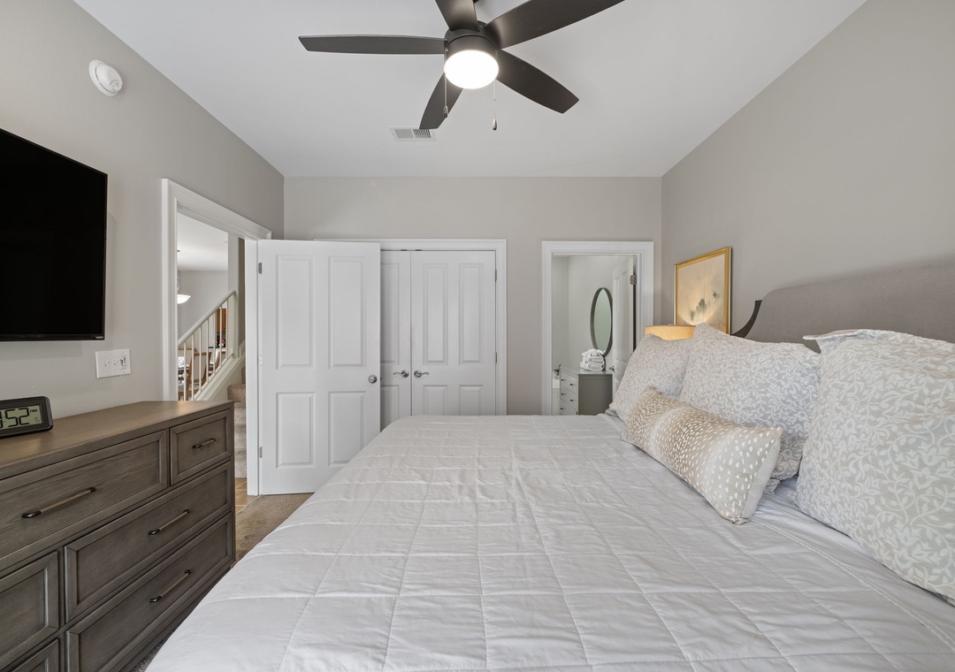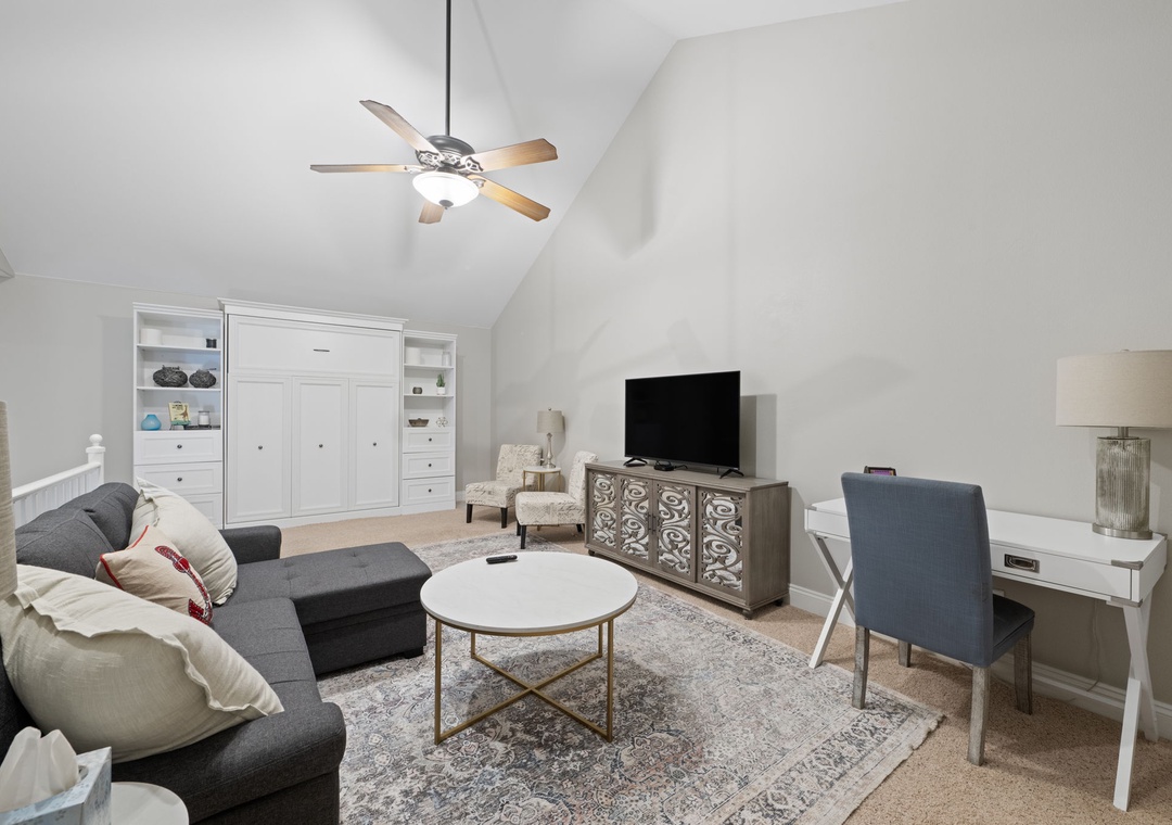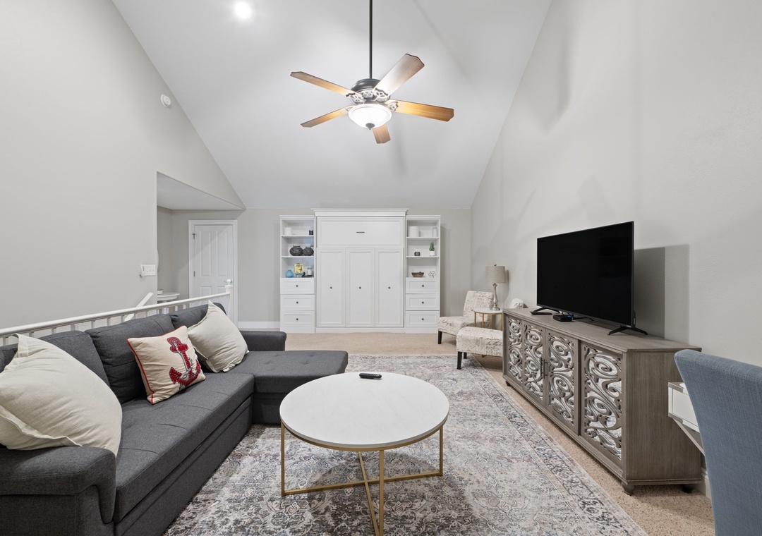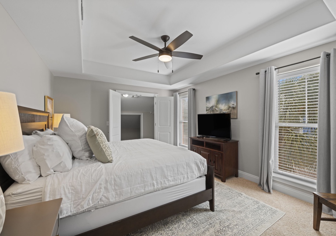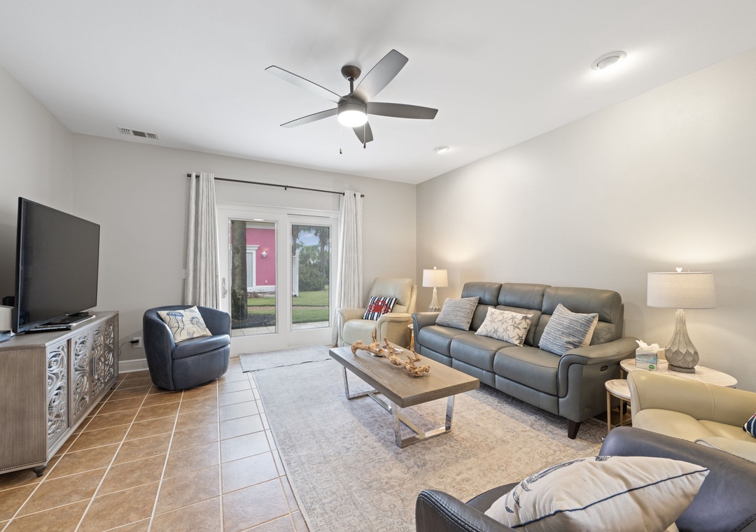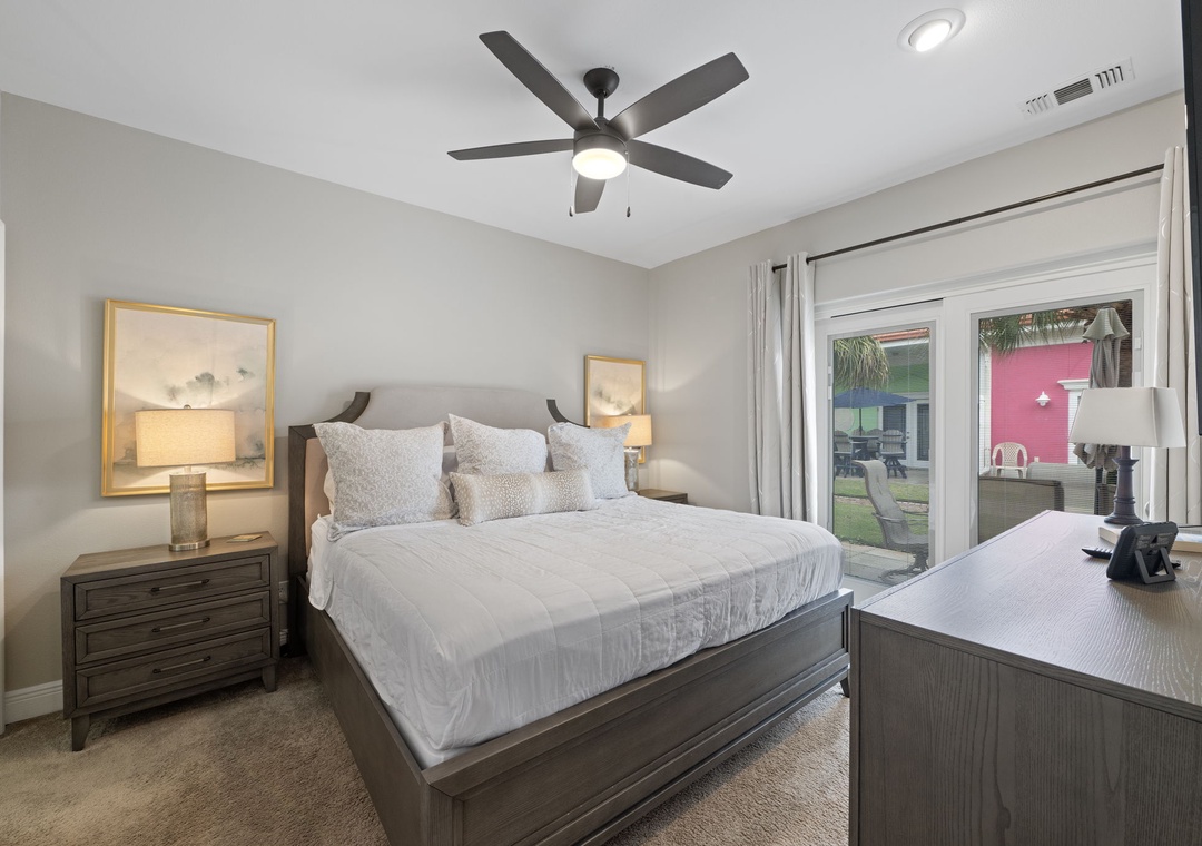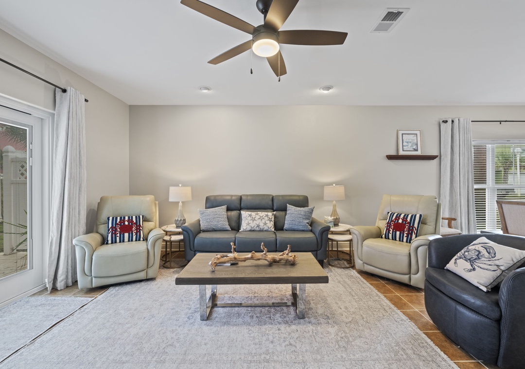 The first-floor main bedroom features a king bed, a flat-screen TV, and direct patio access, along with an en-suite bathroom boasting a large soaking tub and a walk-in shower. The second bedroom offers a cozy queen bed and a flat-screen TV, with a nearby bathroom featuring a shower/tub combo. Upstairs, a cozy loft area with a queen-size Murphy bed and a flat-screen TV provides additional relaxation space. The third bedroom includes a king bed, a flat-screen TV, and access to a third bathroom with a shower/tub combo. For added convenience, a washer and dryer are available, ensuring a comfortable and carefree stay.