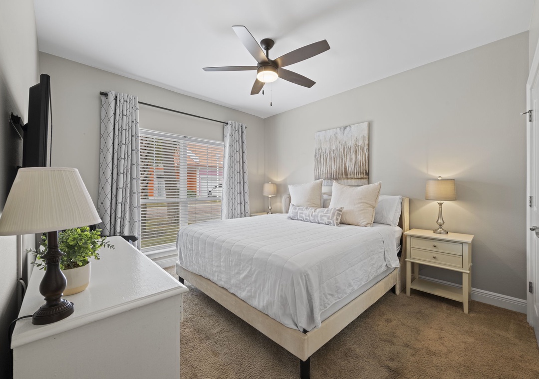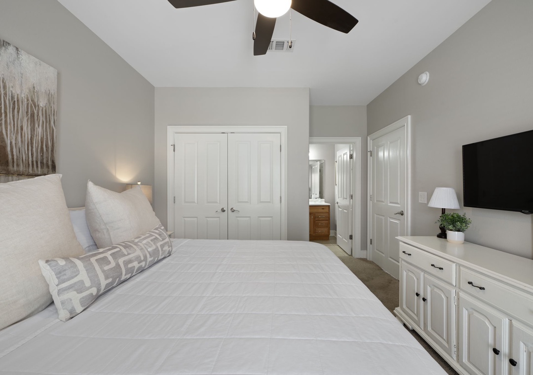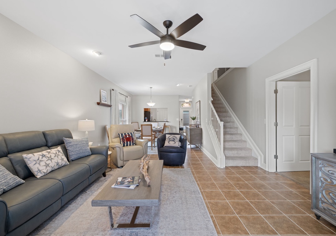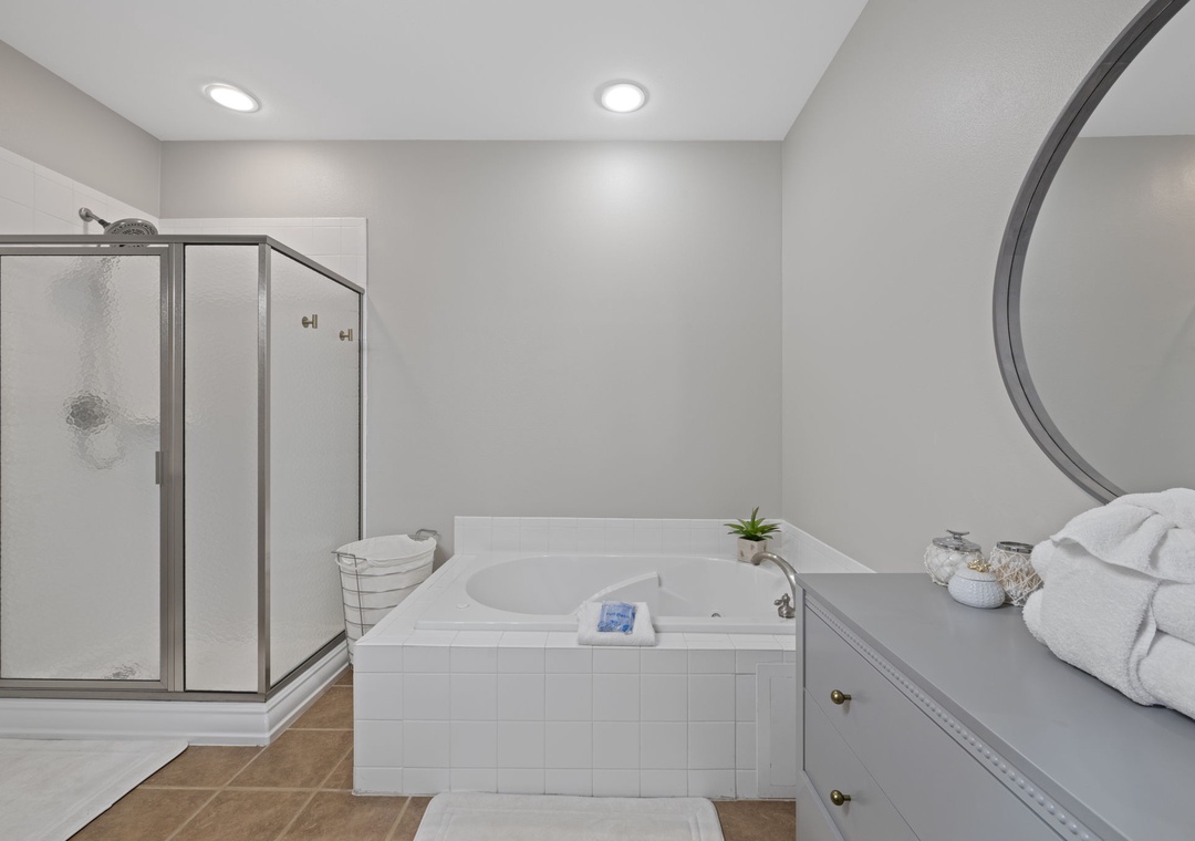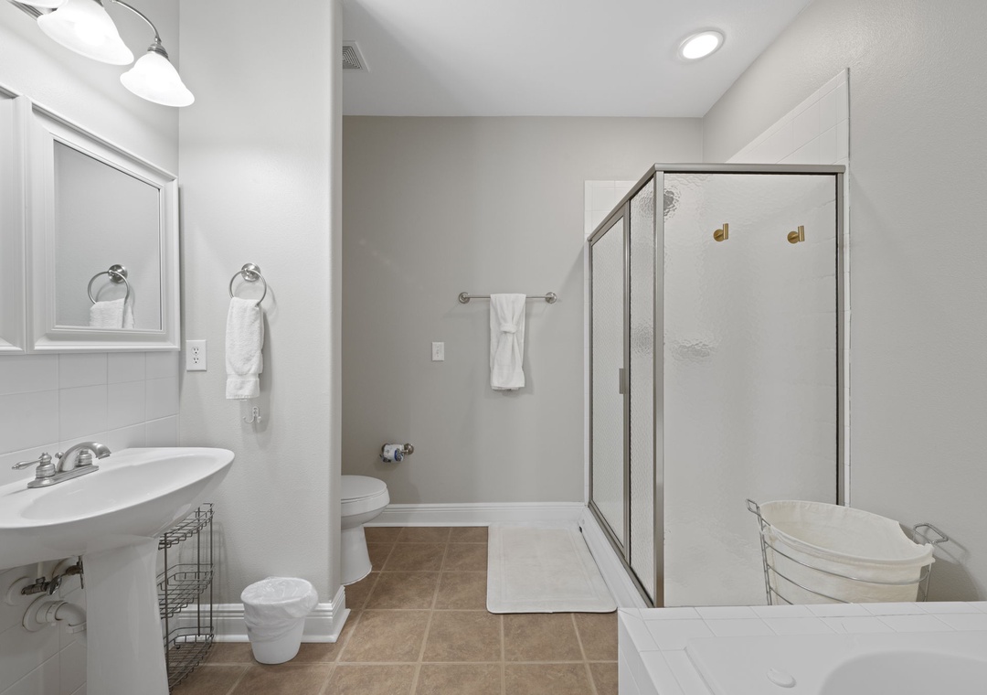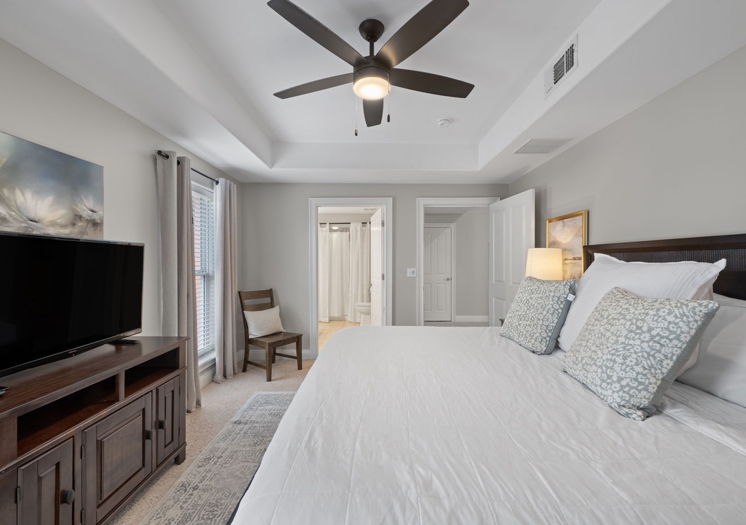 The first-floor main bedroom features a king bed, a flat-screen TV, and direct patio access, along with an en-suite bathroom boasting a large soaking tub and a walk-in shower. The second bedroom offers a cozy queen bed and a flat-screen TV, with a nearby bathroom featuring a shower/tub combo. Upstairs, a cozy loft area with a queen-size Murphy bed and a flat-screen TV provides additional relaxation space. The third bedroom includes a king bed, a flat-screen TV, and access to a third bathroom with a shower/tub combo. For added convenience, a washer and dryer are available, ensuring a comfortable and carefree stay.