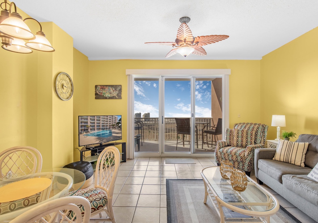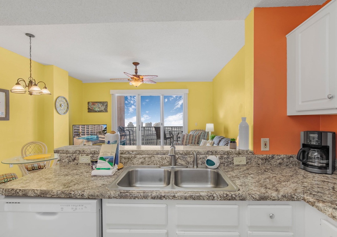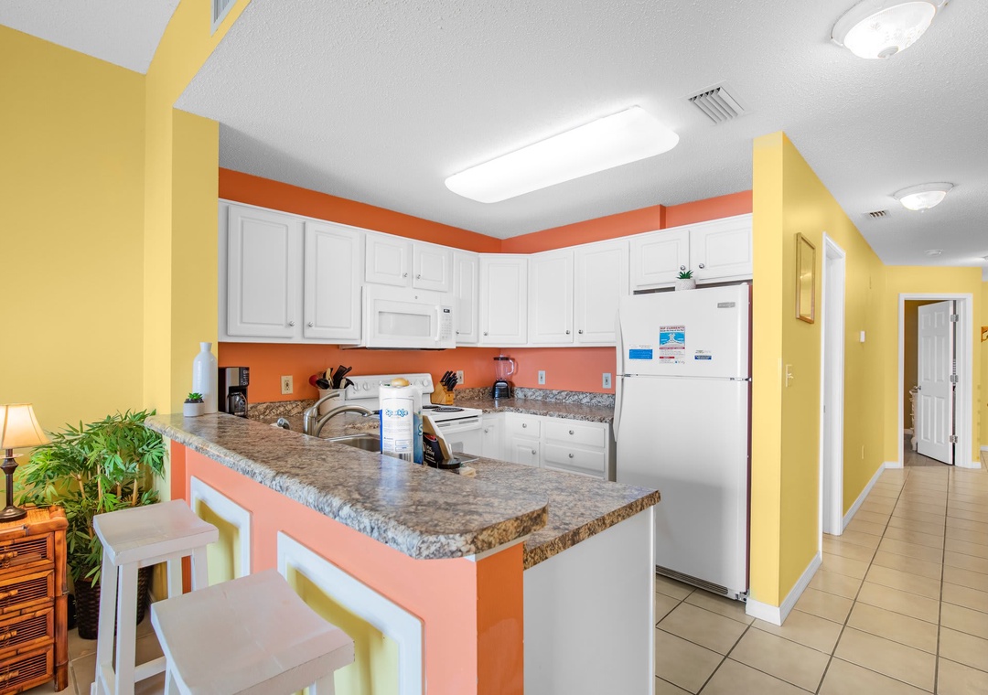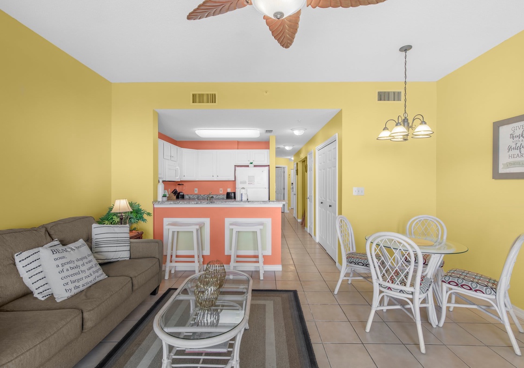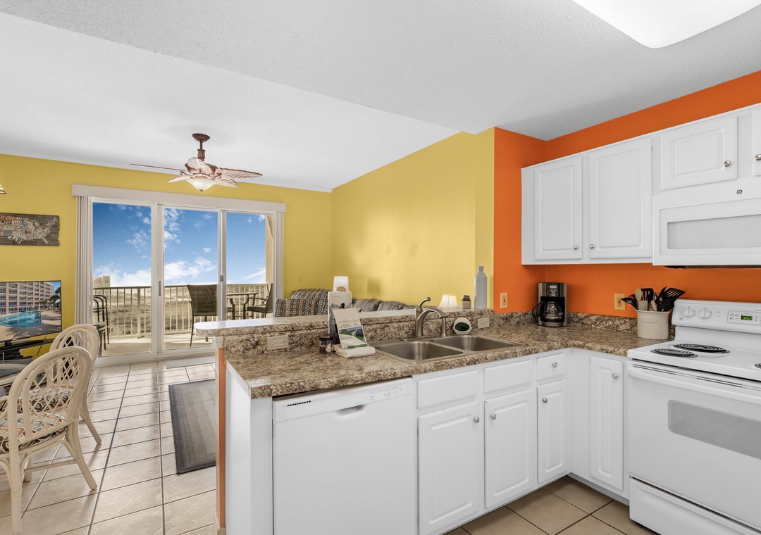An open concept kitchen and living area layout, that has plenty of room for the entire family. Beautiful views streaming in from your own private balcony. The well-equipped kitchen has everything needed to whip up a local seafood dish, stocked with pots/pans/utensils. Enjoy your morning coffee on the private balcony and take in the dazzling views. Relax after a day on the beach in the comfortable living space with a sleeper sofa. The peaceful bedroom features a king-size bed. Bathroom has a shower/tub combo. The hallway has a bunkbed featuring two twin-size beds.