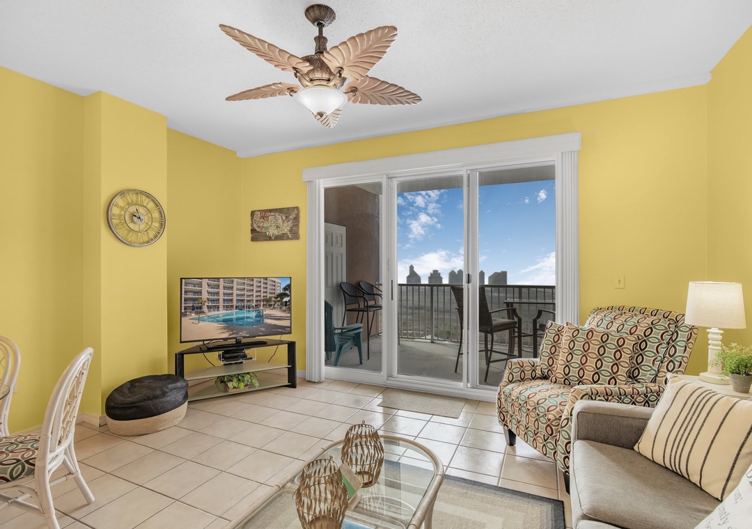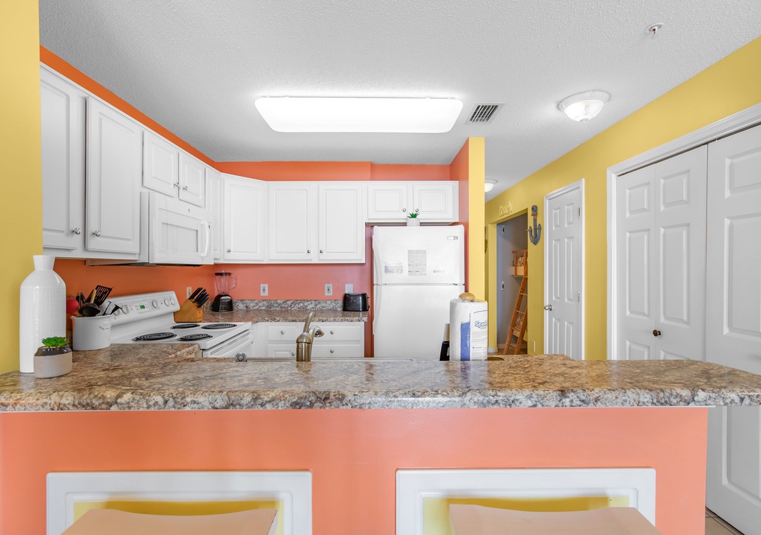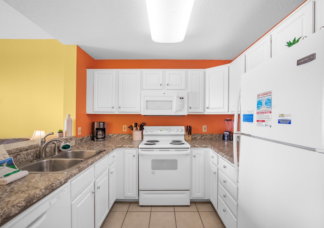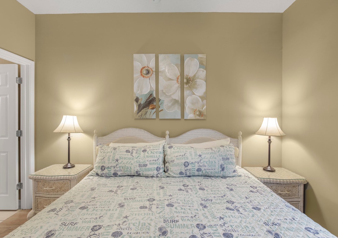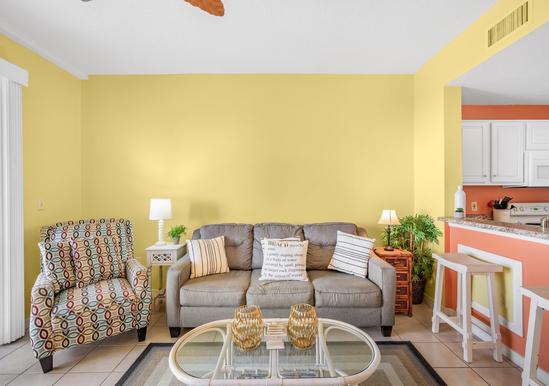 An open concept kitchen and living area layout, that has plenty of room for the entire family. Beautiful views streaming in from your own private balcony. The well-equipped kitchen has everything needed to whip up a local seafood dish, stocked with pots/pans/utensils. Enjoy your morning coffee on the private balcony and take in the dazzling views. Relax after a day on the beach in the comfortable living space with a sleeper sofa. The peaceful bedroom features a king-size bed. Bathroom has a shower/tub combo. The hallway has a bunkbed featuring two twin-size beds.