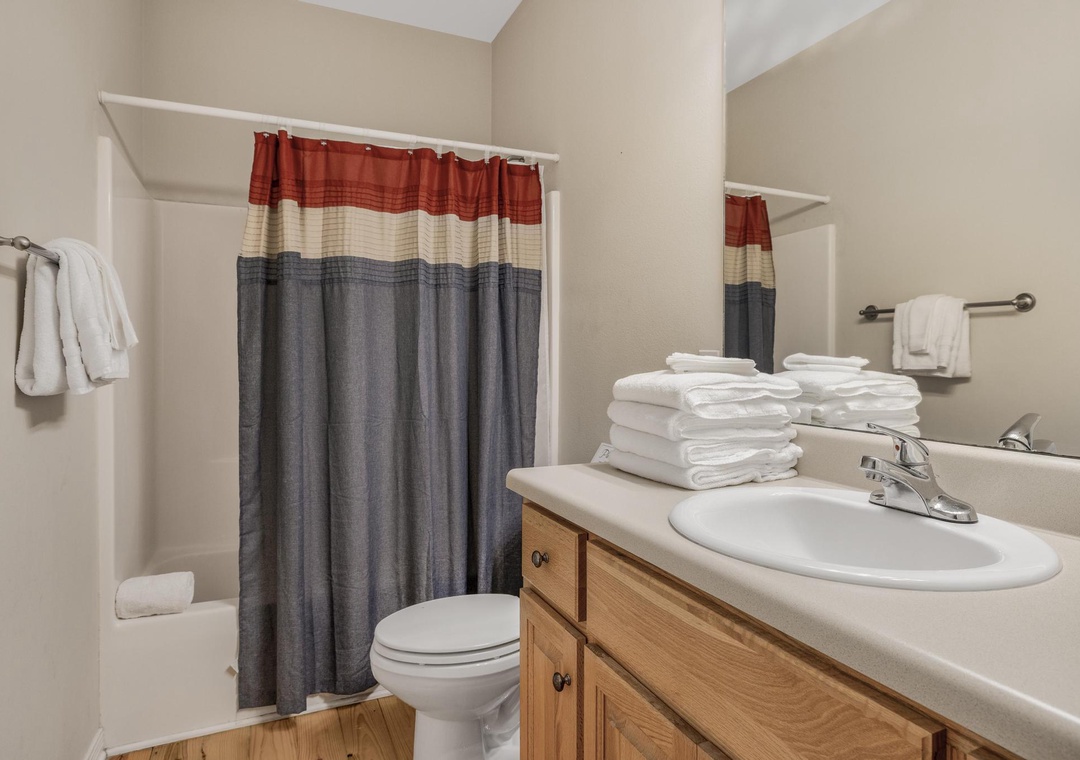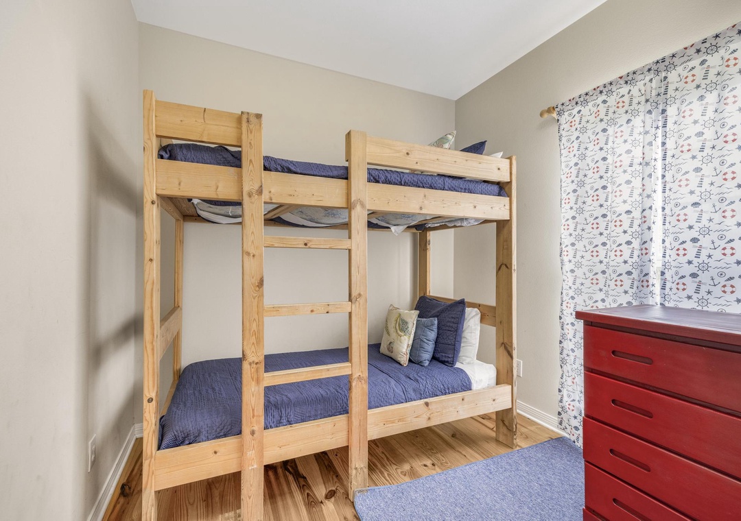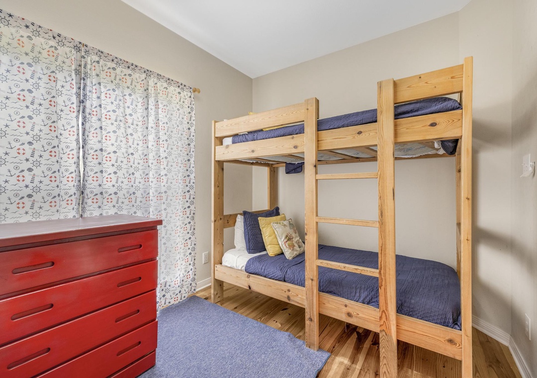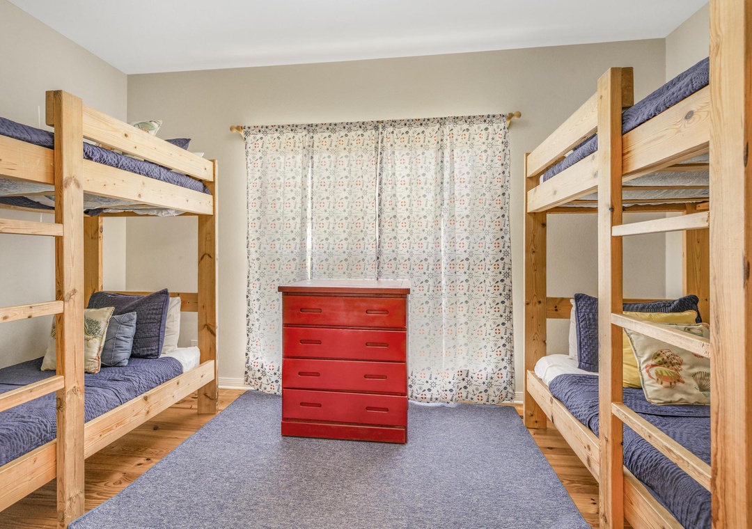 The main bedroom features a queen-size bed. The main bathroom has a tub/shower combo. The second bedroom features a queen-size bed. The second bathroom features a shower/tub combo. The third bedroom has two twin over twin bunkbeds.