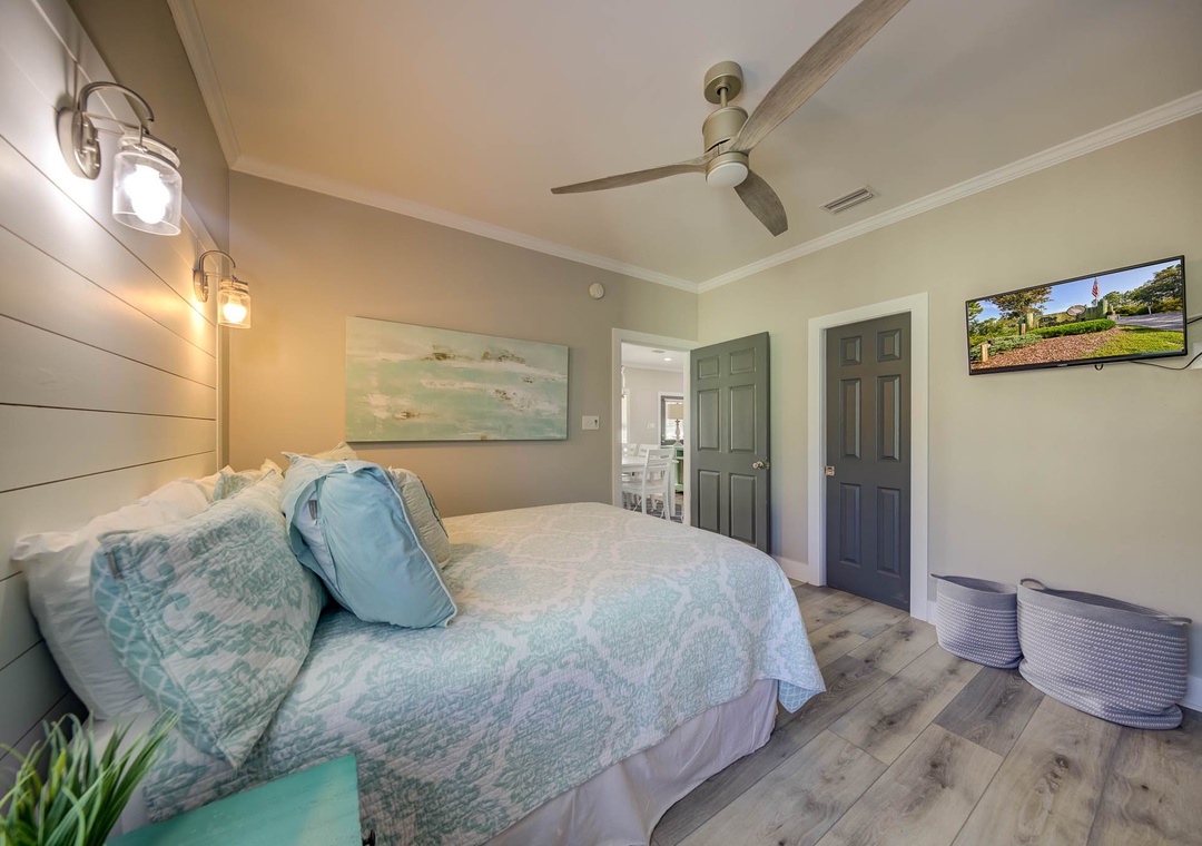 The main bedroom features a king-size bed with flat screen TV. The main bathroom has a dazzling walk-in shower. The second bedroom features a queen-size bed with flat screen TV. The second bathroom features a shower/tub combo. The third bedroom features a queen-size bed.