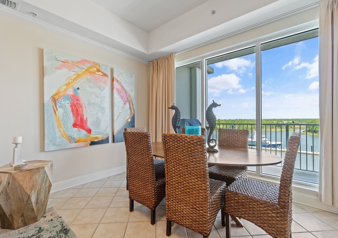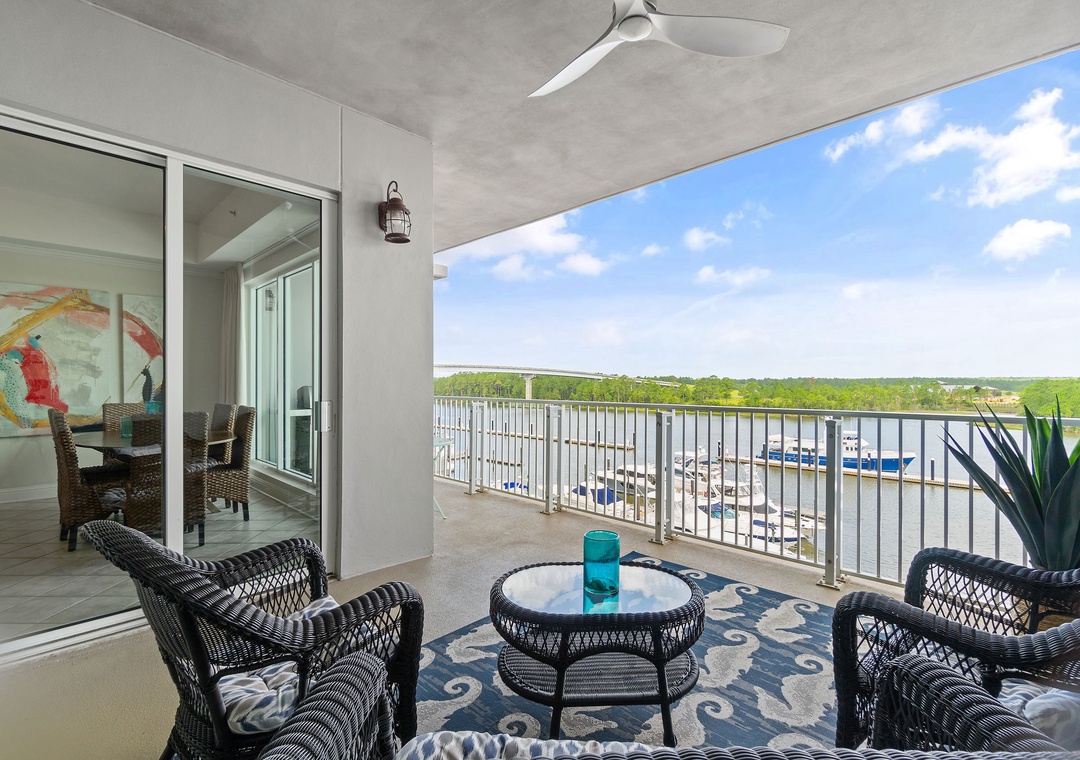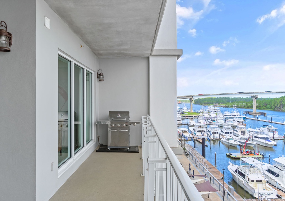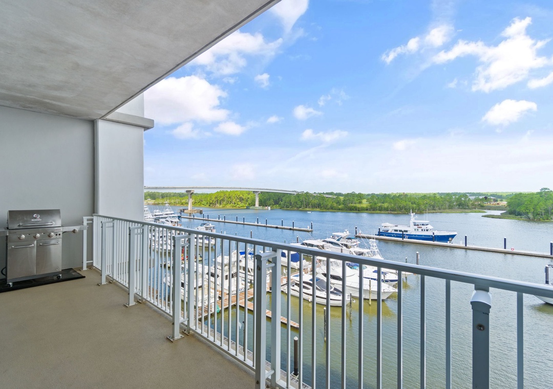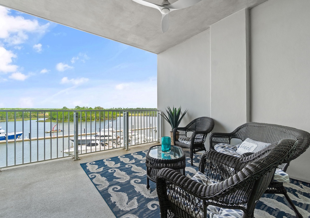 Welcome to The Wharf 403, a coastal two-bedroom, 2-bath condominium. The views from the large covered balcony of the marina and Intracoastal waterway are amazing. The fully appointed kitchen includes stainless steel appliances, granite counter tops, a wine cooler, an automatic ice maker, and a Keurig coffee maker. There is a separate laundry closet with a stackable washer and dryer. Other features include a master bath with an air jet tub, a separate glass-enclosed shower, and double vanities. The balcony is equipped with a natural gas grill for your enjoyment. The living area features a 75" Flat Screen TV.