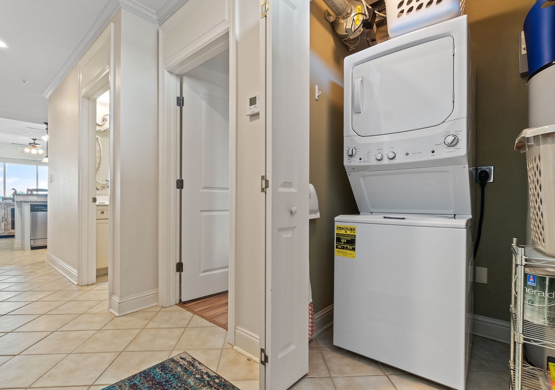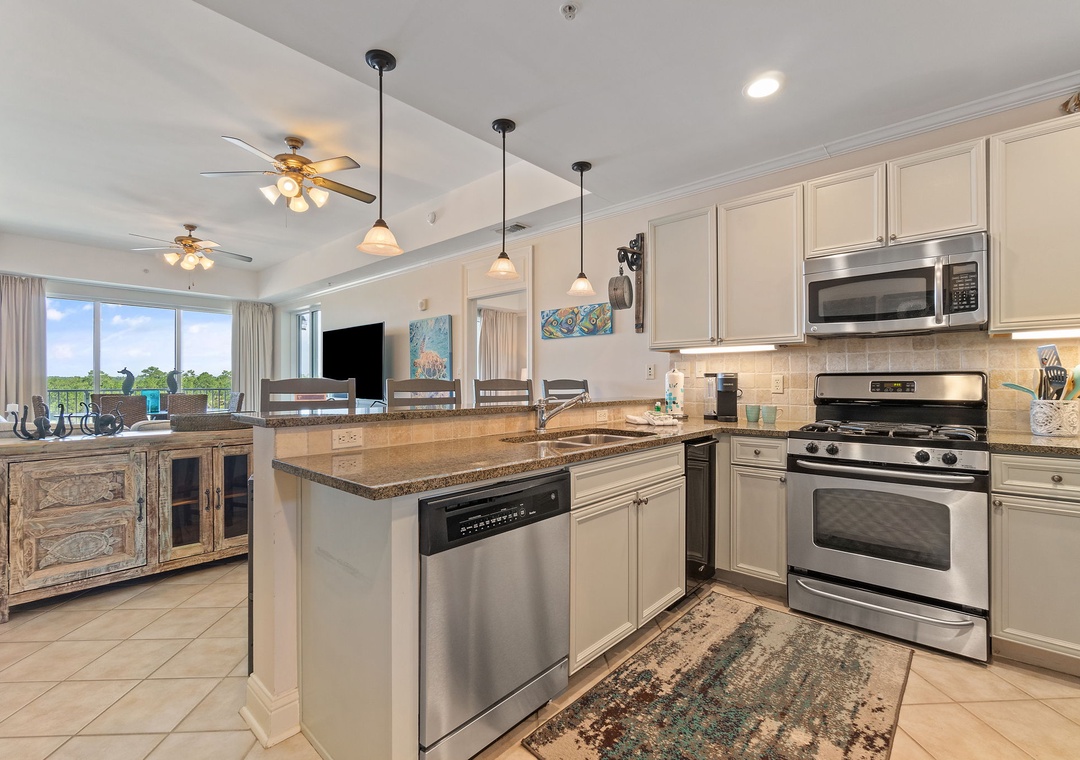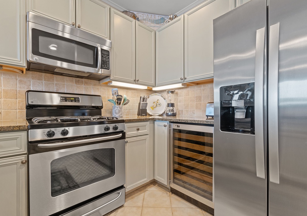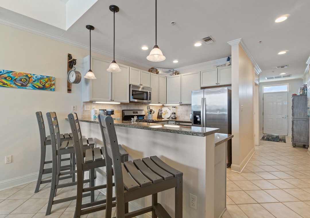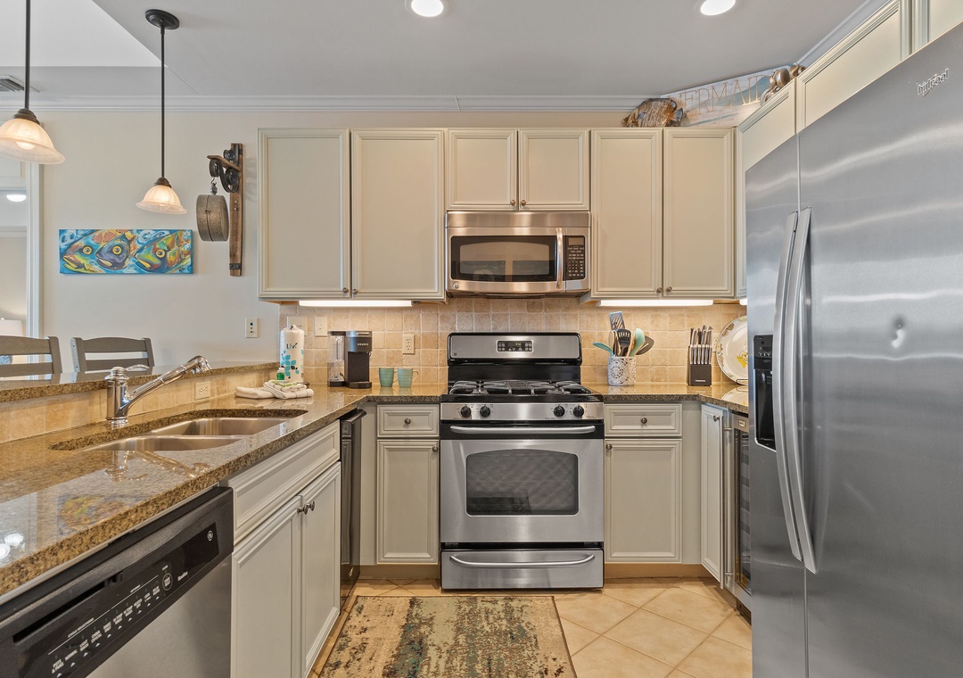 Welcome to The Wharf 403, a coastal two-bedroom, 2-bath condominium. The views from the large covered balcony of the marina and Intracoastal waterway are amazing. The fully appointed kitchen includes stainless steel appliances, granite counter tops, a wine cooler, an automatic ice maker, and a Keurig coffee maker. There is a separate laundry closet with a stackable washer and dryer. Other features include a master bath with an air jet tub, a separate glass-enclosed shower, and double vanities. The balcony is equipped with a natural gas grill for your enjoyment. The living area features a 75" Flat Screen TV.