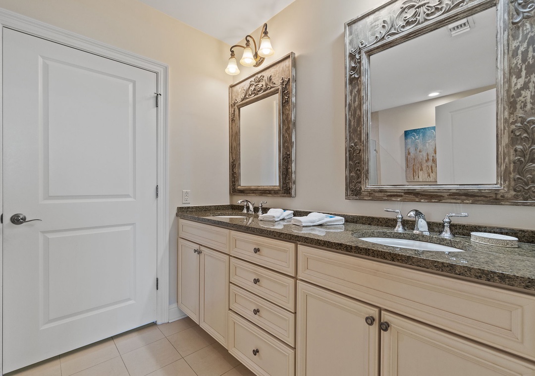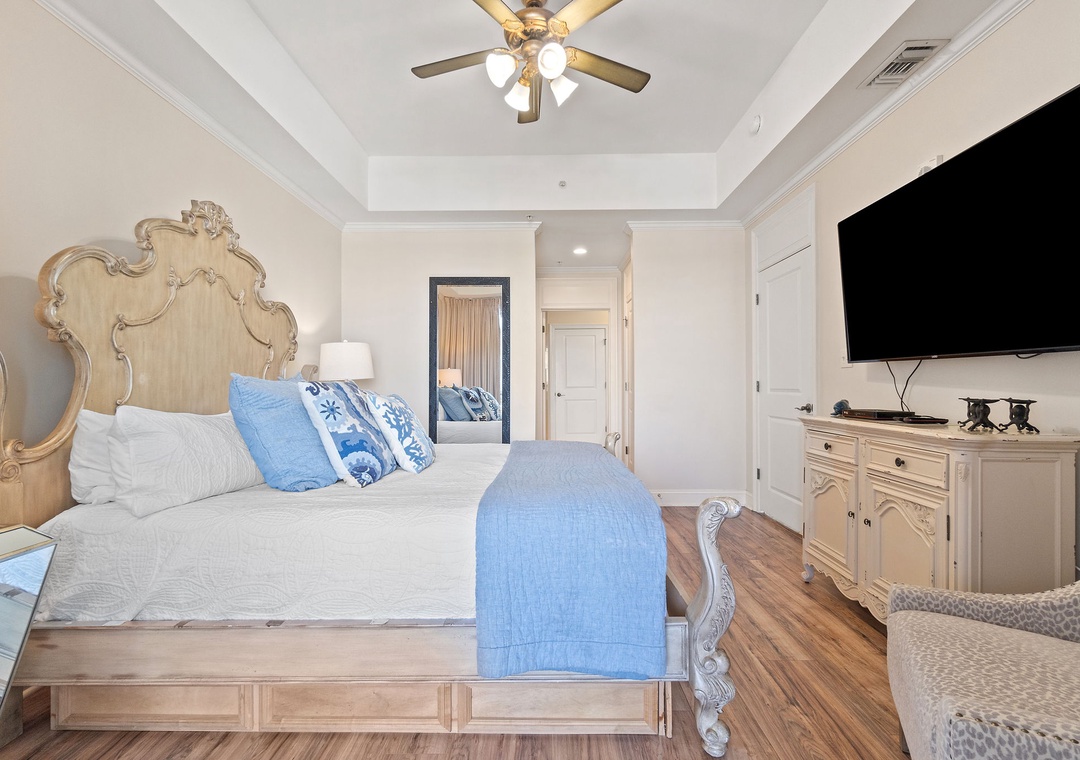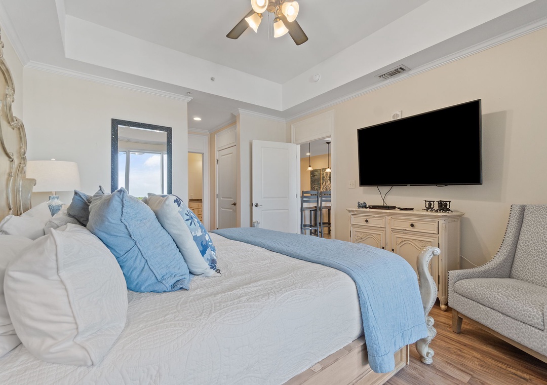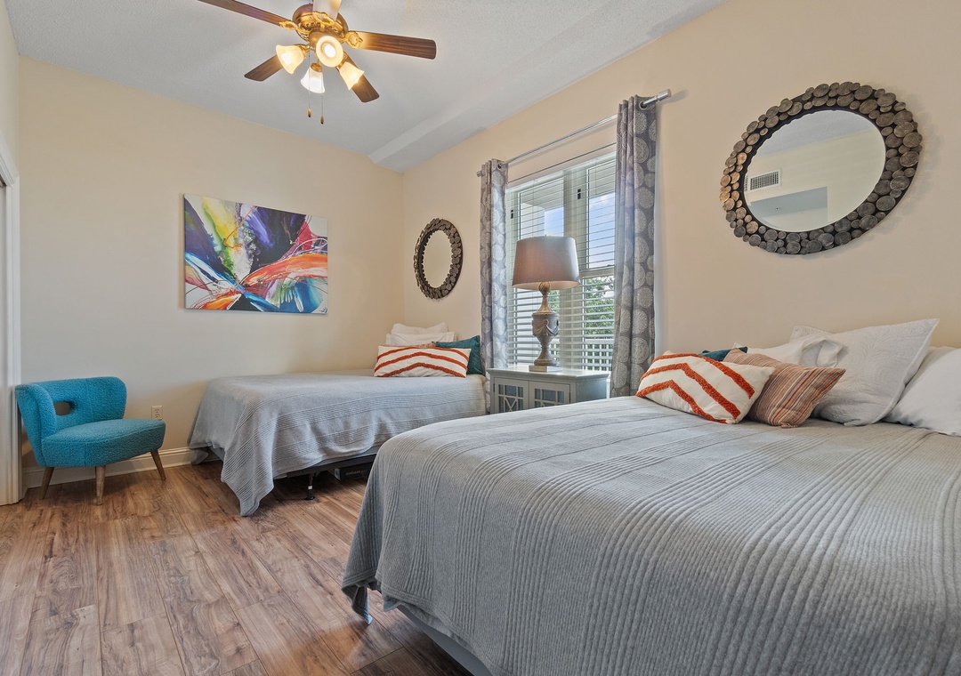 The main bedroom has a king bed with an ensuite bathroom featuring a double vanity, a garden jacuzzi tub, and a walk-in shower. The guest bedroom has two queen beds. The hallway bathroom features a walk-in shower. Come make lifelong memories at The Wharf 403!