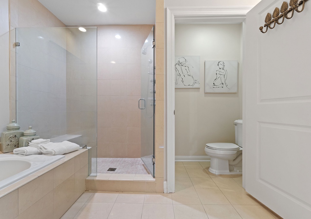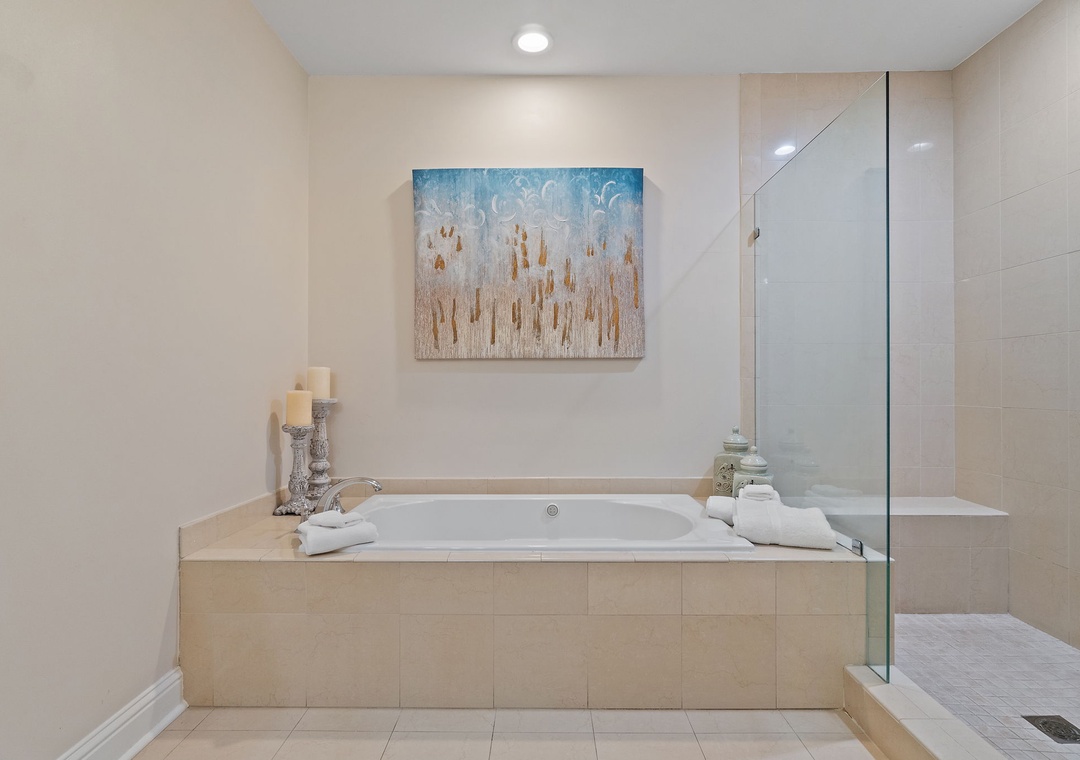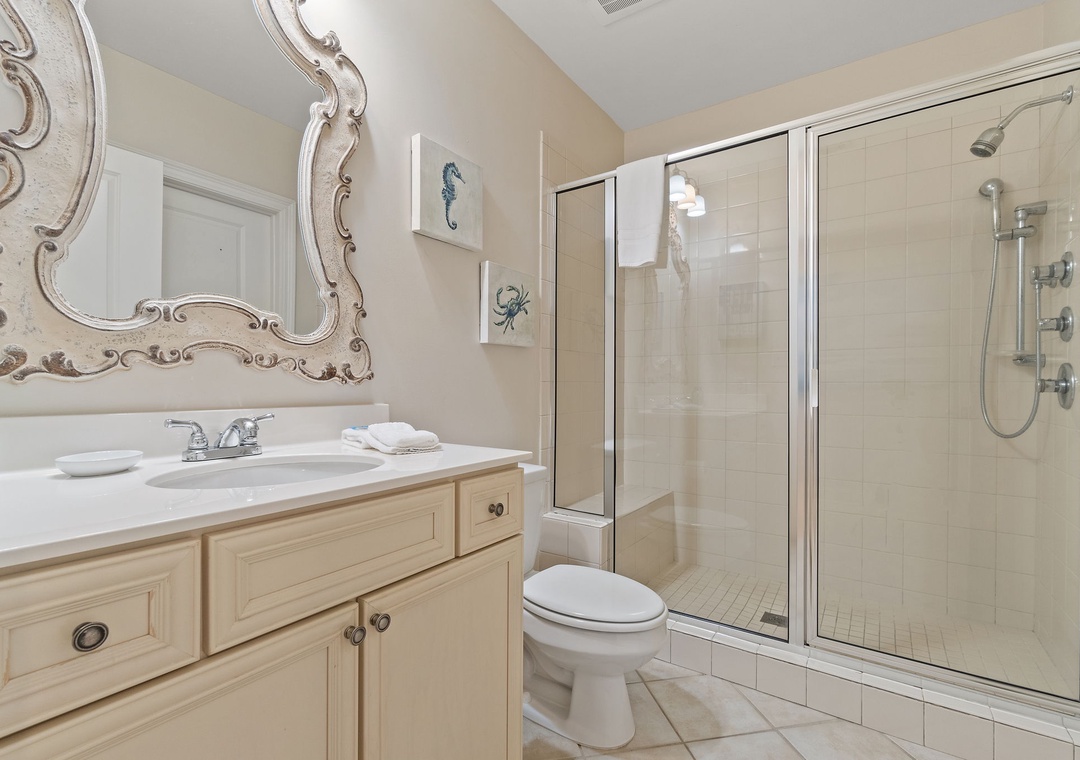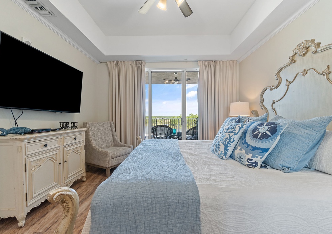 The main bedroom has a king bed with an ensuite bathroom featuring a double vanity, a garden jacuzzi tub, and a walk-in shower. The guest bedroom has two queen beds. The hallway bathroom features a walk-in shower. Come make lifelong memories at The Wharf 403!