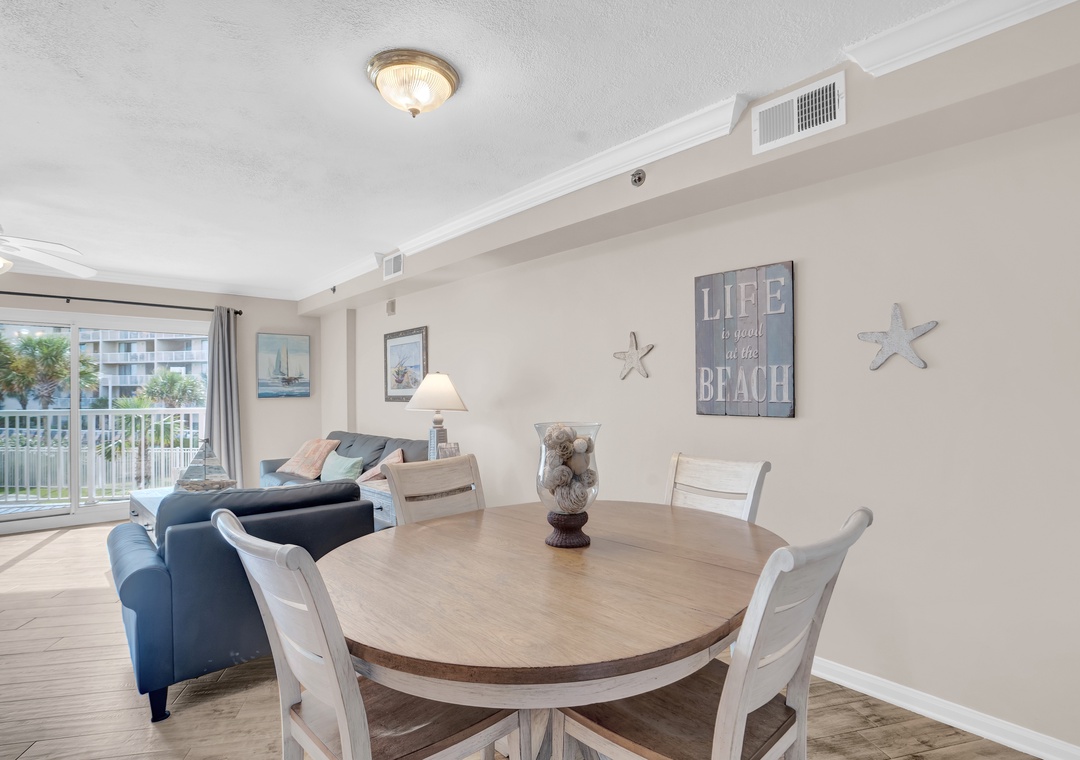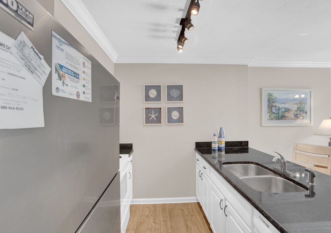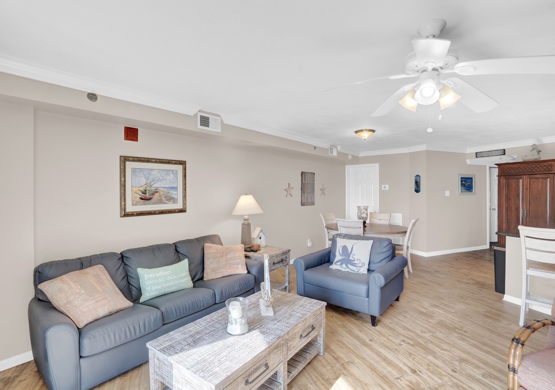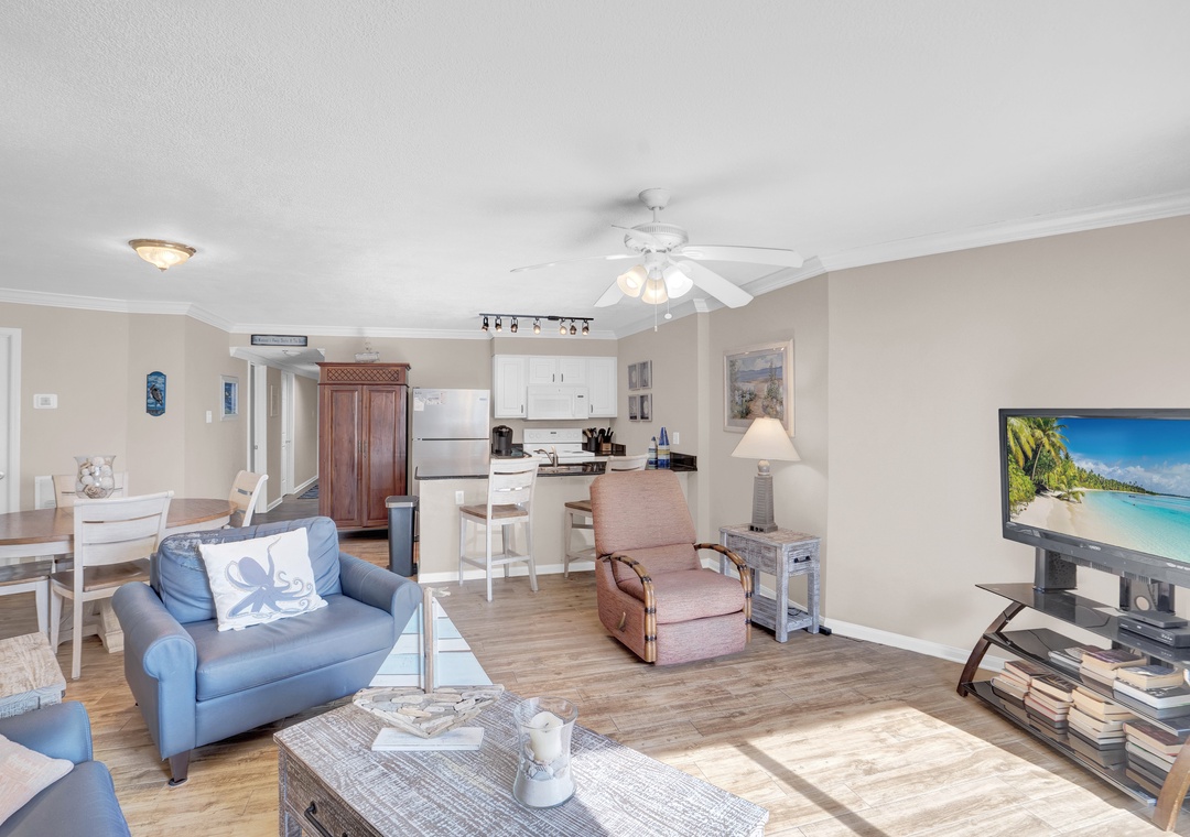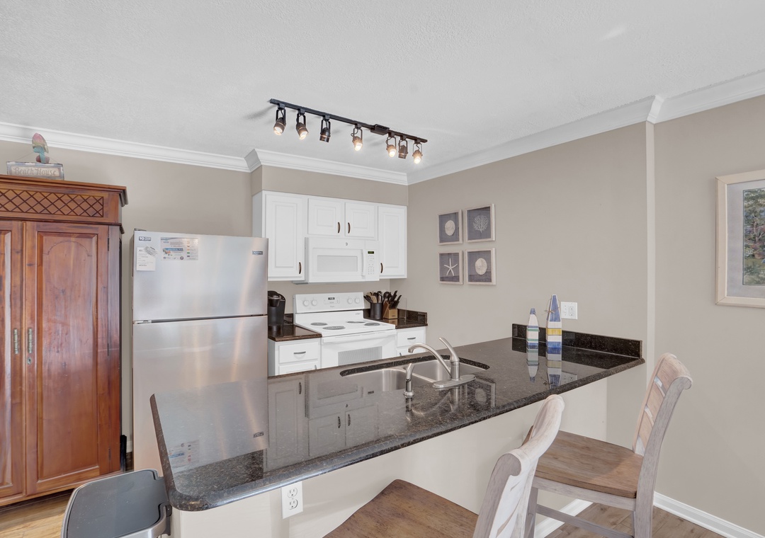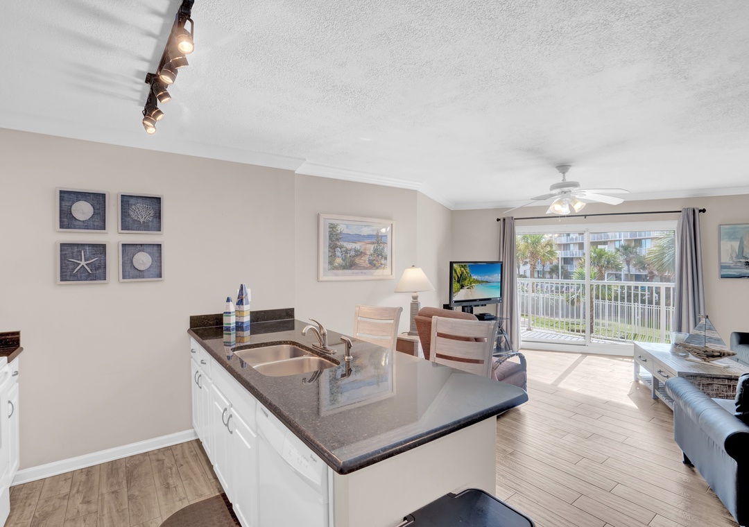 The open living area is warm and inviting, with coastal-inspired décor and wood plank flooring throughout. Step into the fully equipped kitchen, where granite countertops and modern appliances provide everything you need to prepare delicious meals or beachside snacks. Whether you're whipping up breakfast or enjoying a home-cooked dinner, you'll feel right at home.