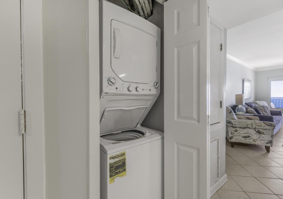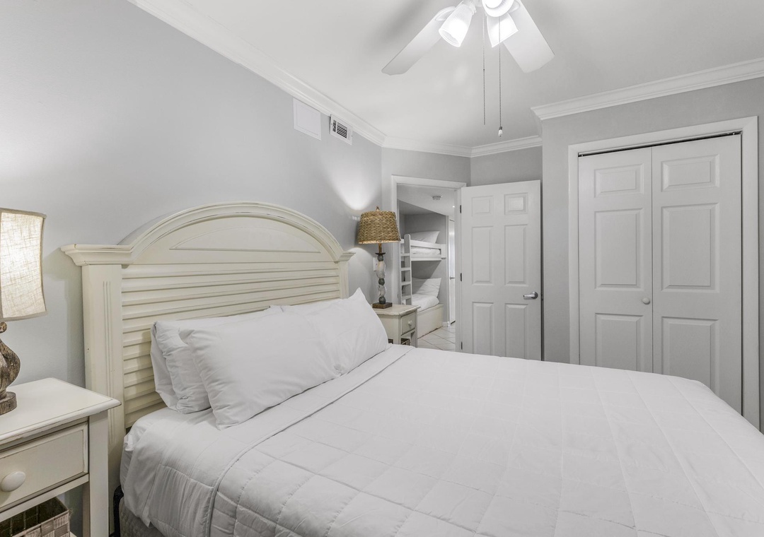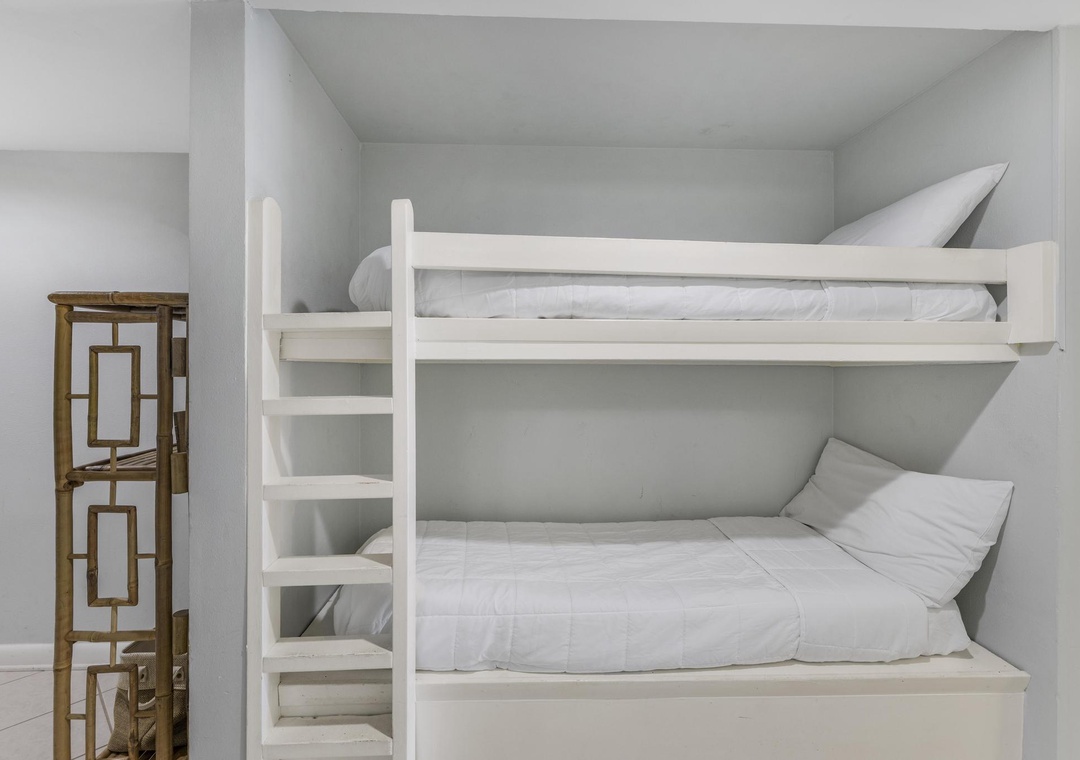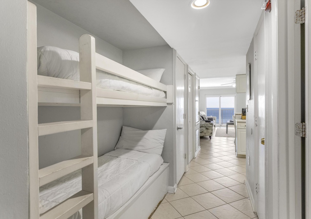Inside, you'll be welcomed by a bright and inviting living area that makes you feel right at home. The cozy sofa converts into a bed for sleeping. Step out onto the balcony for a cup of coffee or a sunset drink while soaking in the Gulf views and fresh air. The fully-equipped kitchen is ready for your culinary creations. Enjoy meals at the dining table for 4. The bedroom features a queen-size bed and the bathroom has a tub/shower combo. The hallway bunk beds are a hit with kids! You’ll also have the convenience of a washer and dryer to keep everything fresh during your stay.