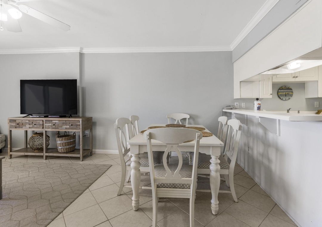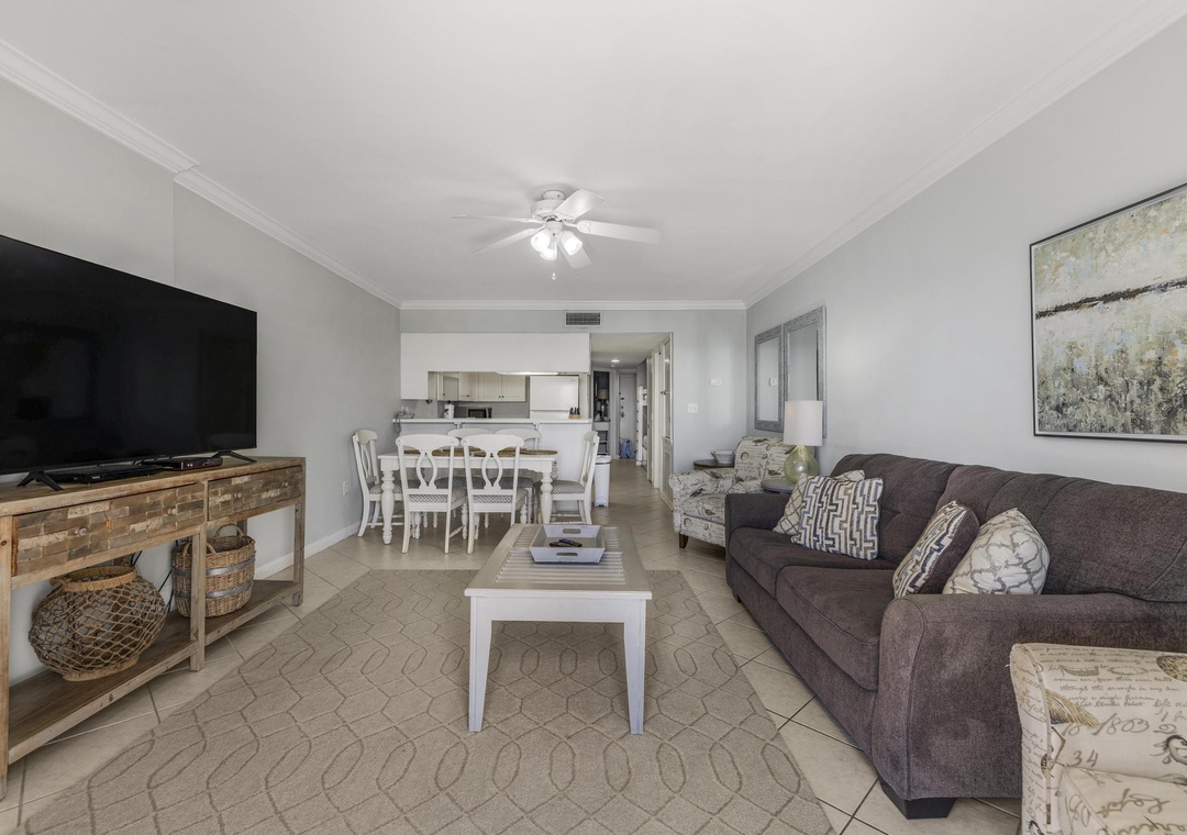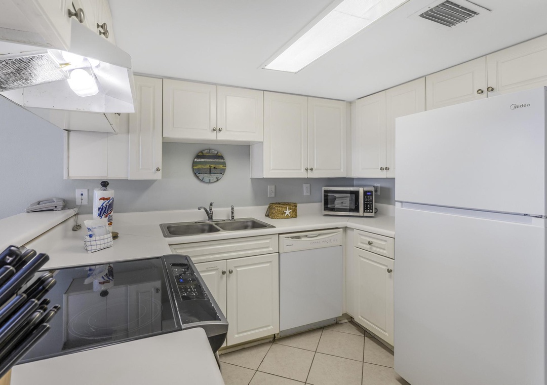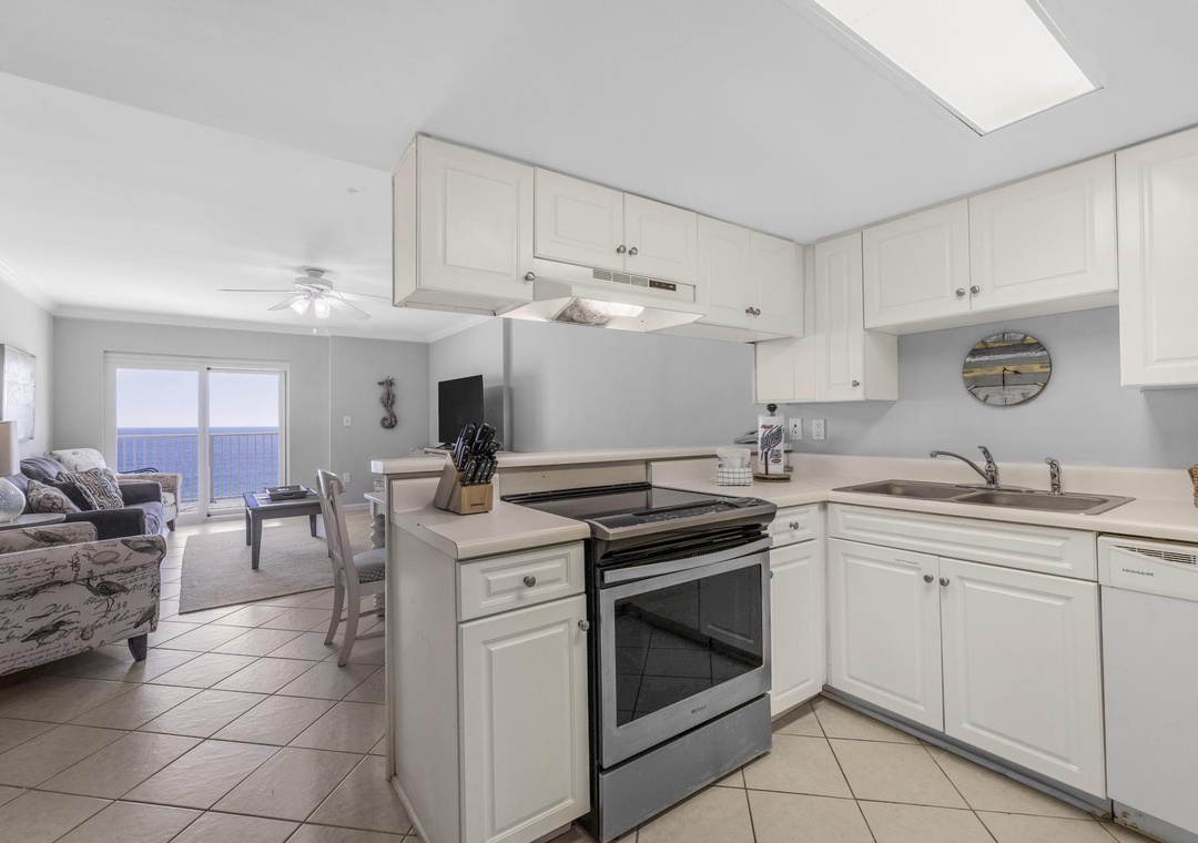 Inside, you'll be welcomed by a bright and inviting living area that makes you feel right at home. The cozy sofa converts into a bed for sleeping. Step out onto the balcony for a cup of coffee or a sunset drink while soaking in the Gulf views and fresh air. The fully-equipped kitchen is ready for your culinary creations. Enjoy meals at the dining table for 4. The bedroom features a queen-size bed and the bathroom has a tub/shower combo. The hallway bunk beds are a hit with kids! You’ll also have the convenience of a washer and dryer to keep everything fresh during your stay.