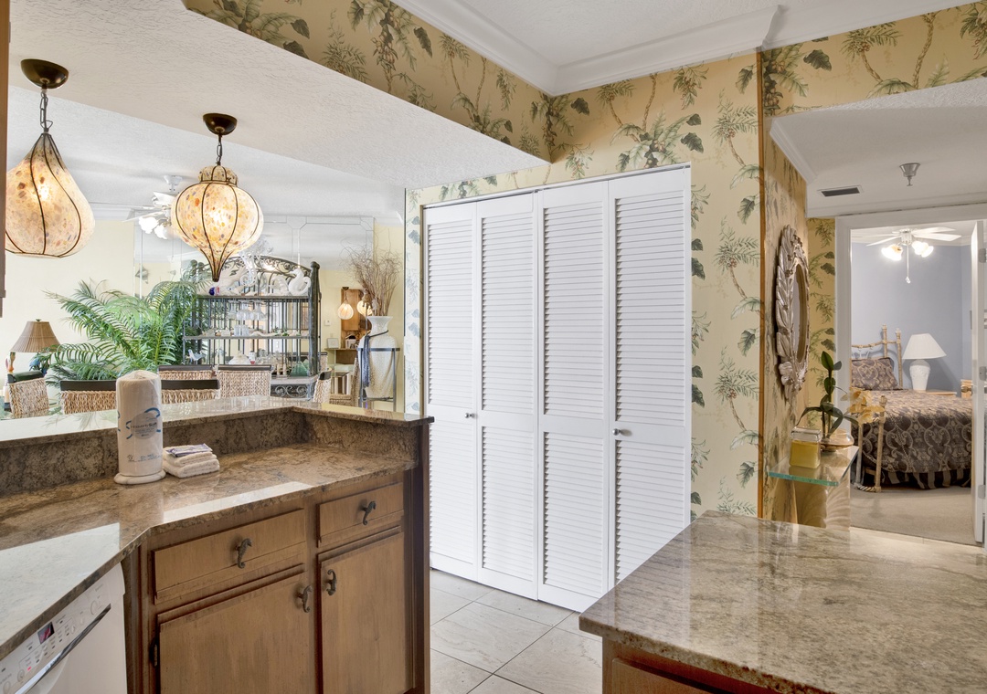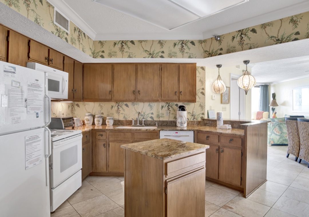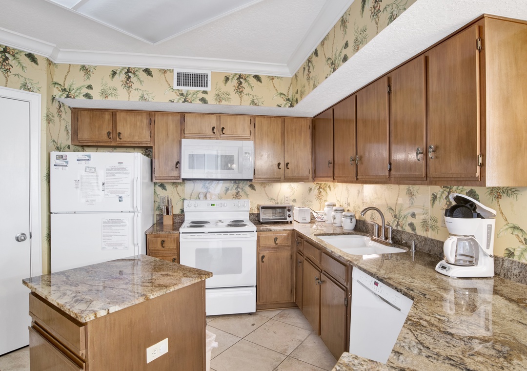 The Primary suite serves as a serene sanctuary with a plush King bed, flat-screen TV, direct balcony access, and an ensuite bath that promises relaxation after a day at the beach. The second bedroom also features a King bed, while the third offers a cozy Queen bed, with both guest rooms equipped with flat-screen TVs to ensure everyone has a private retreat. A fully equipped kitchen makes meal preparation a delight with granite countertops, a stylish backsplash, and all the essentials you need. Additional conveniences like a full-sized washer and dryer and tile flooring throughout enhance the condo’s fresh coastal feel, ensuring White Caps 1502 is the perfect home base for your Orange Beach getaway.