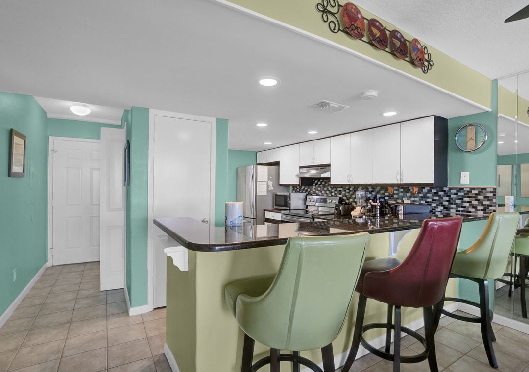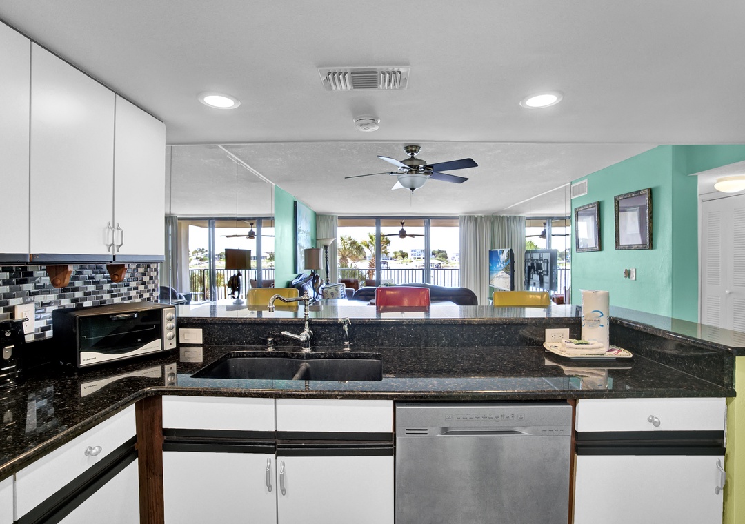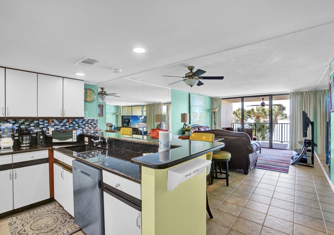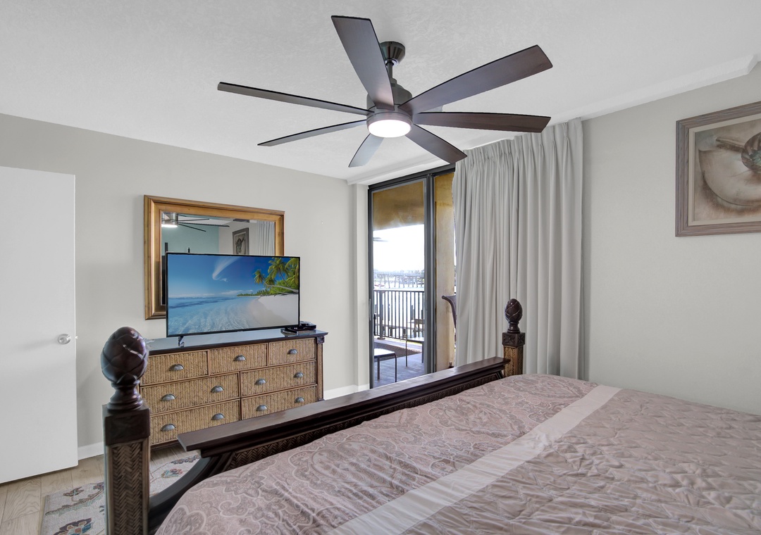 Situated on the 1st floor of the North Tower, this beautifully appointed condo offers an open floor plan living area where stunning views of Old River Bay serve as the perfect backdrop for your vacation. The living room provides plenty of seating, a flat-screen TV, and balcony access. A fully equipped kitchen with granite countertops and stainless steel appliances makes meal prep easy, while a full-sized washer and dryer adds convenience during your stay. Guests will also enjoy free wireless internet throughout the condo.