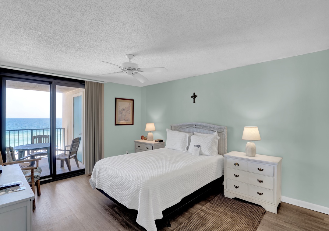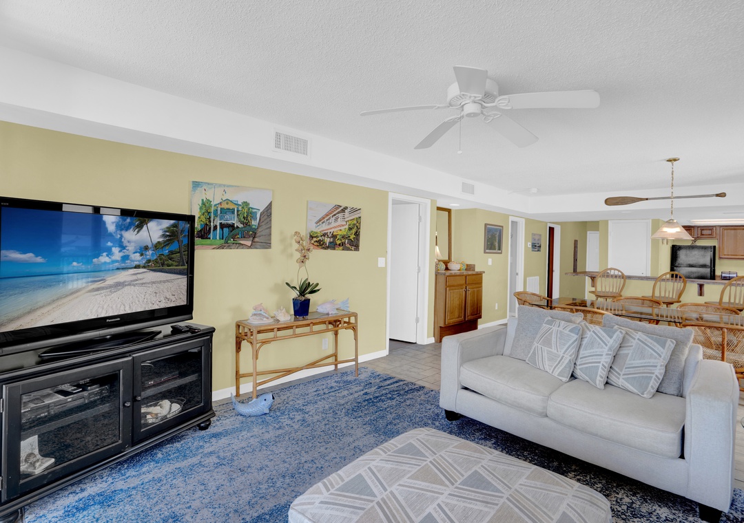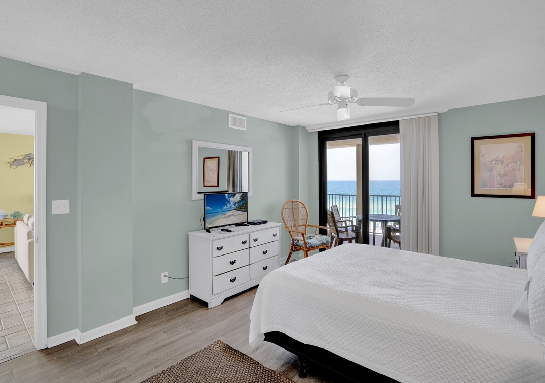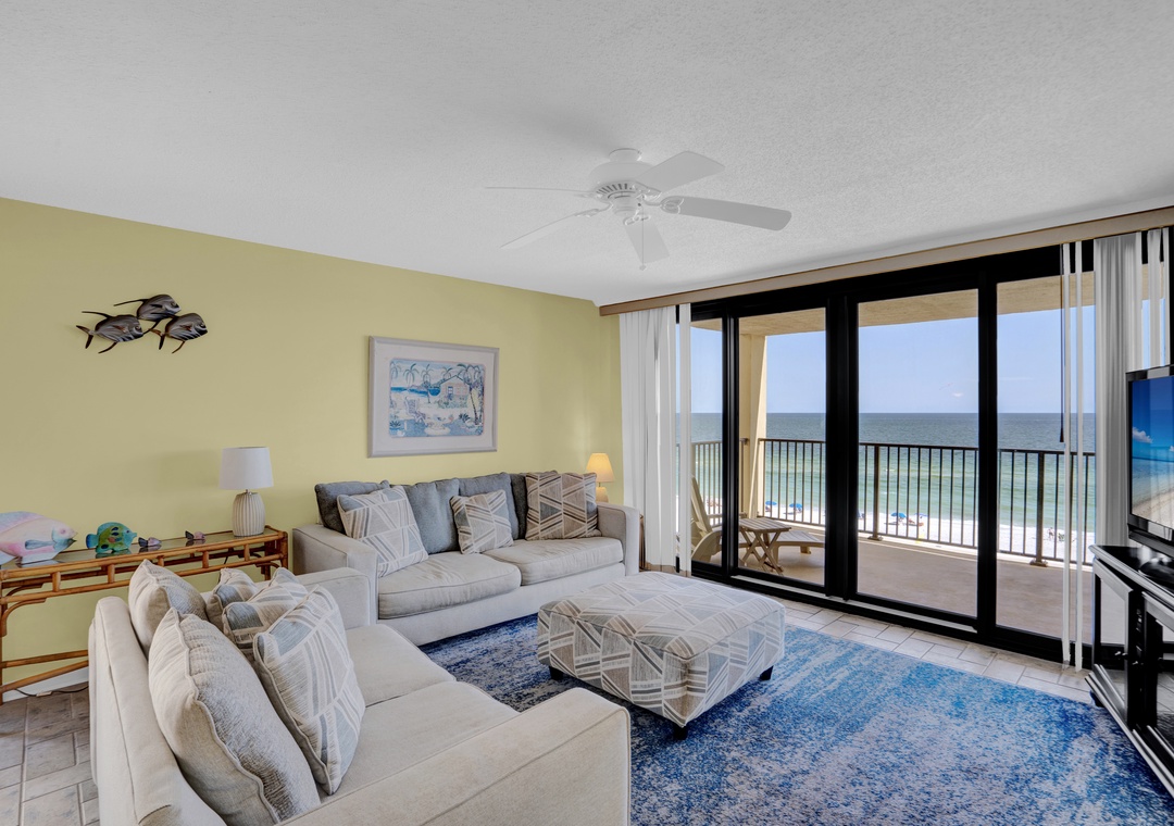 Located on the 5th floor of the East Tower, this condo showcases picturesque views of the Gulf from its open floor plan living area. The Primary suite includes a private bath, flat-screen TV, and balcony access where you can savor the fresh breeze and panoramic coastal views. The second bedroom also features a Queen bed with its own private bath, while the third bedroom offers two Twin beds, ideal for additional guests or family members. Flat-screen TVs in the living room and bedrooms provide entertainment for all, while free wireless internet keeps you connected.