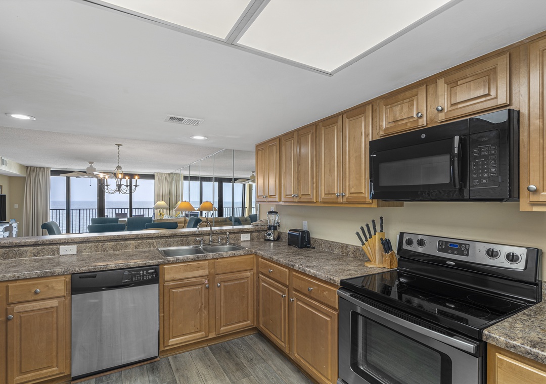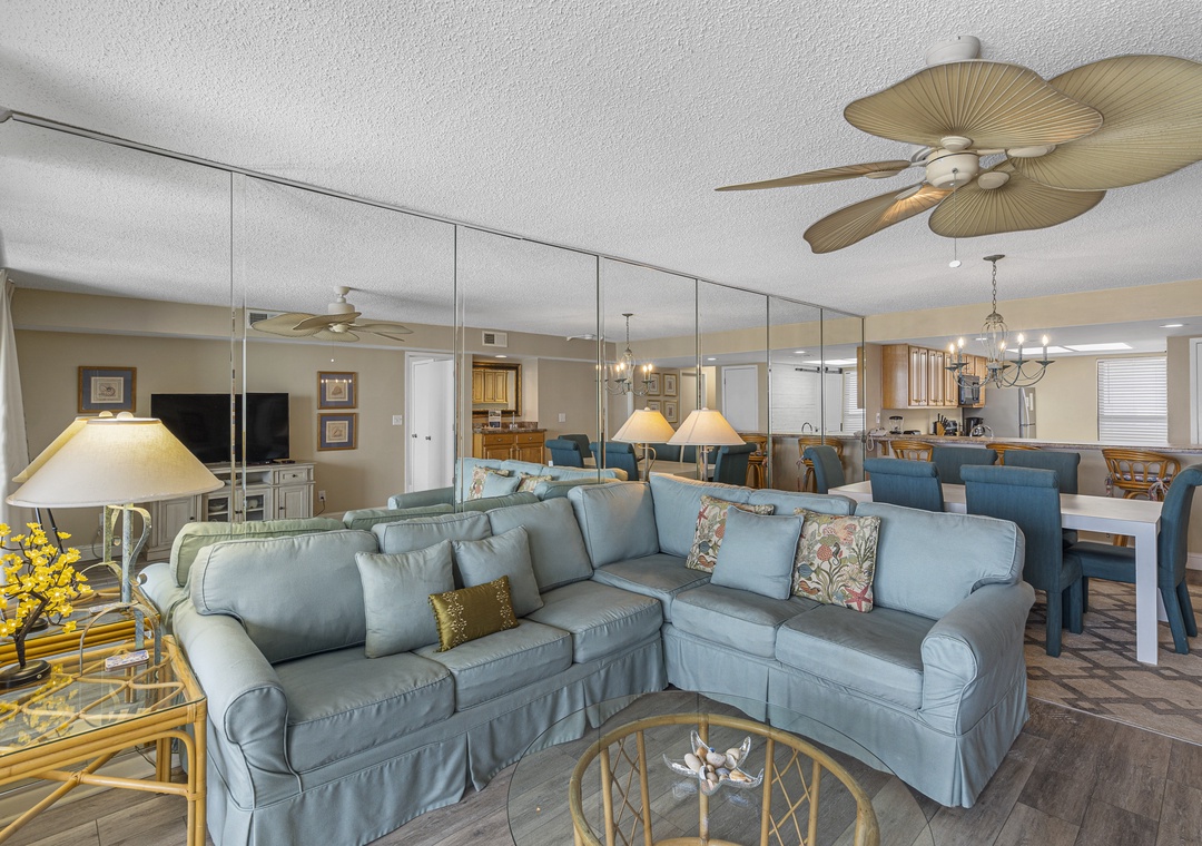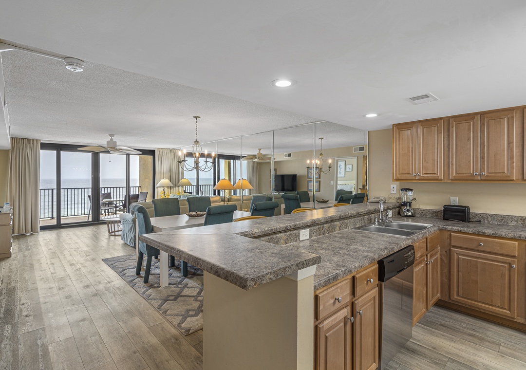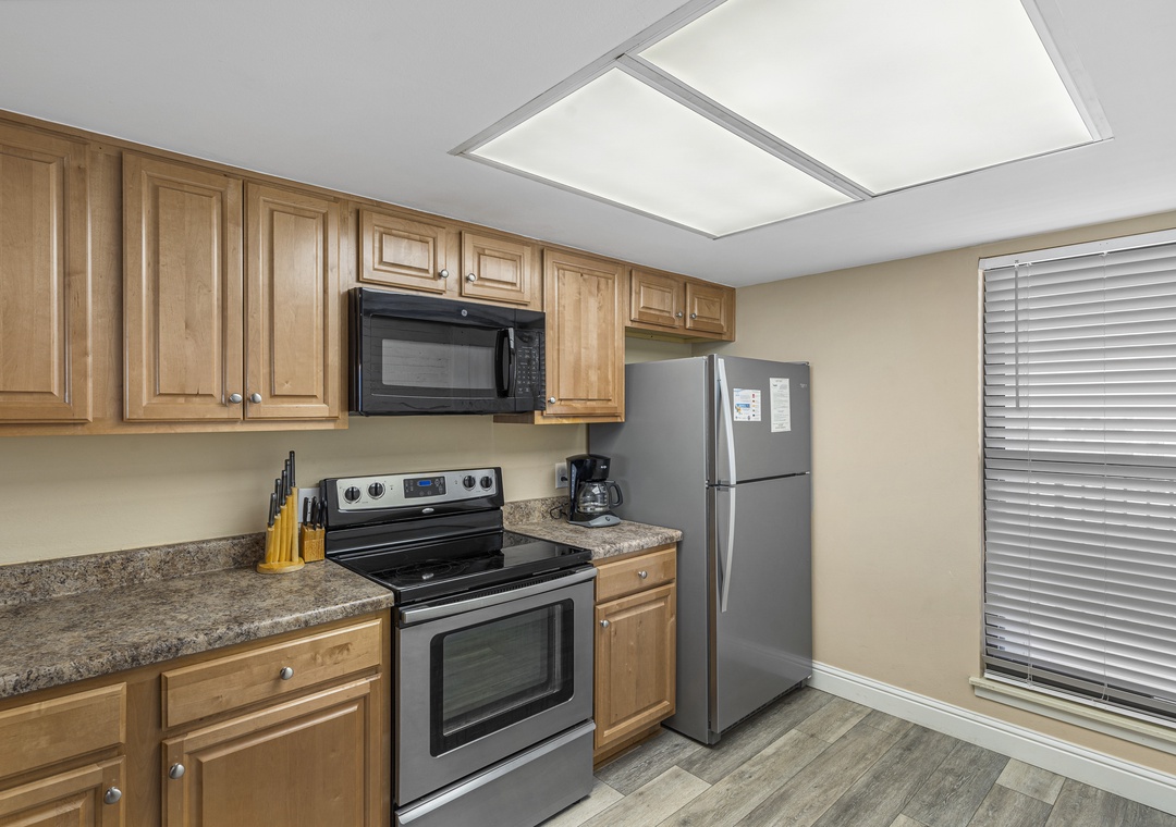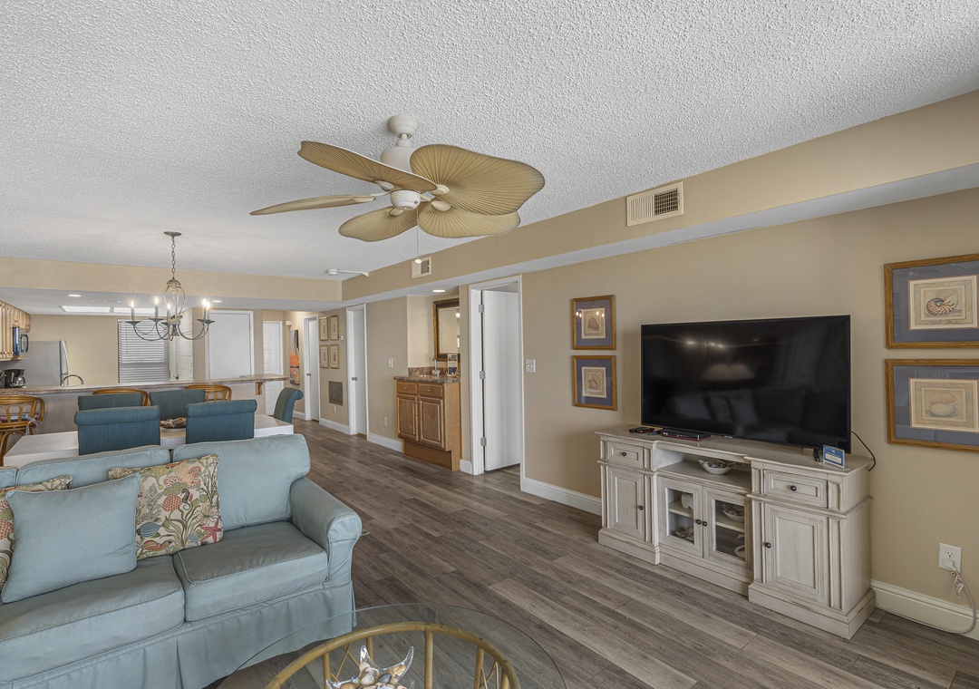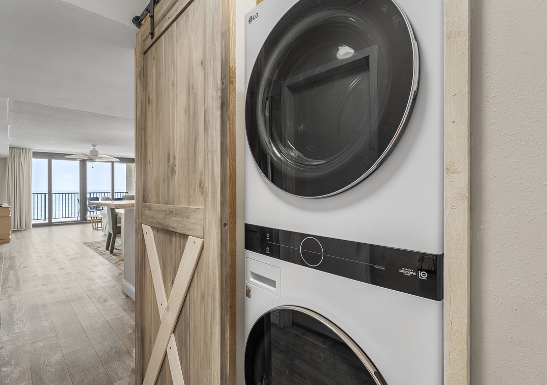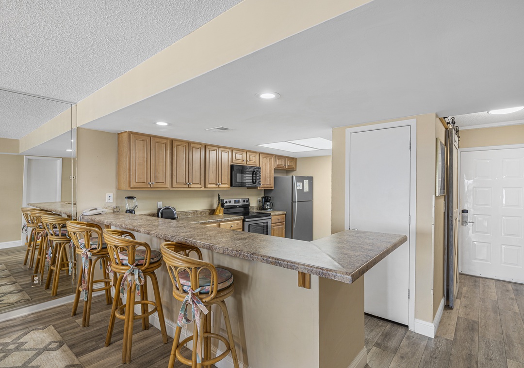 The living room is the perfect place to gather with a 55-inch flat-screen TV, plenty of seating, and access to free wireless internet for streaming, browsing, or sharing vacation memories. The fully equipped kitchen includes stainless steel appliances, a convenient wet bar, and everything you need for in-home dining. An LG stackable washer and dryer set provides additional convenience during your stay.